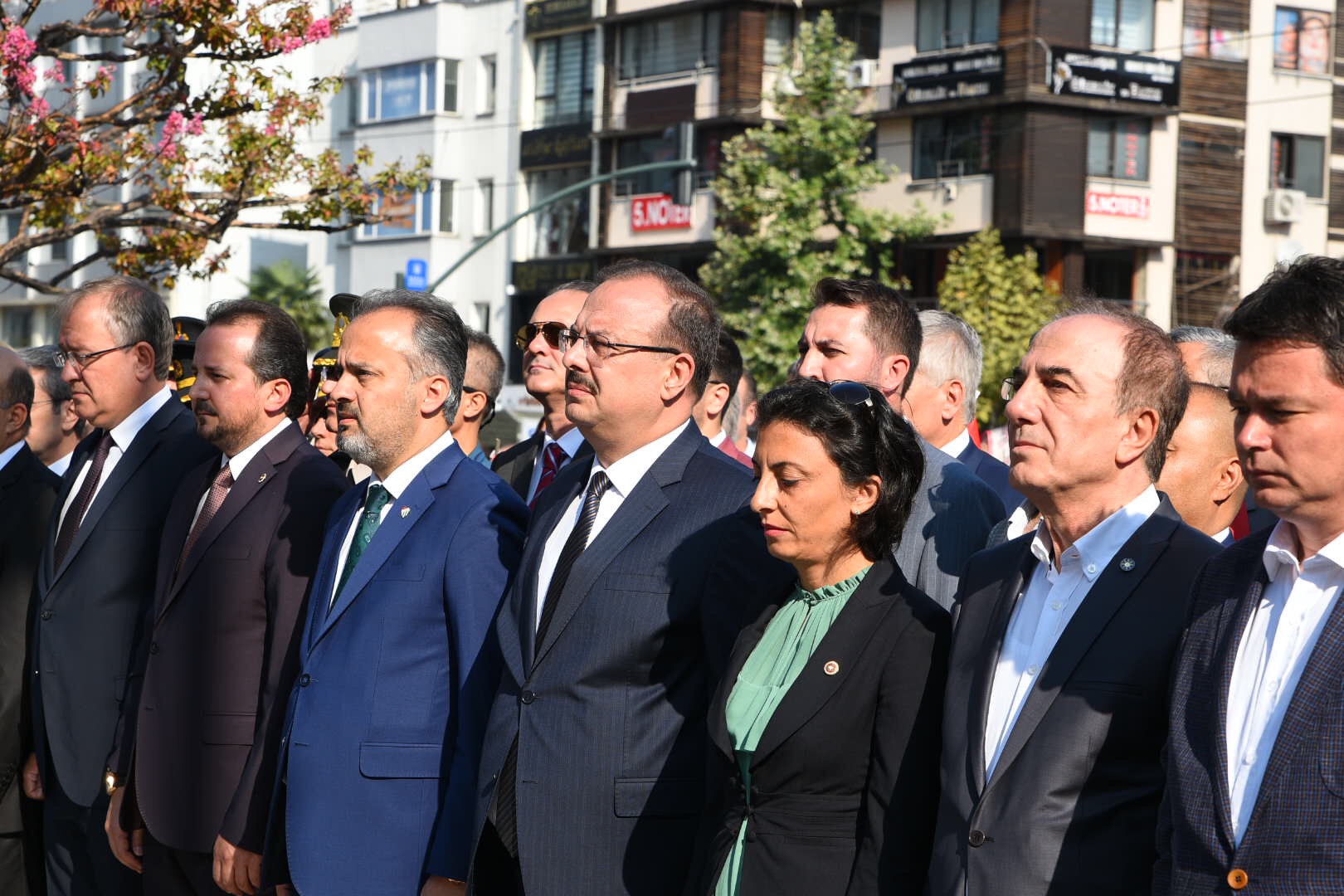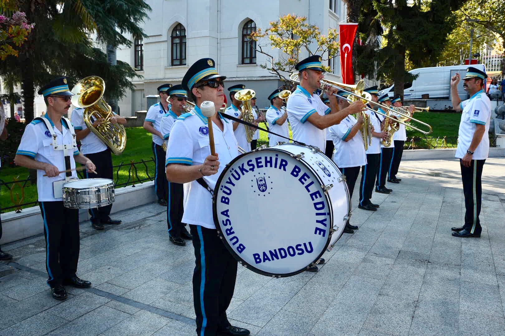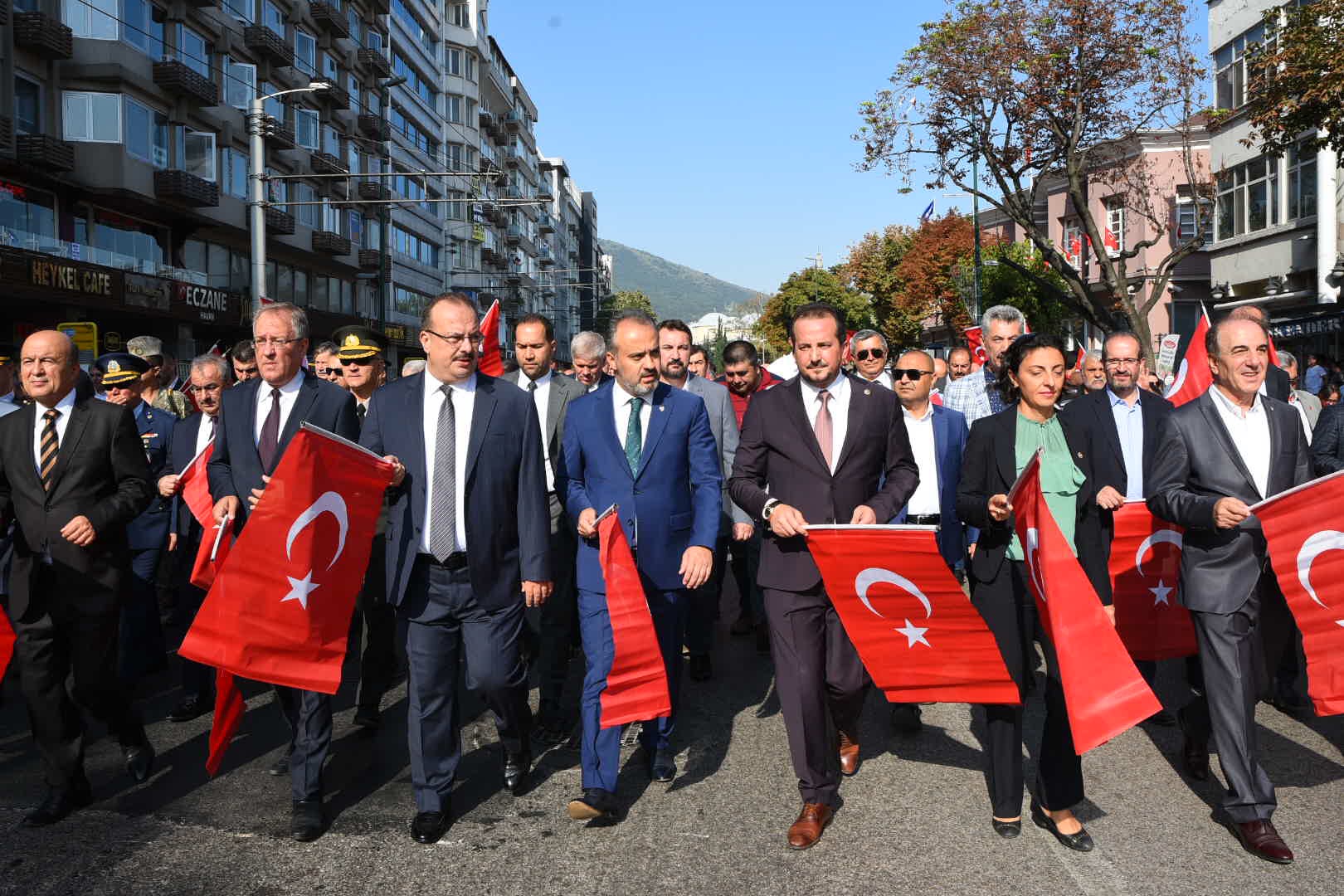 Bursa Büyükşehir Belediye Bandosu ve Bursa Mehter Takımı eşliğinde gerçekleşen yürüyüşe, vatandaşlar da yoğun ilgi gösterdi. Türkiye Muharip Gaziler Derneği Bursa Şubesi üyelerinin de katıldığı kortejde, 7’den 70’e tüm Bursalılar, ellerindeki Türk bayraklarıyla coşkuya ortak oldu. Kortejin ardından Vali Canbolat ve Başkan Aktaş, Atatürk Anıtı’na çelenk koydu. Saygı duruşu ve İstiklal Marşı’nın okunmasının ardından da tören, Bursa Kent Müzesi amfi tiyatroda devam etti.