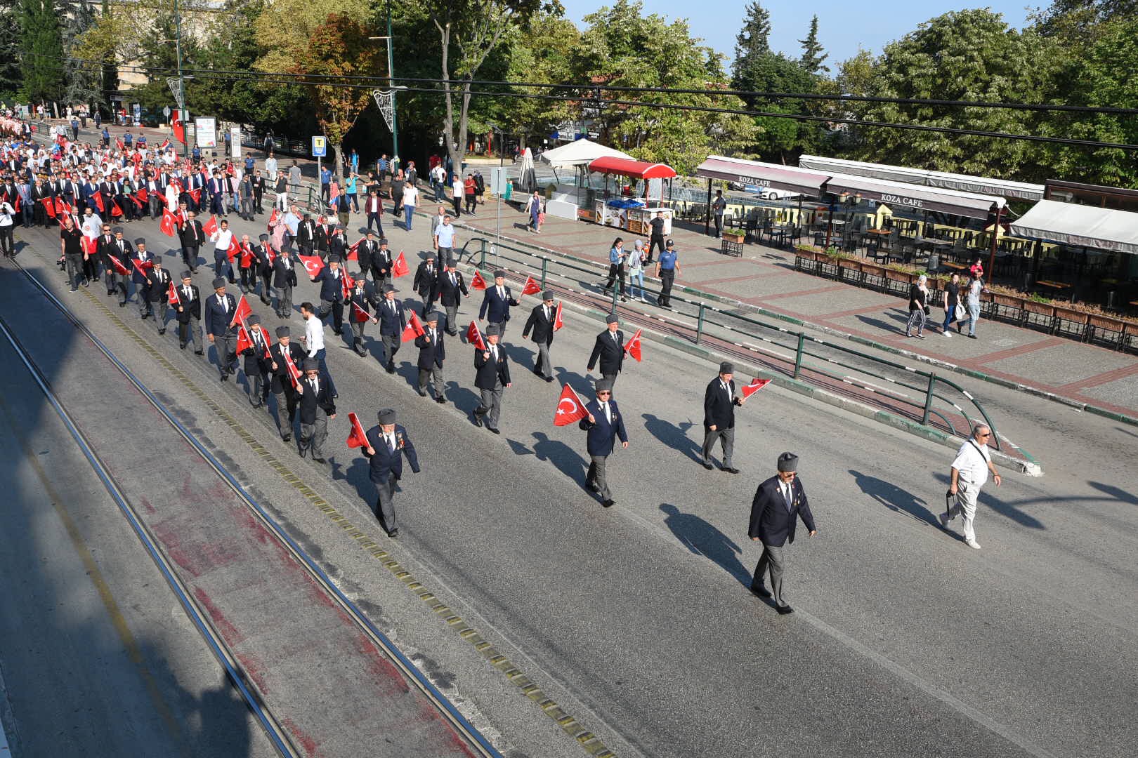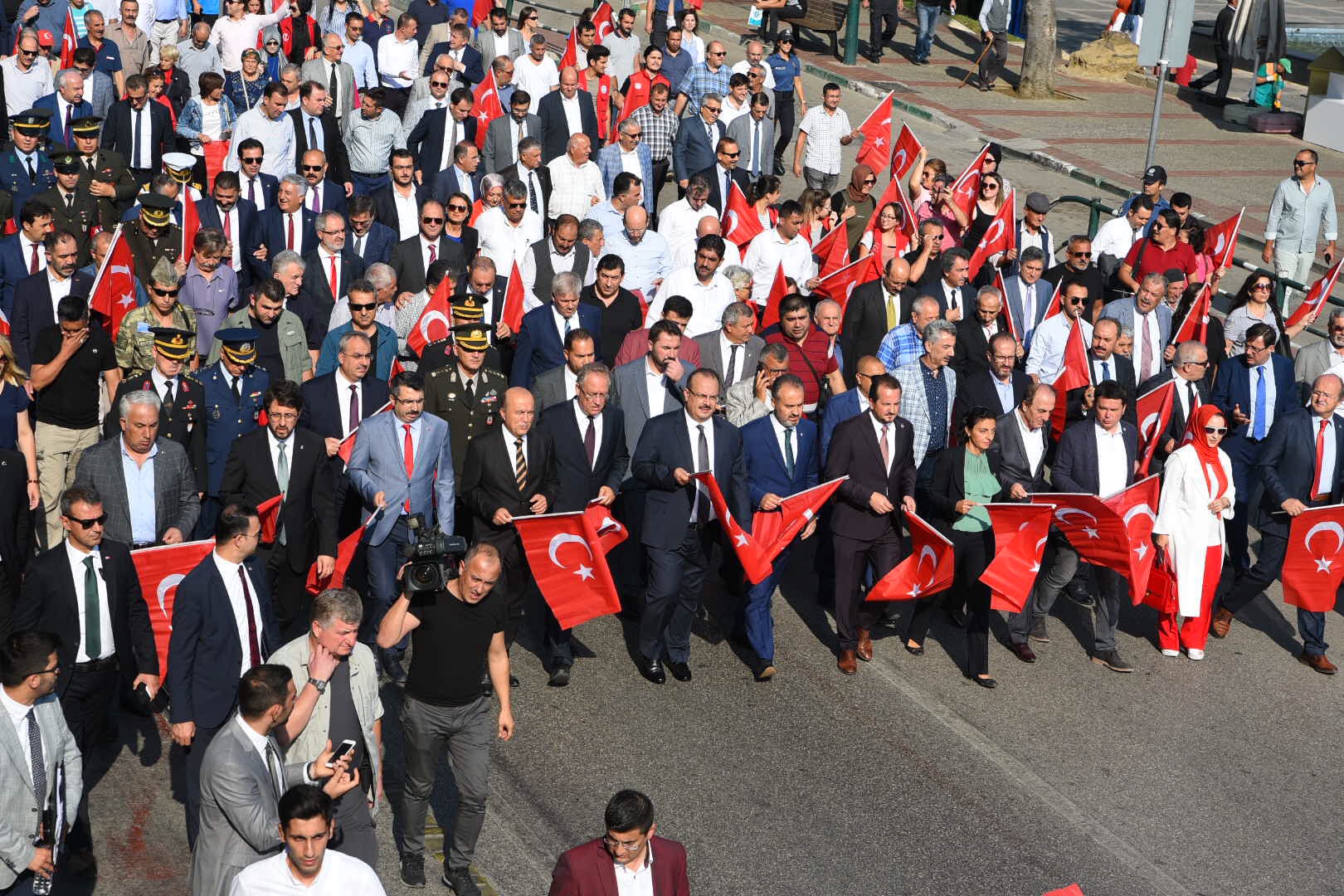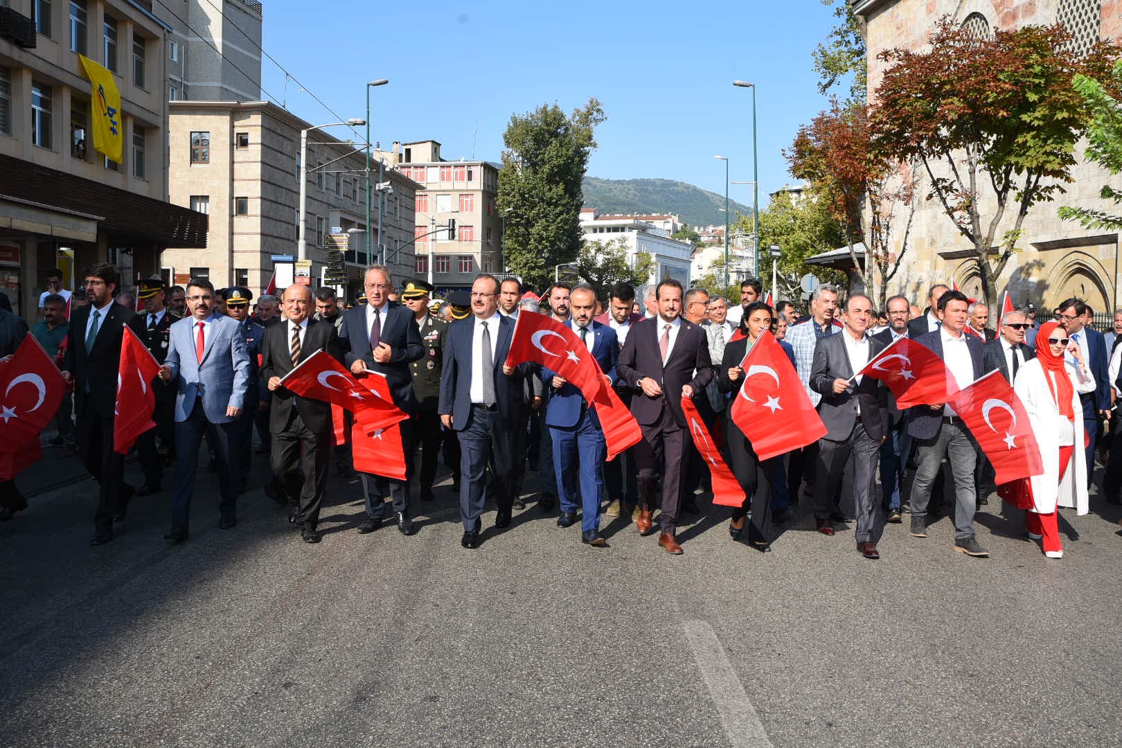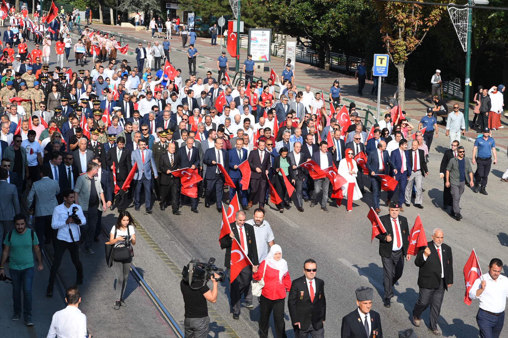 Bursa Büyükşehir Belediye Bandosu ve Bursa Mehter Takımı eşliğinde gerçekleşen yürüyüşe, vatandaşlar da yoğun ilgi gösterdi. Türkiye Muharip Gaziler Derneği Bursa Şubesi üyelerinin de katıldığı kortejde, 7’den 70’e tüm Bursalılar, ellerindeki Türk bayraklarıyla coşkuya ortak oldu. Kortejin ardından Vali Canbolat ve Başkan Aktaş, Atatürk Anıtı’na çelenk koydu. Saygı duruşu ve İstiklal Marşı’nın okunmasının ardından da tören, Bursa Kent Müzesi amfi tiyatroda devam etti.
