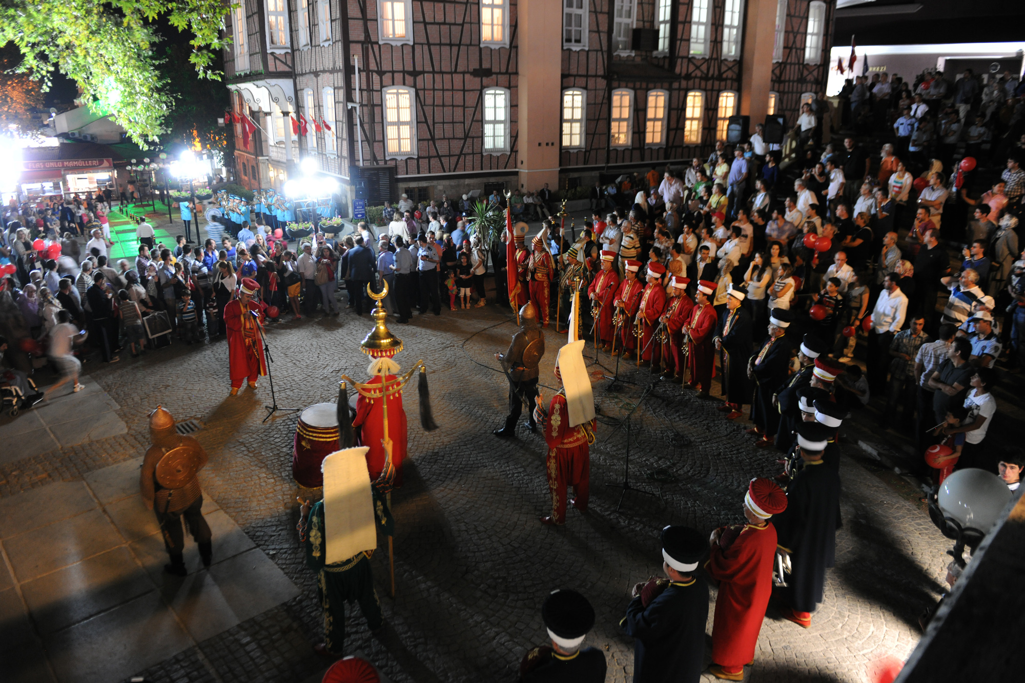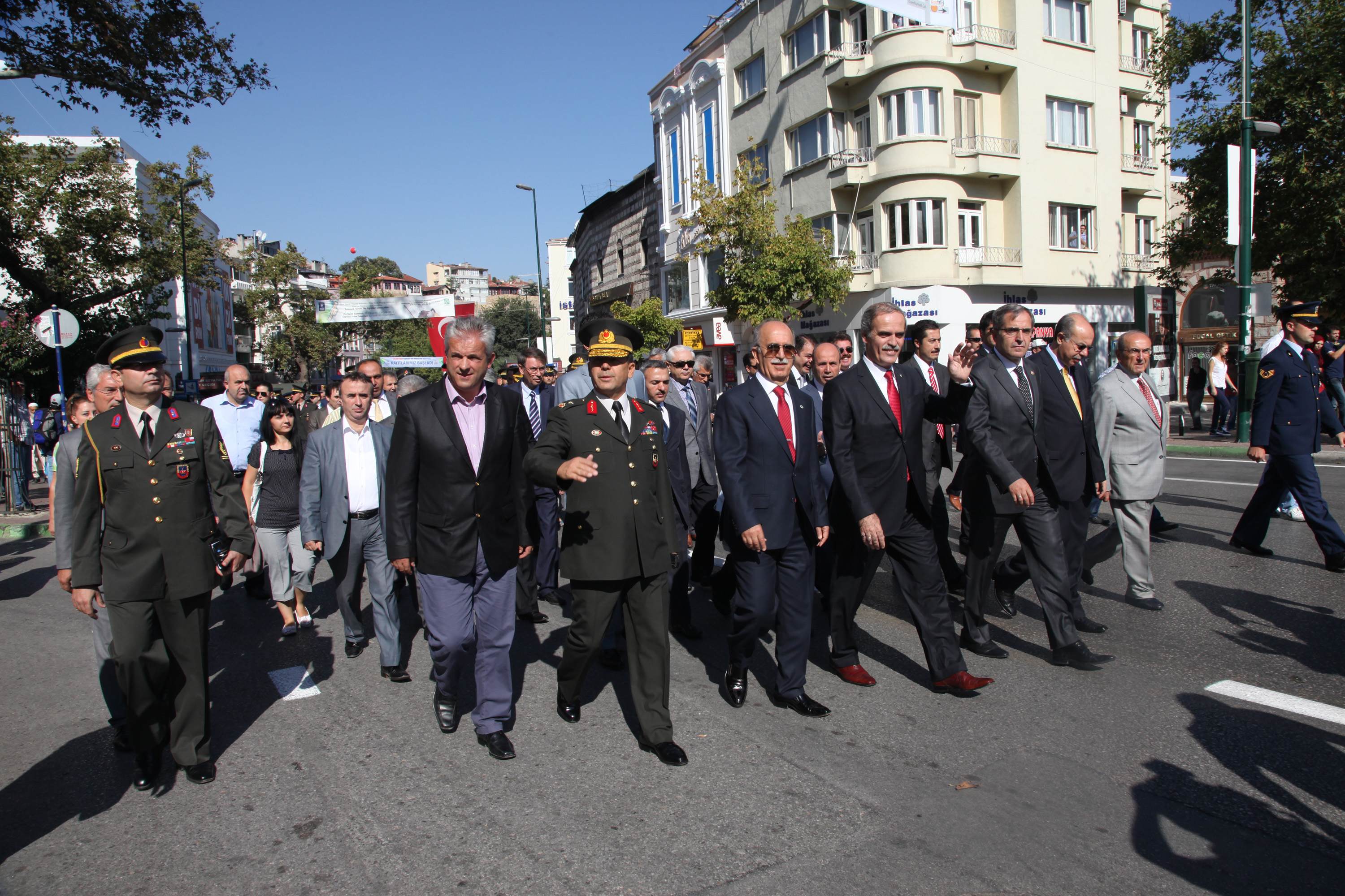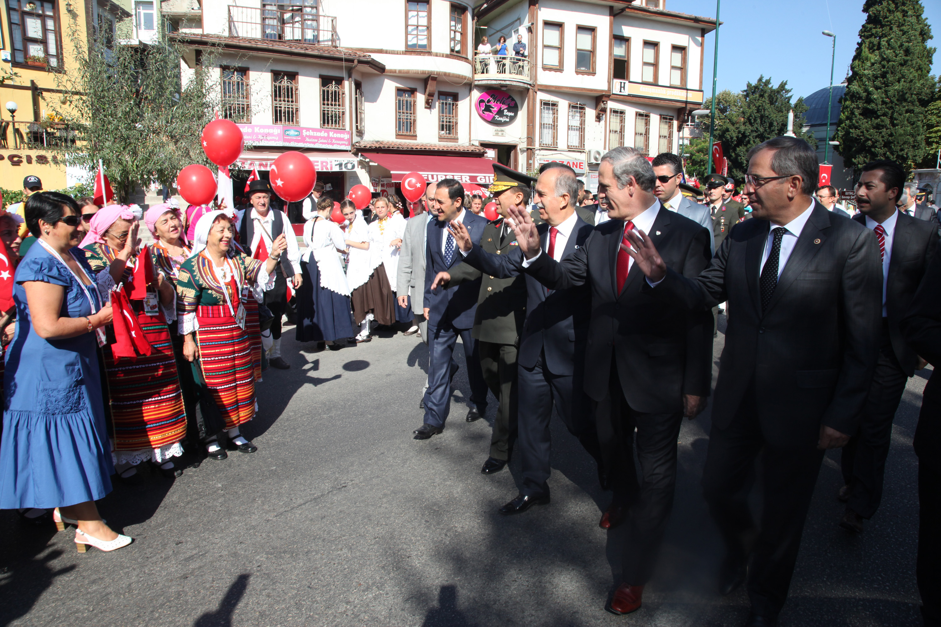 Gündüz devam eden kutlama programı Tophane Meydanı’ndan başlayan kortej yürüyüşü ile devam etti. Belediye Bandosu ve Mehter Takımı’nın marşları eşliğinde yürüyüşe geçen kortejde Vali Şahabettin Harput, Büyükşehir Belediye Başkanı Recep Altepe, Garnizon Komutanı Tuğgeneral Ümit Yılmaz, AK Parti Milletvekilleri İsmet Su ve Hakan Çavuşoğlu da ön sırada yer aldı. Bu yıl 7’inci düzenlenen Balkan Festivaline katılmak için KKTC, Kosova, Romanya, Hırvatistan, Sırbistan, Montanya, Makedonya, Arnavutluk ve Bulgaristan’dan gelen konuk öğrenciler de yöresel kıyafetleri ile kortejde yer alırken, öğrencilerin Kent Müzesi önündeki törende sergiledikleri halk dansları gösterisi ile kutlamalar şölen havasında geçti.