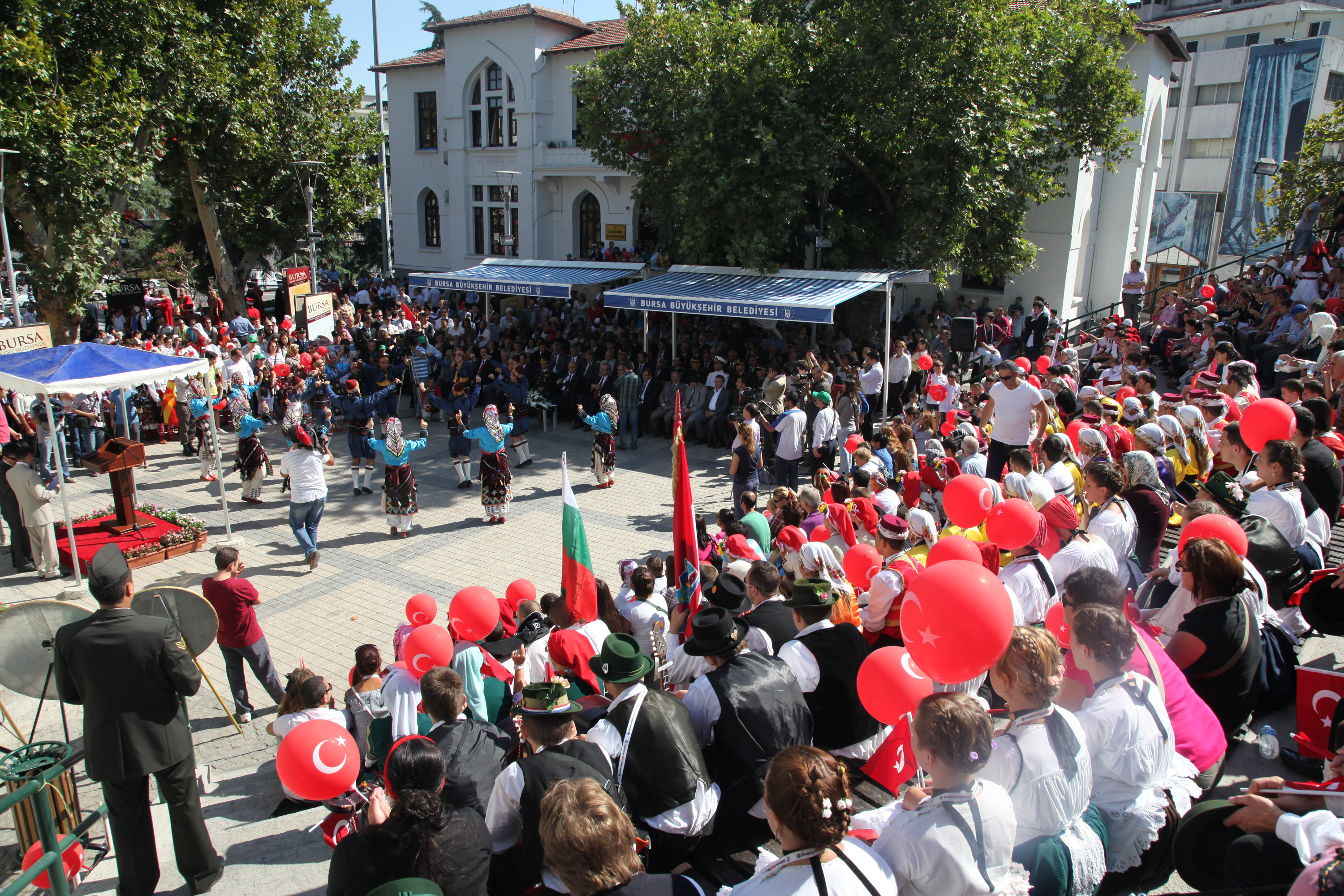 BURSA – Bursa’nın düşman işgalinden kurtuluşunun 90. yılı kutlamaları gece tarihi belediye binası önünde yapılan etkinliklerin ardından Atatürk Caddesi’ndeki resmi geçit töreni ile devam etti. Balkan Festivaline katılan konuk halk dansları topluluklarının da gösterileriyle renklenen kutlamalar, şölen havasında geçti.