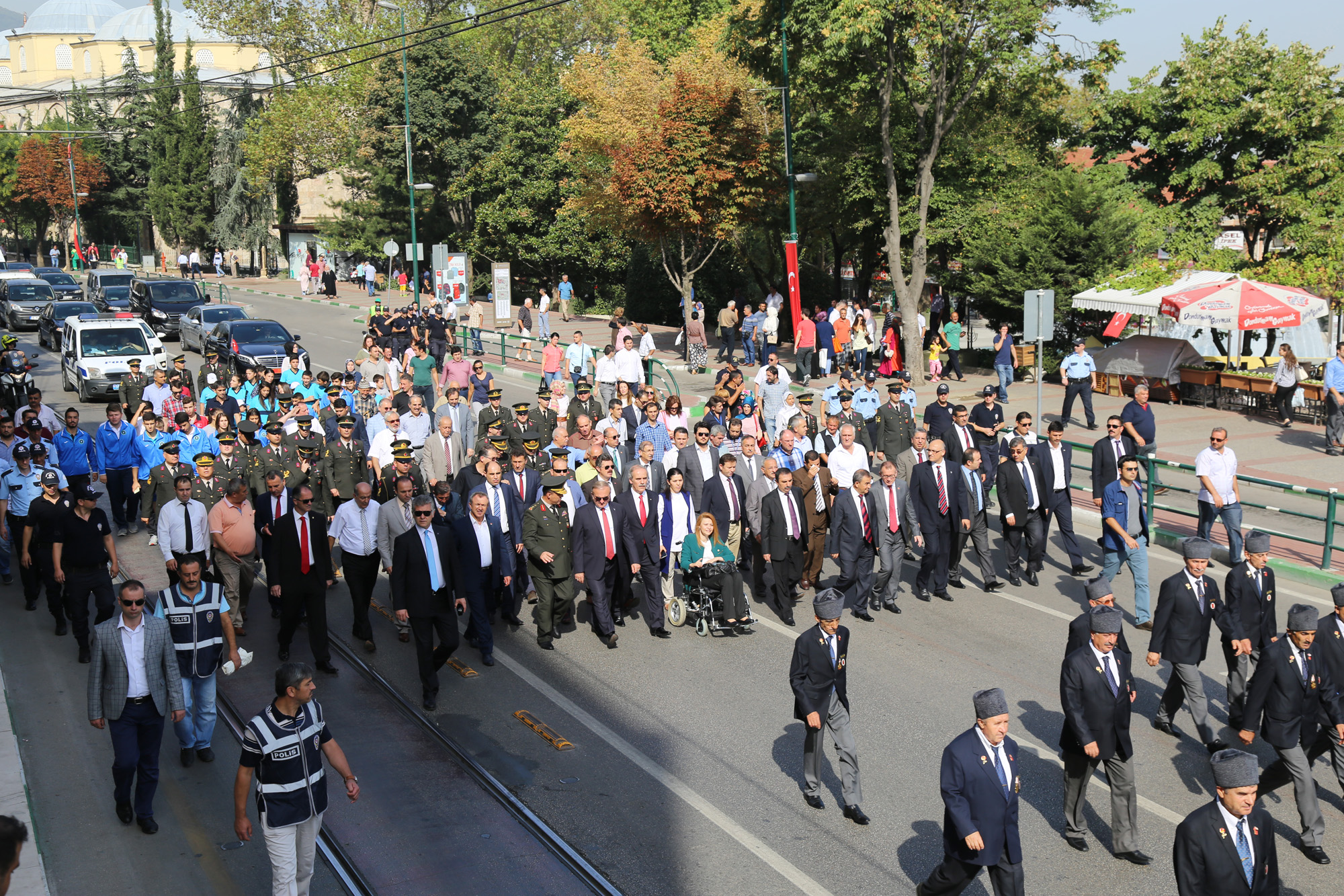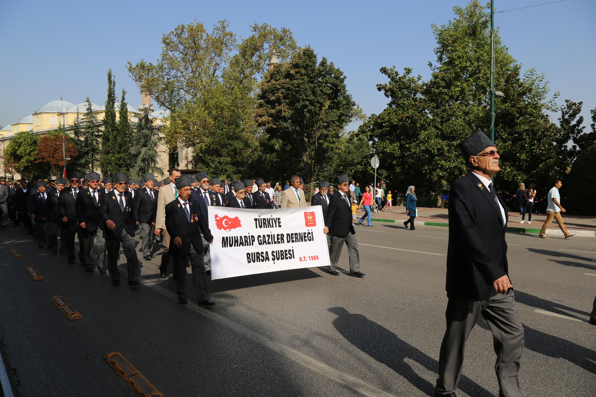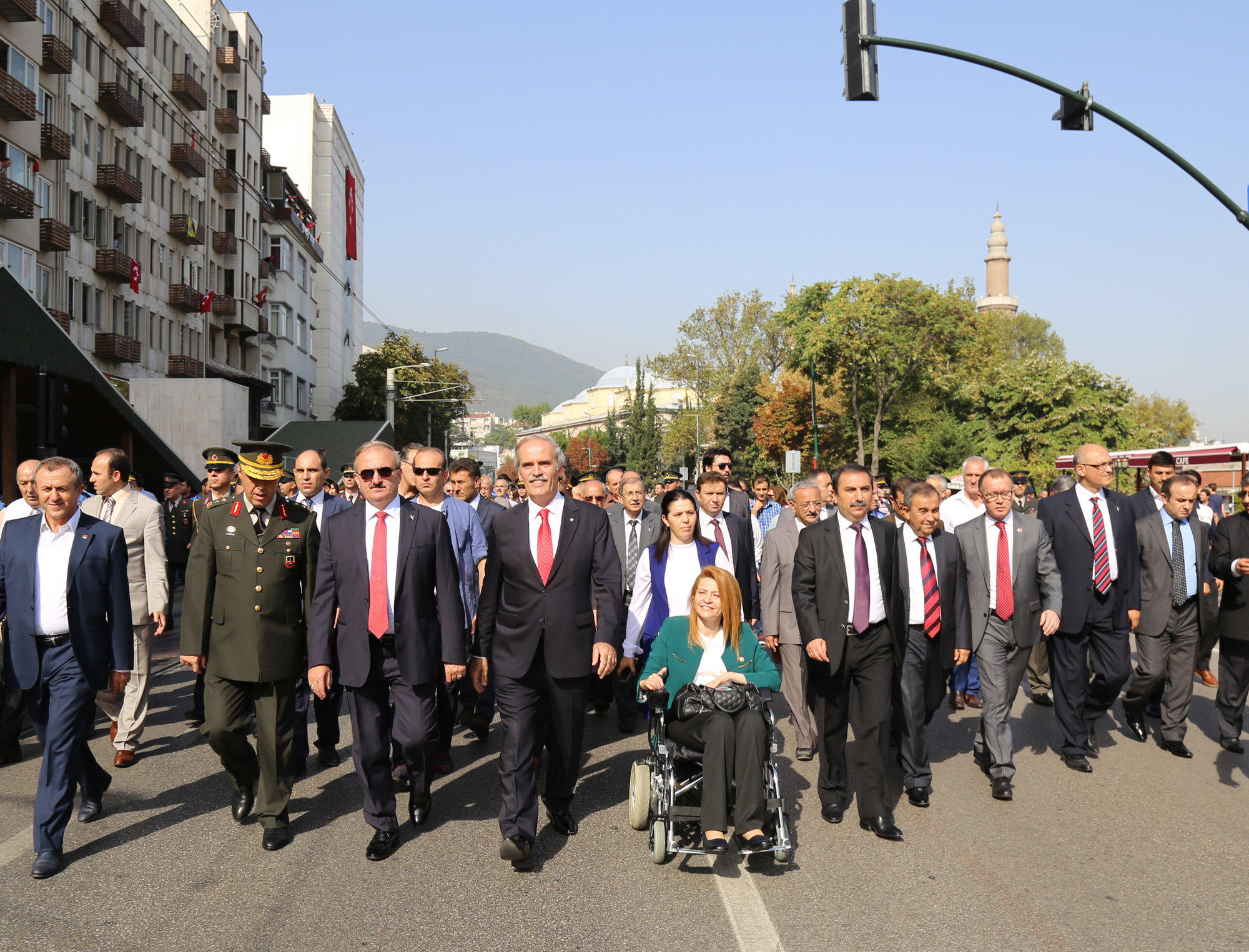 Türkiye’de bölücü terör örgütüyle mücadelede verilen şehitler nedeniyle sade tutulan ve Bursa Valiliği ile Büyükşehir Belediyesi tarafından organize edilen tören, Tophane Saltanat Kapı’dan başlayan ve Atatürk Caddesi boyunca devam eden, Bursa Kent Müzesi önünde son bulan kortej yürüyüşüyle başladı. Bursa Valisi Münir Karaloğlu, Büyükşehir Belediye Başkanı Recep Altepe, AK Parti Milletvekili Bennur Karaburun ve Bursa Bölge Garnizon Komutanı Tümgeneral Seyfullah Saldık’ın da katıldığı kortej yürüyüşünde, Bursa Mehter Takımı ile Büyükşehir Belediye Bandosu çaldığı marşlarla vatandaşları gururlandırdı. Türkiye Muharip Gaziler Derneği Bursa Şubesi üyeleri, üniformalarıyla törene renk kattı. Bursa Kent Müzesi önündeki törende, Özel Ahmet Kırmızı Temel Lisesi öğrencisi Eren Işık, ‘Bursa’nın külleri’ isimli şiirini seslendirdi.