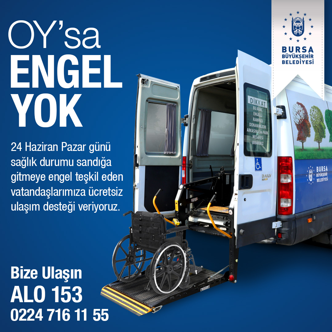 Büyükşehir Belediyesi’nden konuya ilişkin yapılan açıklamada, engelsiz ulaşım hizmetinden yararlanmak isteyen vatandaşların ‘24 Haziran Pazar günü oy kullanma saatleri arasında’ ‘153’ ya da ‘0224 7161155’ numaralı telefonlardan araç talebinde bulunabileceği ifade edildi. Yetkililer, uygulamanın engelliler ile ulaşım imkanı bulunmayan tüm hastaları kapsadığını vurguladı.