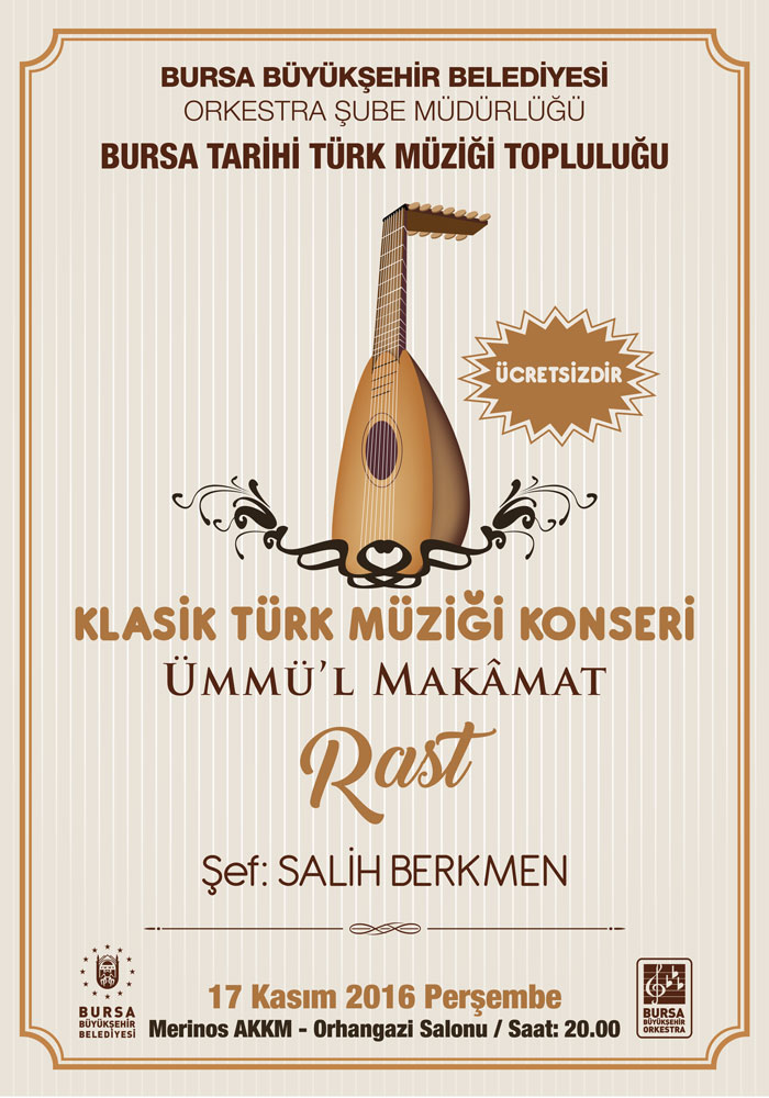 BURSA – Büyükşehir Belediyesi Orkestra Şube Müdürlüğü Bursa Tarihi Türk Müziği Topluluğu’nun ‘Klasik Türk Müziği Konseri’, Salih Berkmen şefliğinde, 17 Kasım Perşembe günü saat 20.00’da Merinos AKKM Orhangazi Salonu’nda gerçekleştirilecektir.