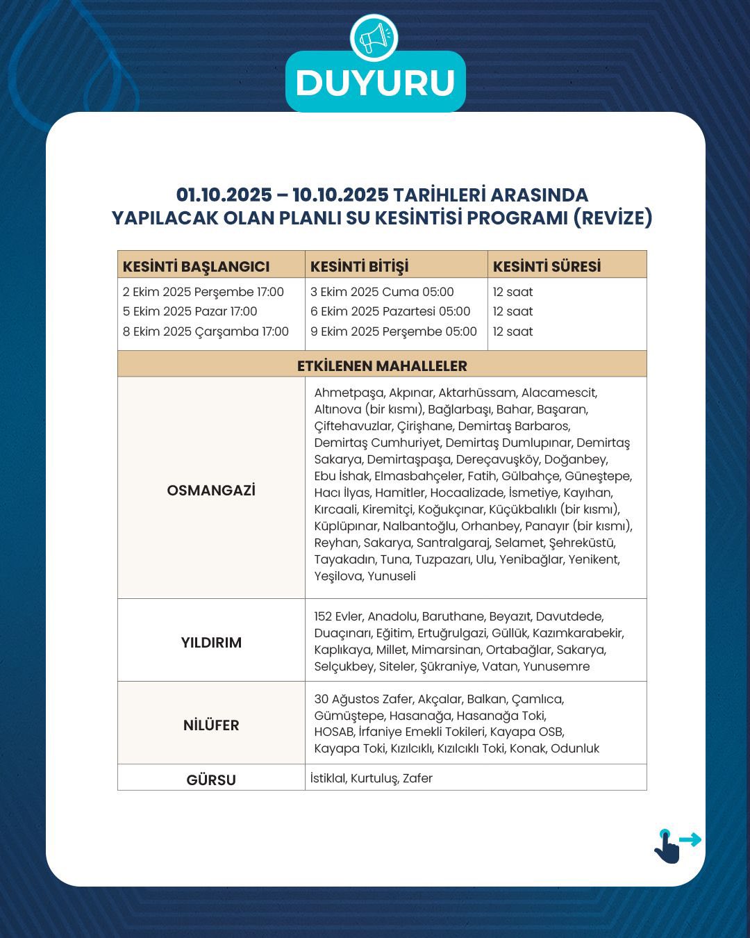 Planlı su kesintilerinden, Uludağ Üniversitesi, Şehir Hastanesi ve Devlet Hastaneleri etkilenmeyecektir. Planlı su kesinti listesi ekte sunulmuştur” denildi.