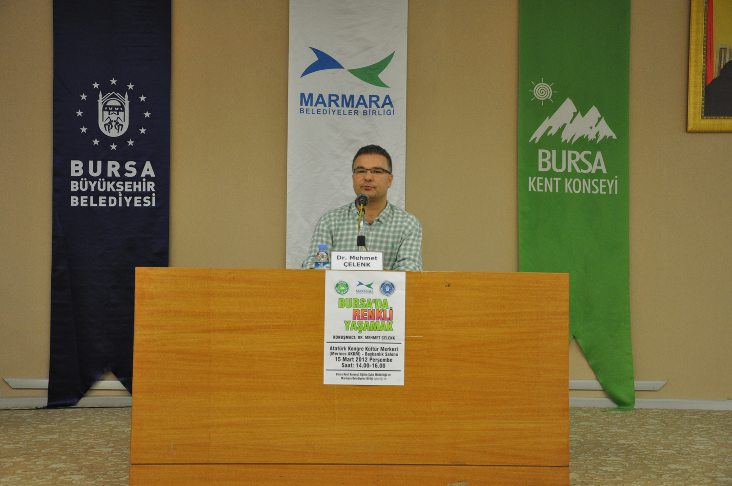 Marmara Belediyeler Birliği, Bursa Büyükşehir Belediyesi ve Bursa Kent Konseyi organizasyonuyla Atatürk Kongre Kültür Merkezi (Merinos AKKM) Başkanlık Salonu’nda ‘Bursa’da renkli yaşamak’ konulu seminer düzenlendi. Uludağ Üniversitesi İlahiyat Fakültesi’nden Dr. Mehmet Çelenk’in konuşmacı olarak katıldığı seminere, belediye bağlı kuruluşların yöneticileri, Bursa Kent Konseyi üyeleri ve vatandaşları katıldı. Bursa’yı anlatmanın hem çok kolay olduğunu, hem de çok zor olduğunu söyleyen Çelenk, bir şehirde ikamet etmekle yaşamanın da farklı olduğunu belirtti. Bursa’da yaşayan insanların en büyük sıkıntısının kente olan ilgisizlikleri olduğunu ifade eden Çelenk, “Bu kentte Bursa’yı hayatımıza dahil etmeden yaşamak malzemeden çalmak gibidir. Bir şehri sevmek için mutlaka o şehrin yerlisi olmaya gerek yok. Yaşadığı şehrin tarihini, dilini biliyorsa artık yerlisidir. Kültürünü, mekanlarını içinde hissedebilir” diye konuştu.