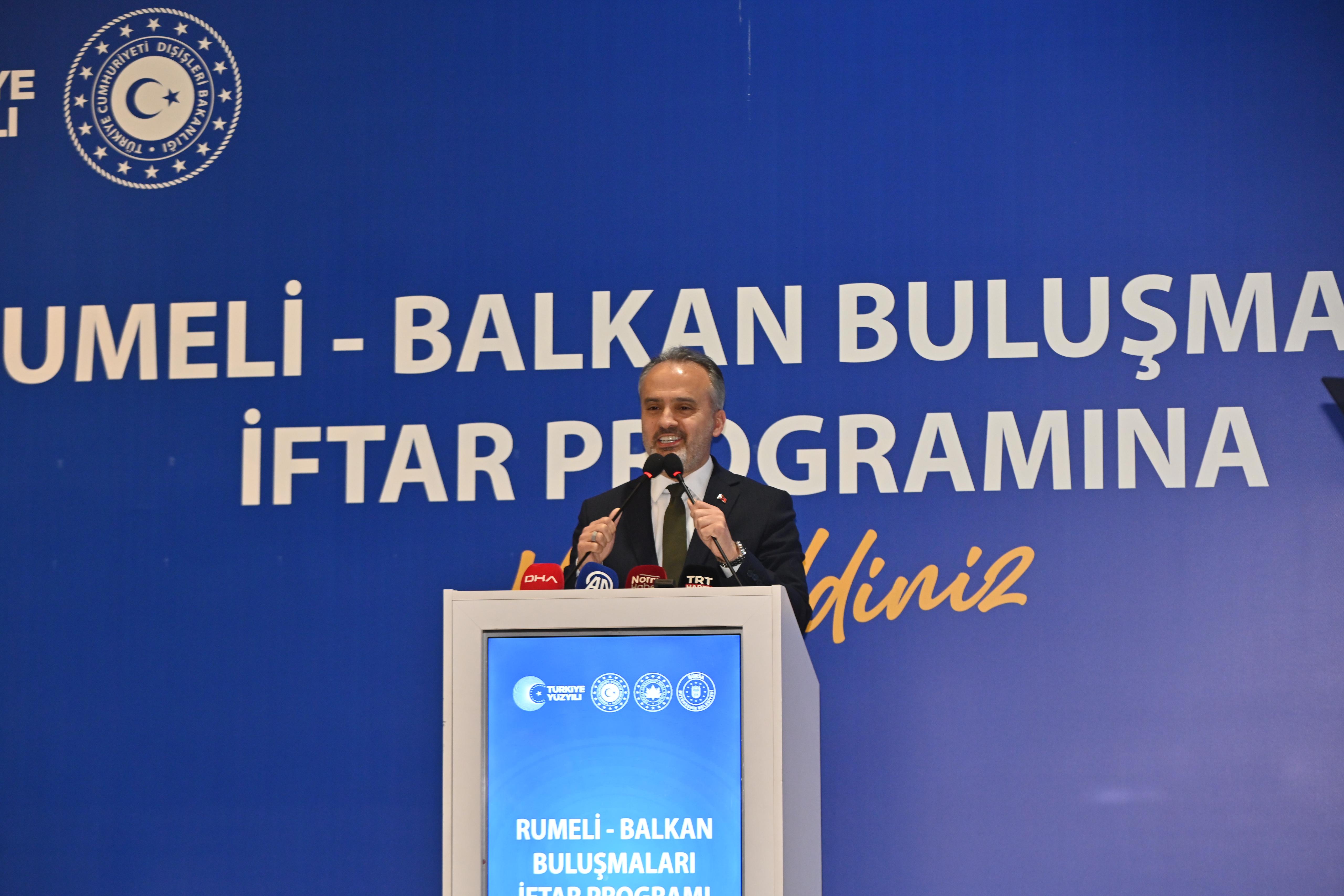 Bursa’daki yerel yönetimin STK’lar ile iş birliği yaparak Balkanlar’da örnek faaliyetlere imza attığını söyleyen Bakan Fidan, “Bursa Valiliği ile belediyeleriyle, Bal-Göç başta olmak üzere sivil toplum örgütleri ve dernekleriyle, iş insanlarıyla, gönüllüleriyle Balkanlar’da büyük hayırlı işlere imza atıyor. Tarihi eserlerimizin restorasyonunda yeni cami ve mescit inşasına zor durumdaki kardeşlerimize el uzatmaktan toplu iftarlara nice hayırlı işlerde Bursalı kardeşlerimizin hem ön safta oluruz. Bu hususta örnek faaliyetleriyle dikkati çeken Bursa Büyükşehir Belediyemizi yürekten kutluyorum. Alinur Aktaş başkanımızın liderliğindeki belediyemizin sorumluluklarını en iyi şekilde yerinde görmek hakikaten bizler için gurur verici. Bugünkü ziyaretimde de buna bir kez daha şahit olma imkanım oldu. Belediyemiz şehirdeki güzel icraatlarına ilaveten bir yandan da kardeşlerimize destek olmaya devam ediyor. Bu yüzden Bursa Büyükşehir Belediyesi sadece yerel düzeyde değil Balkanlar’da da sorumluluk üstlenen stratejik bir aktör haline gelmiş durumdadır. Alinur Aktaş başkanımızın sizlerin de desteğiyle inşallah yeniden seçilerek bir dönem daha bu kutlu göreve devam edeceğine inanıyorum. Önümüzdeki dönemde çok daha büyük hizmetlere ve hayırlara imza atacağına inanıyorum. Bu noktada ilçe belediyelerimize ve güzel hizmetlerinden dolayı ayrıca teşekkür ediyorum. Kim soydaşlarımıza, din kardeşlerimize omuz, davamıza destek veriyorsa, taş üstüne taş koyuyorsa Allah ondan razı olsun” diye konuştu.