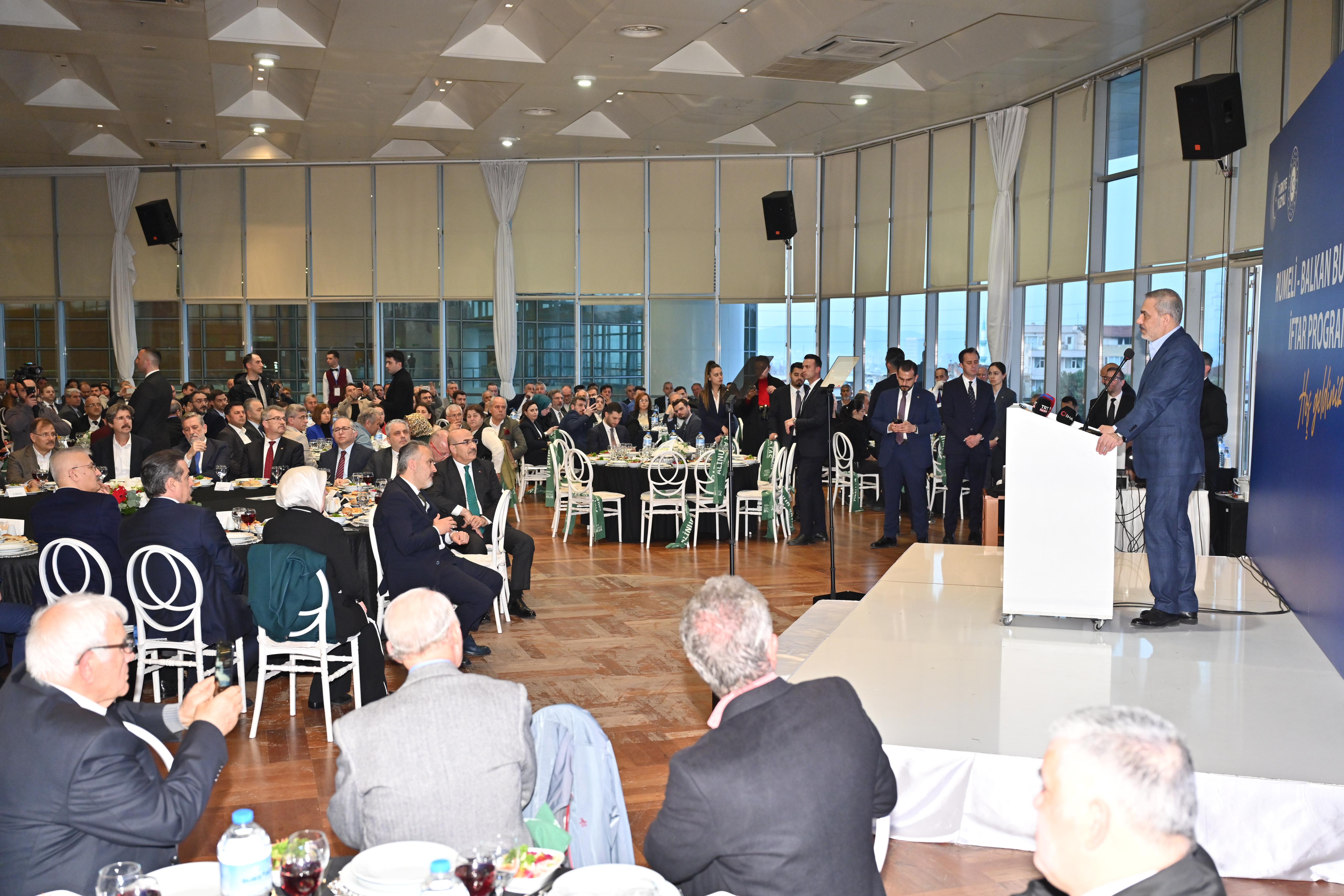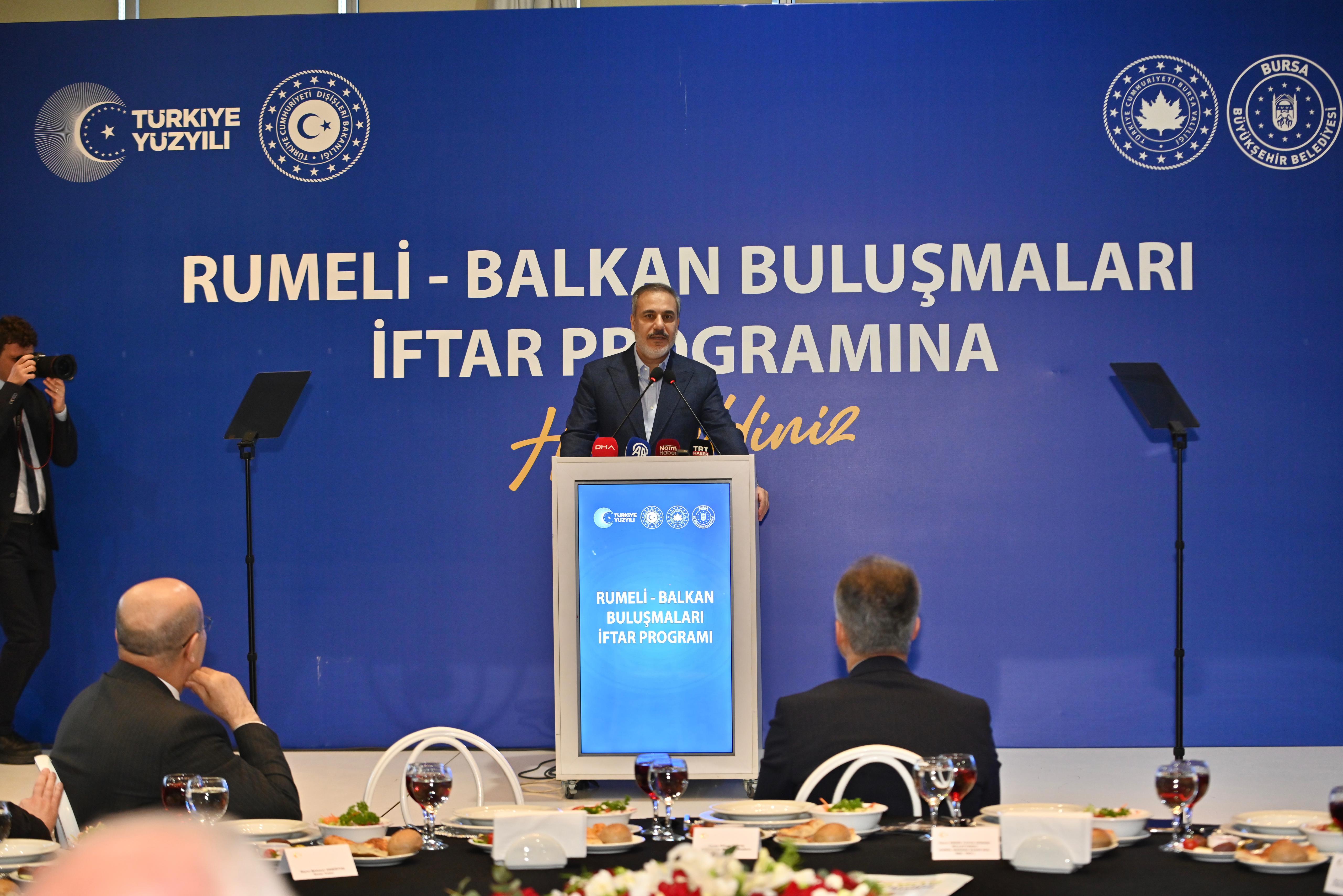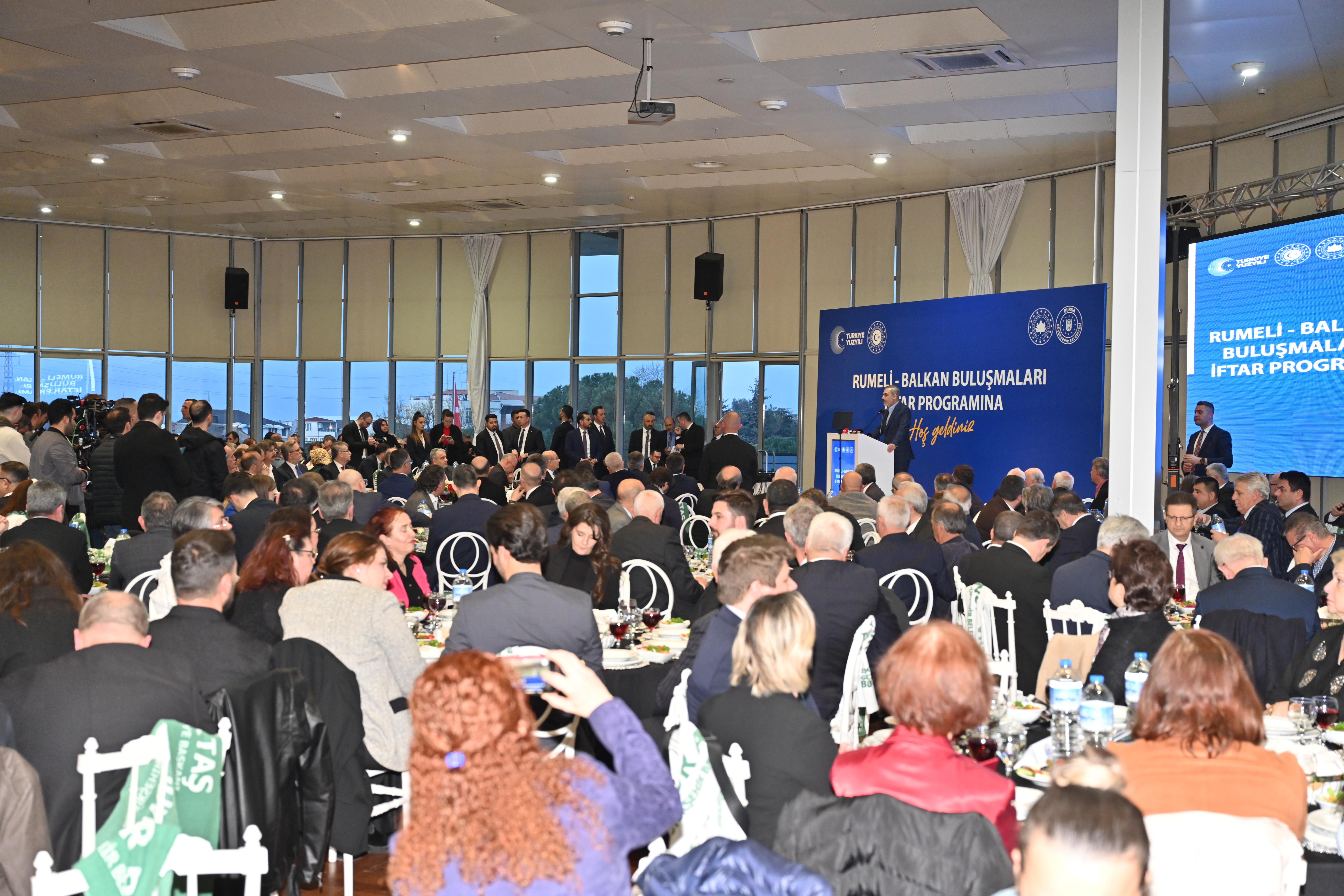 Bir dizi ziyaretlerde bulunmak üzere Bursa’ya gelen Dışişleri Bakanı Hakan Fidan, Bursa Valiliği ve Bursa Büyükşehir Belediyesi tarafından Merinos Atatürk Kongre Kültür Merkezi’nde düzenlenen ‘Rumeli Balkan Buluşmaları’ iftar programına katıldı. Programa, Bakan Hakan Fidan’ın yanı sıra Vali Mahmut Demirtaş, Bursa Büyükşehir Belediye Başkanı Alinur Aktaş, İl Jandarma Komutanı Tümgeneral Tekin Aktemur, AK Parti İl Başkanı Davut Gürkan, BTSO Başkanı İbrahim Burkay, Bursa Uludağ Üniversitesi Rektörü Feridun Yılmaz, Bursa Teknik Üniversitesi Başkanı Naci Çağlar, Bursa milletvekilleri, ilçe belediye başkanları ve Rumeli-Balkan dernekleri temsilcileri, sivil toplum kuruluşlarının üyeleri ve Rumelili iş insanları katıldı.
