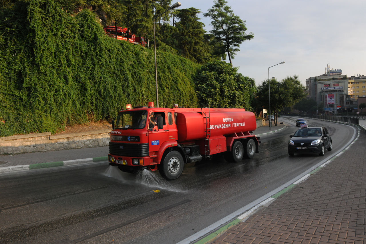 BURSA – Bursa Büyükşehir Belediyesi itfaiyecileri, hava sıcaklığının artmasıyla birlikte, vatandaşların trafikte tozdan ve sıcaktan etkilenmemesi için, araç trafiğinin yoğun olduğu ana arterlerde caddeleri ıslatıyor.