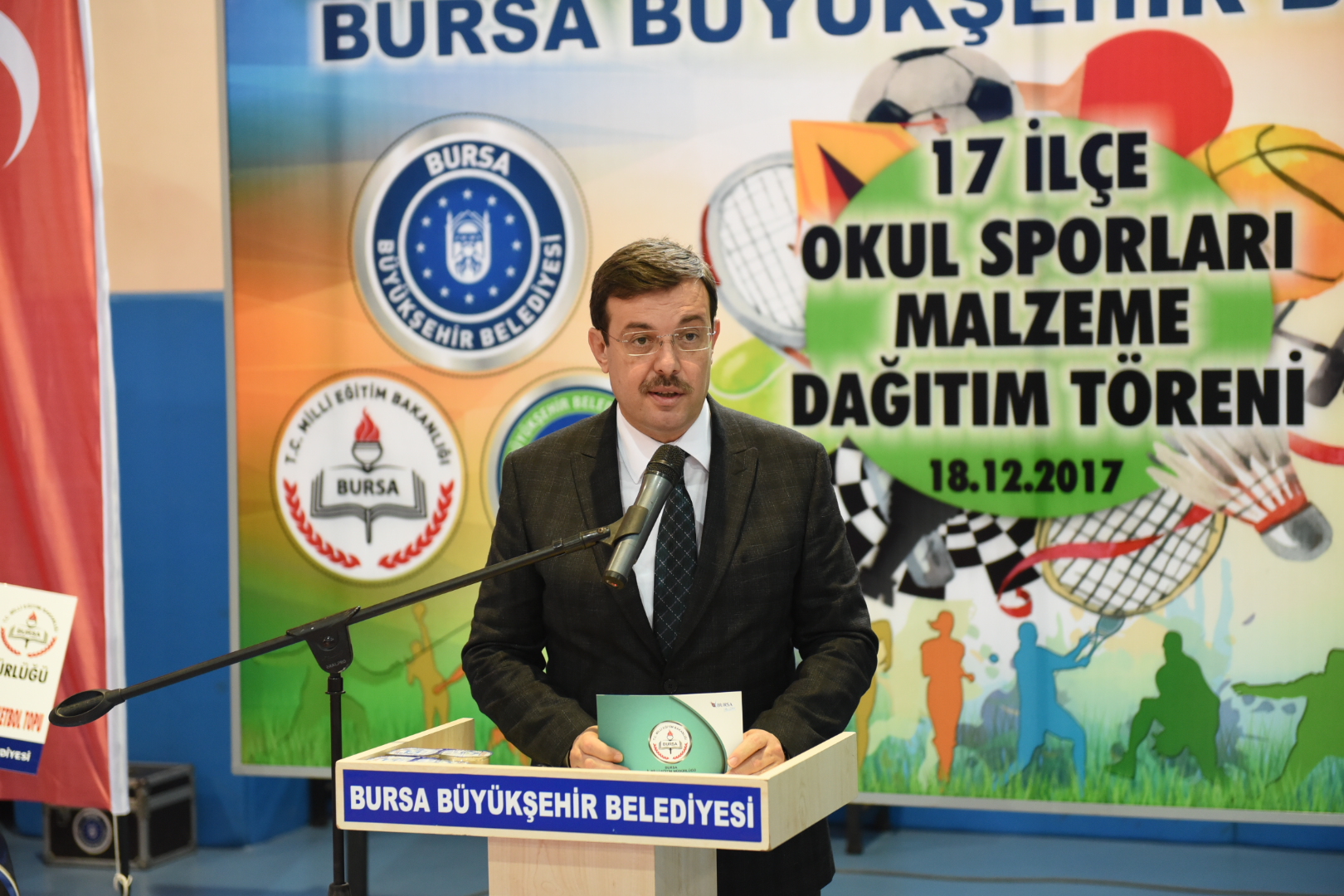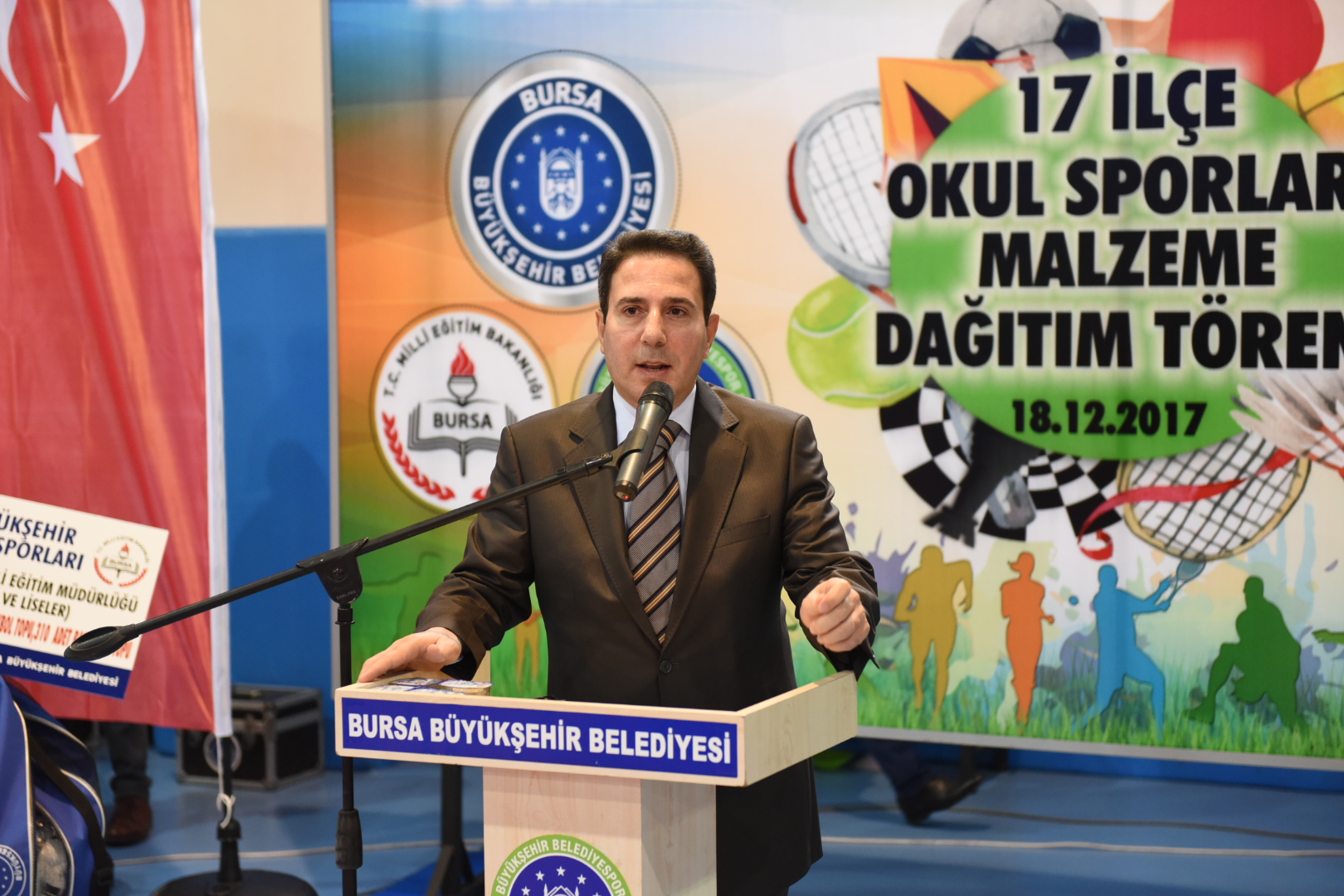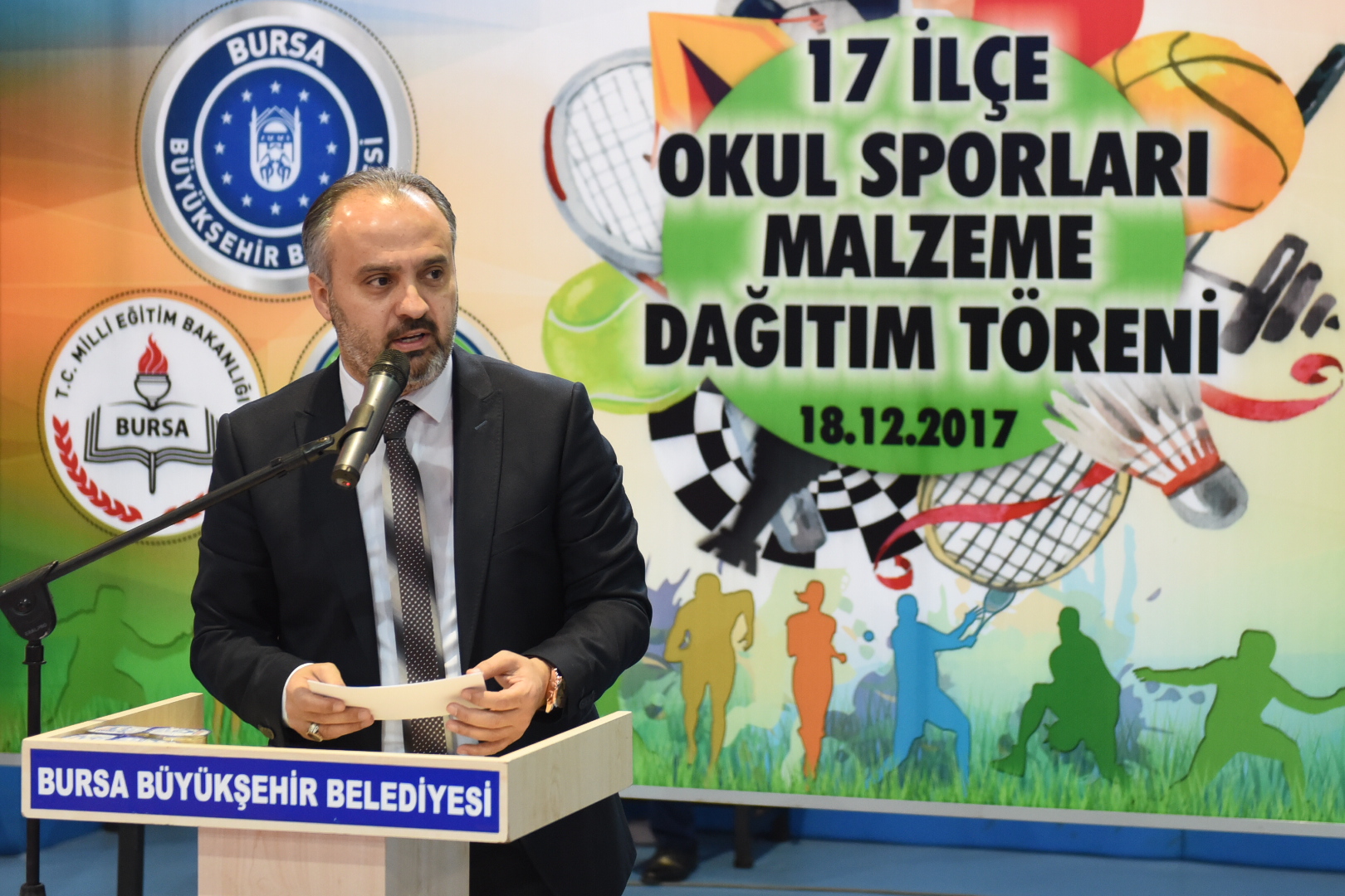 Büyükşehir Belediye Başkanı Alinur Aktaş, tören başlangıcında yaptığı konuşmada, öğrencilere eğitim ve öğretim hayatları devam ederken en az 1 spor dalıyla profesyonel olarak uğraşmaları tavsiyesinde bulundu. Büyükşehir Belediyesi olarak önümüzdeki dönemde sporu tabana yaymak ve gençlerin bundan istifadesini sağlamak için hamleler yapacaklarını açıklayan Başkan Aktaş, 2017-2018 eğitim öğretim döneminde yaklaşık 252 bin öğrencinin okul sporları etkinliklerinden faydalanmasını planladıklarını belirtti. Etkinliklerin geleneksel hale geldiğini vurgulayan ve gençlere yönelik bu çalışmasından dolayı Büyükşehir Belediye eski Başkanı Recep Altepe’ye teşekkür eden Başkan Aktaş, “Bu sene ayrıca 175 ilkokul, 394 ortaokul ve 356 lisemize çeşitli seviyelerde malzeme desteğinde bulunacağız. Proje kapsamında inşallah fiziksel etkinlik ve oyun şenlikleri, futbol maratonu, satranç, mini voleybol ve basketbol şenlikleri, mini olimpiyatlar gerçekleştirilecek. Toplamda 925 okulumuza gerekli olan malzemeleri teslim edilmiş olacak” dedi.