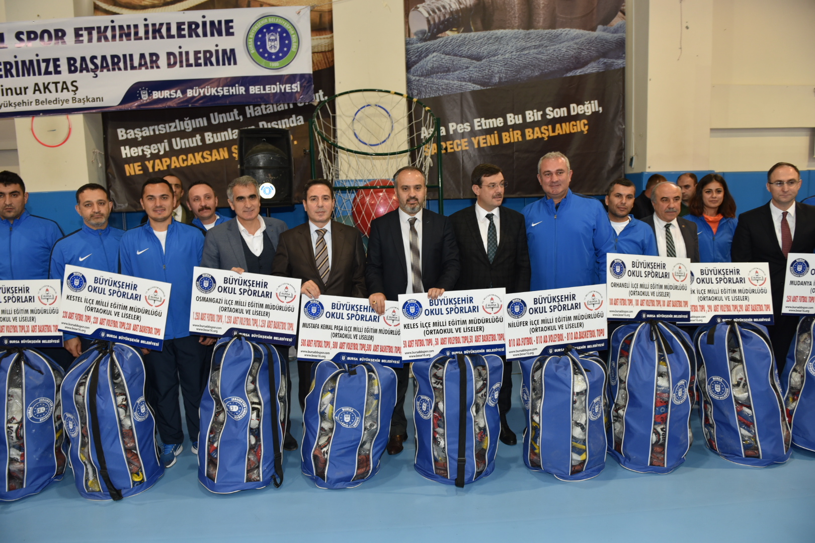 BURSA - Büyükşehir Belediyesi’nin Okul Sporları Etkinlikleri kapsamında geleneksel hale getirdiği ilk, orta ve lise öğrencilerine spor malzemesi yardımı bu sene de devam ediyor. Büyükşehir Belediyespor’un Fethiye’deki merkez yerleşkesinde yapılan törenle 175 ilkokul, 394 ortaokul ve 356 liseye spor malzemesi dağıtıldı. Malzemelerin teslim edilmesi için düzenlenen törene katılan Büyükşehir Belediye Başkanı Alinur Aktaş, önümüzdeki dönemde spor etkinliklerini tabana yayarak daha da etkinleştirmeyi düşündüklerini söyledi.
