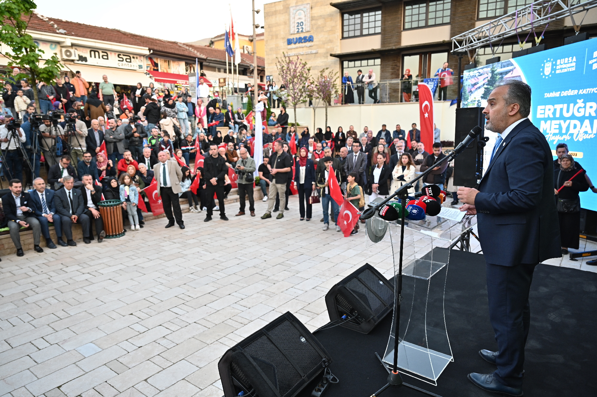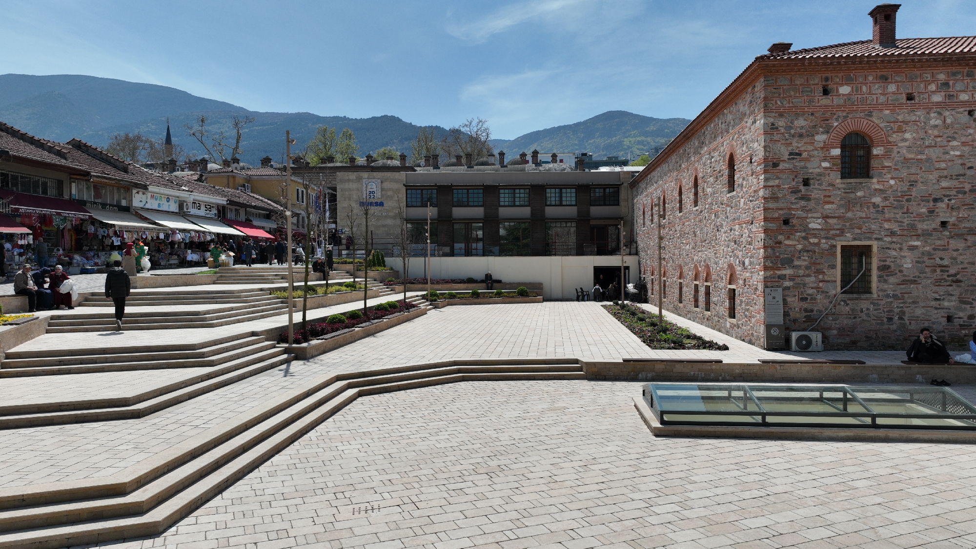 BURSA – Bursa’da yılların hayali olan Tarihi Çarşı ve Hanlar Bölgesi’ni etrafını çevreleyen binalardan kurtarıp, daha görünür kılan Büyükşehir Belediyesi, tarihi bölgeye değer katacak Ertuğrulbey Meydanı’nı törenle hizmete açtı.