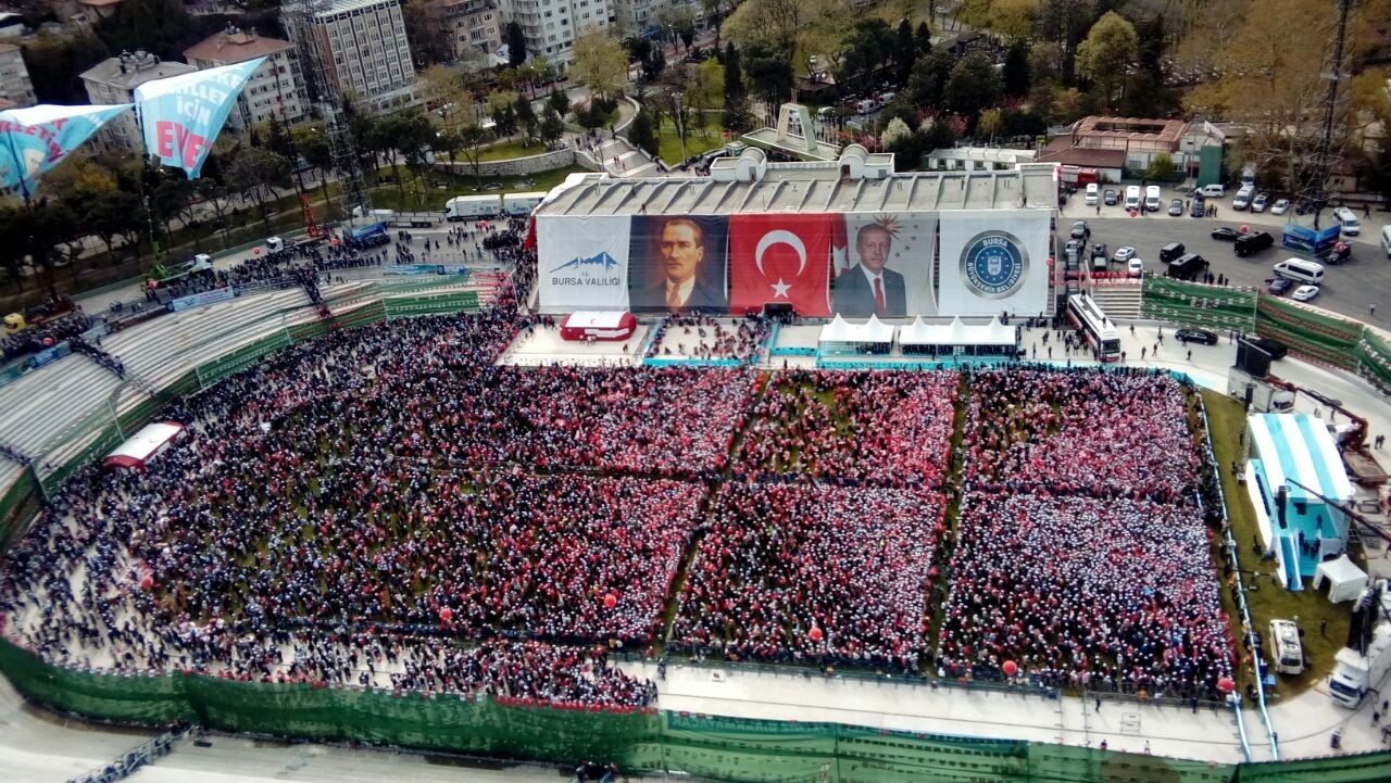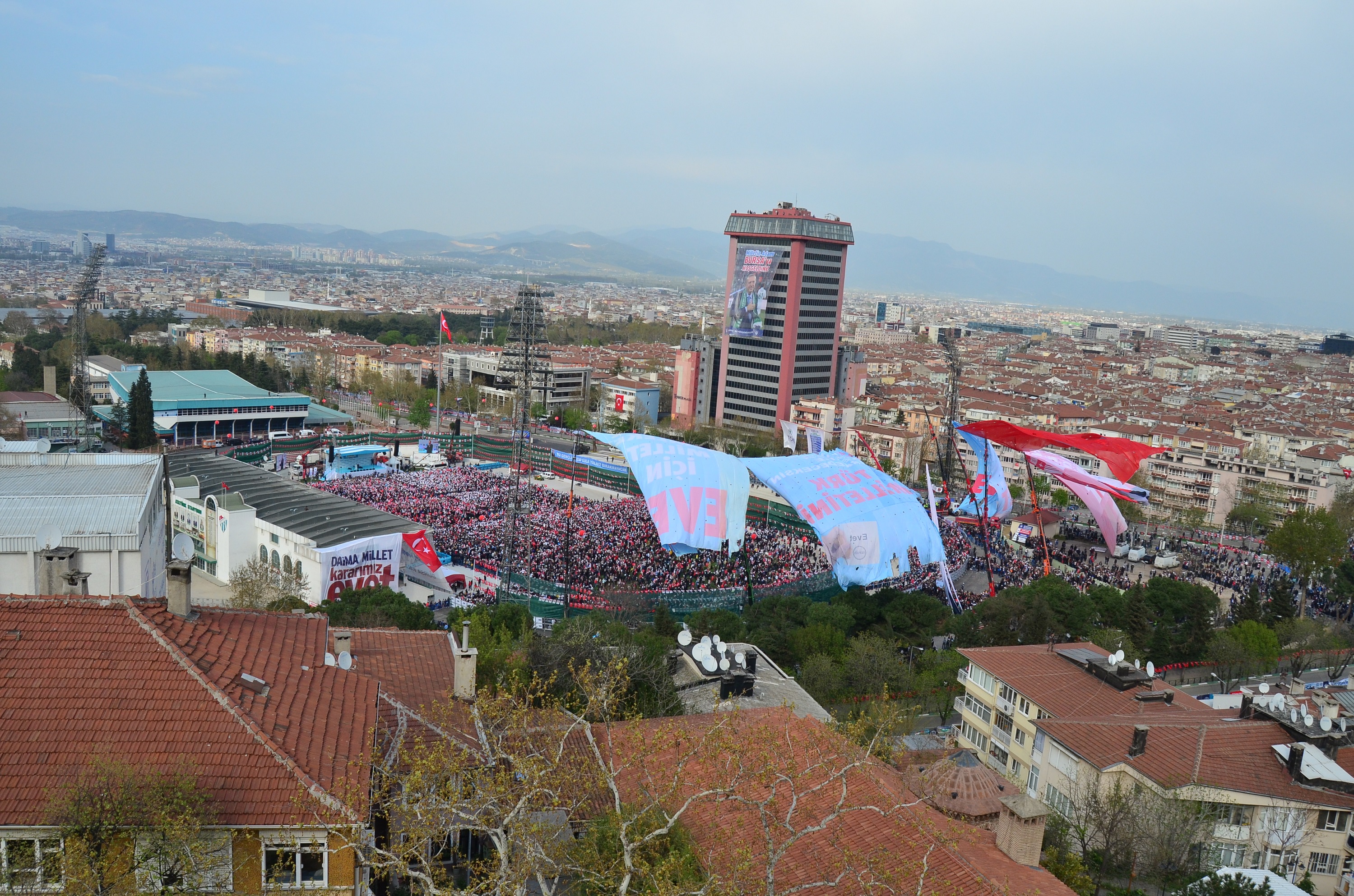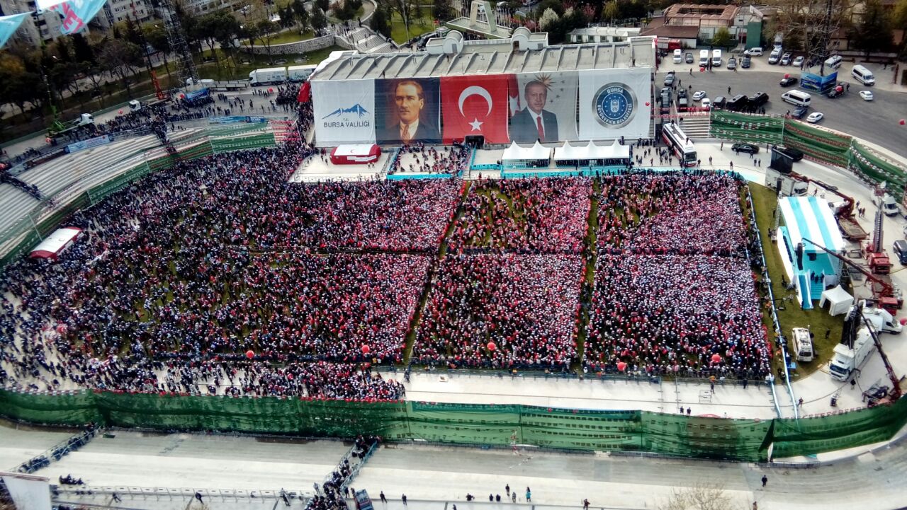 Bursa Büyükşehir Belediyesi tarafından tarihi dokusu korunarak gerçek bir meydana dönüştürülen Atatürk Stadyumu, Cumhurbaşkanı Recep Tayyip Erdoğan’ı ağırladı. Cumhurbaşkanı Erdoğan, Atatürk Meydanı’nda düzenlenen ilk etkinlik olan mitingde hem referandum sürecini değerlendirdi, hem de Büyükşehir Belediyesi tarafından yapımı tamamlanan yaklaşık 237 milyon TL’lik yatırımları hizmete açtı. Büyükşehir Belediyesi tarafından yapılan yatırımlarla birlikte, Bursa’da toplam 384 milyon TL (384 trilyon) yatırımları resmen hizmete açtıklarını dile getiren Cumhurbaşkanı Erdoğan, “Yaklaşık 5,5 aylık aranın ardından beraberiz. Bursa’yı özlemek için uzun zaman. Bursa, Sultan Orhan döneminden beri bu milletin zafer müjdecisi olmuştur. Bursa bugün de 16 Nisan’da kavuşacağımız yeni yönetim sisteminin müjdecisi olmaya, rekor evet oranıyla bir kez daha kurucu şehir vasfını ortaya koymaya hazır mı?” diyerek vatandaşlardan evet tezahüratlarını aldı.
