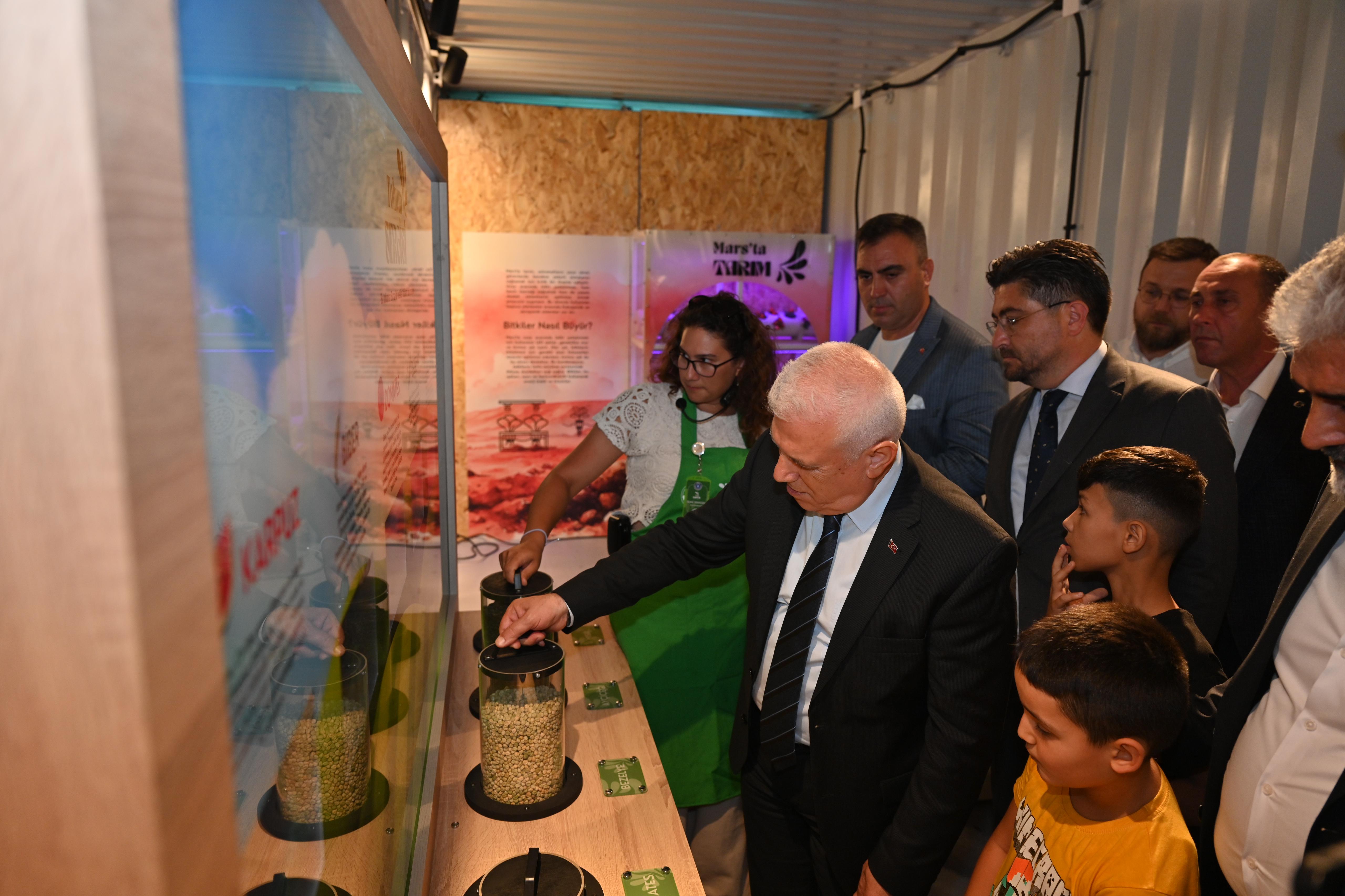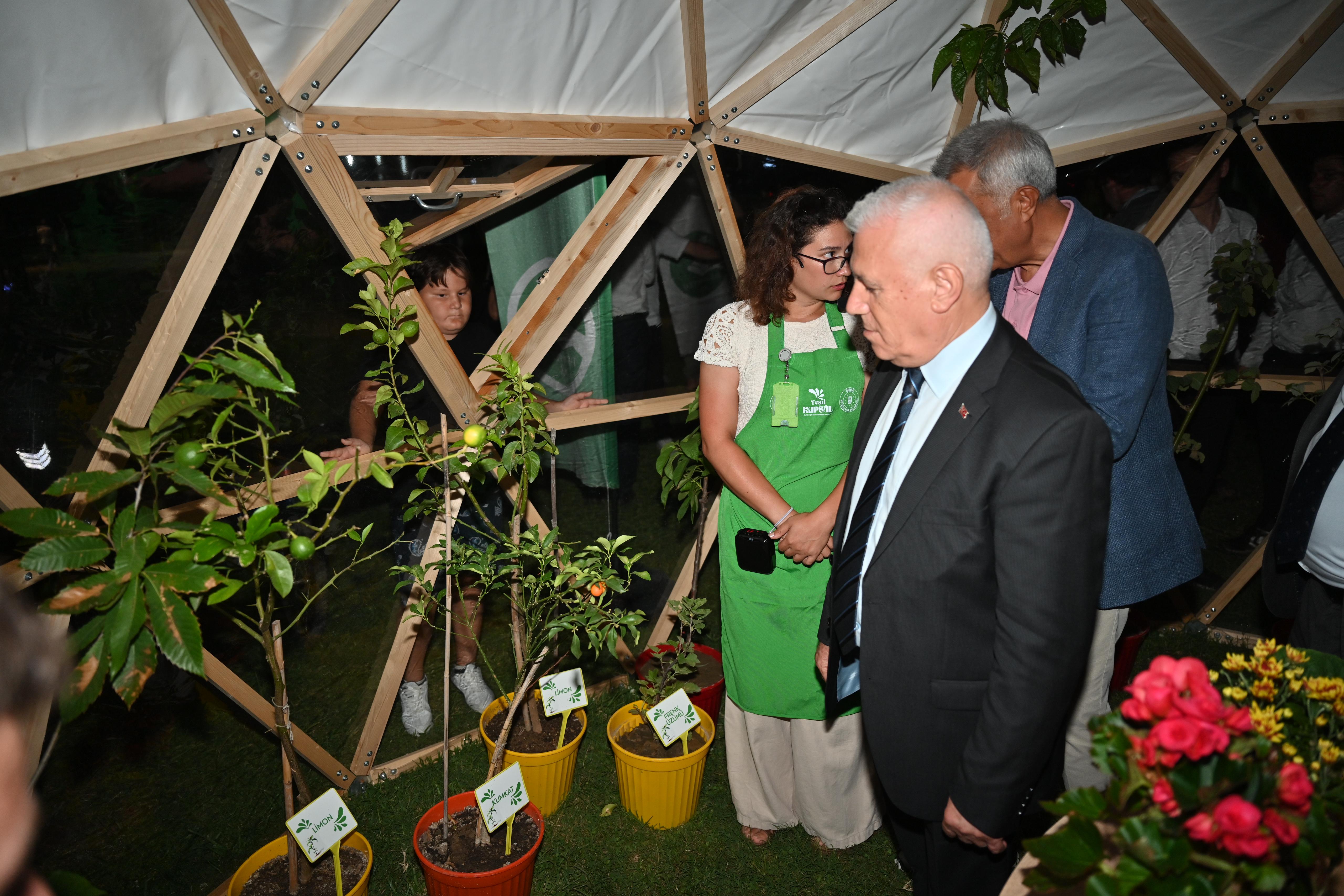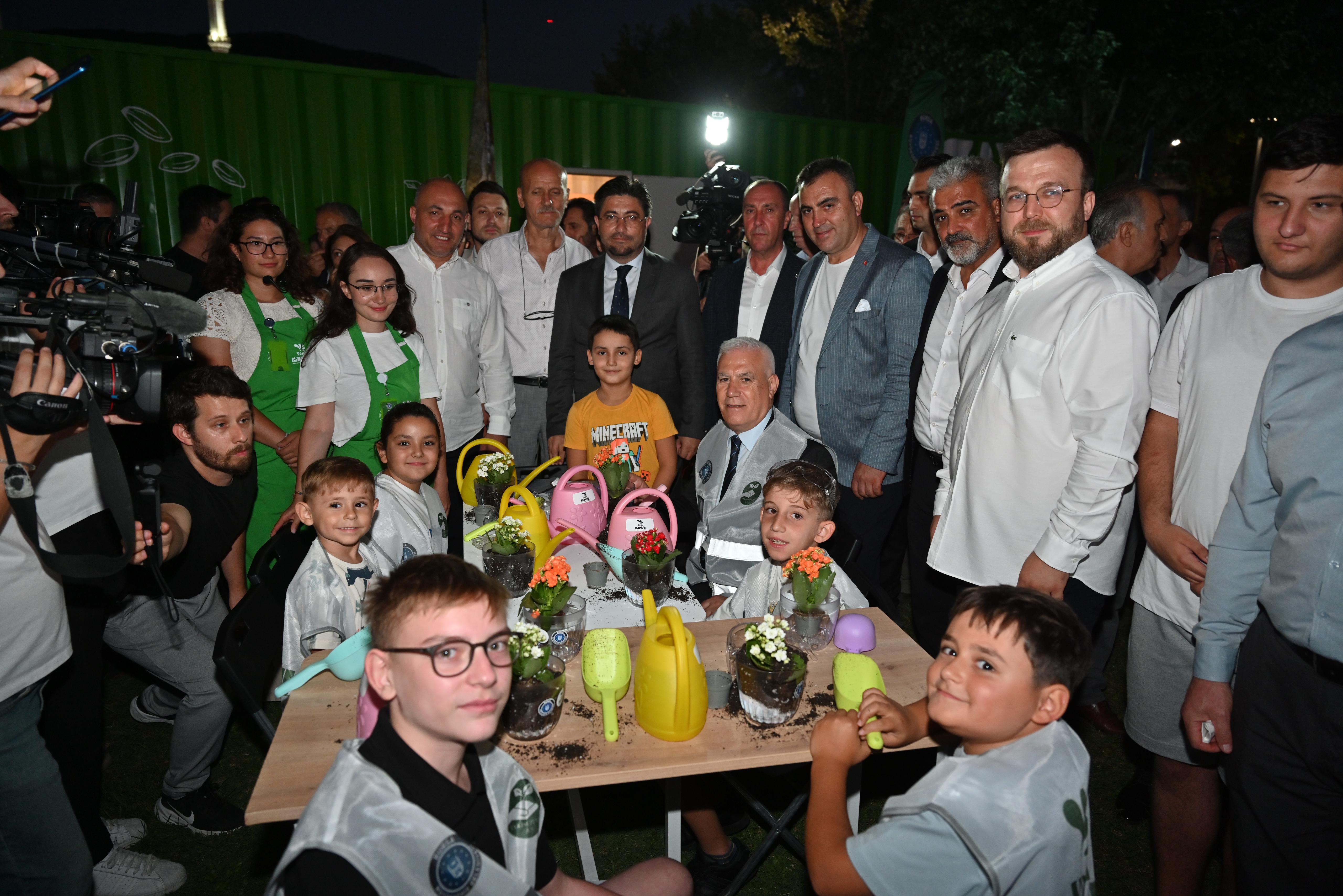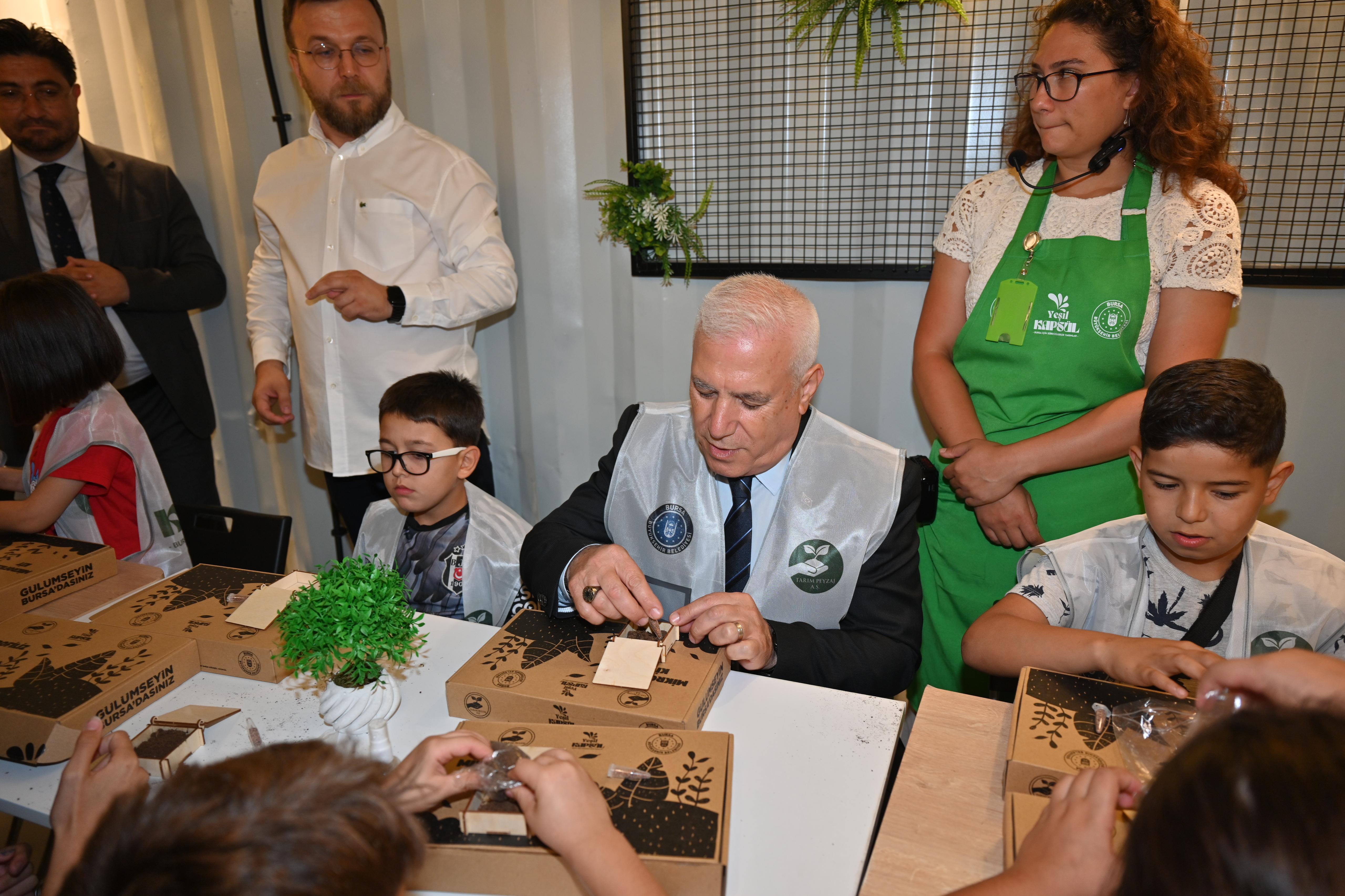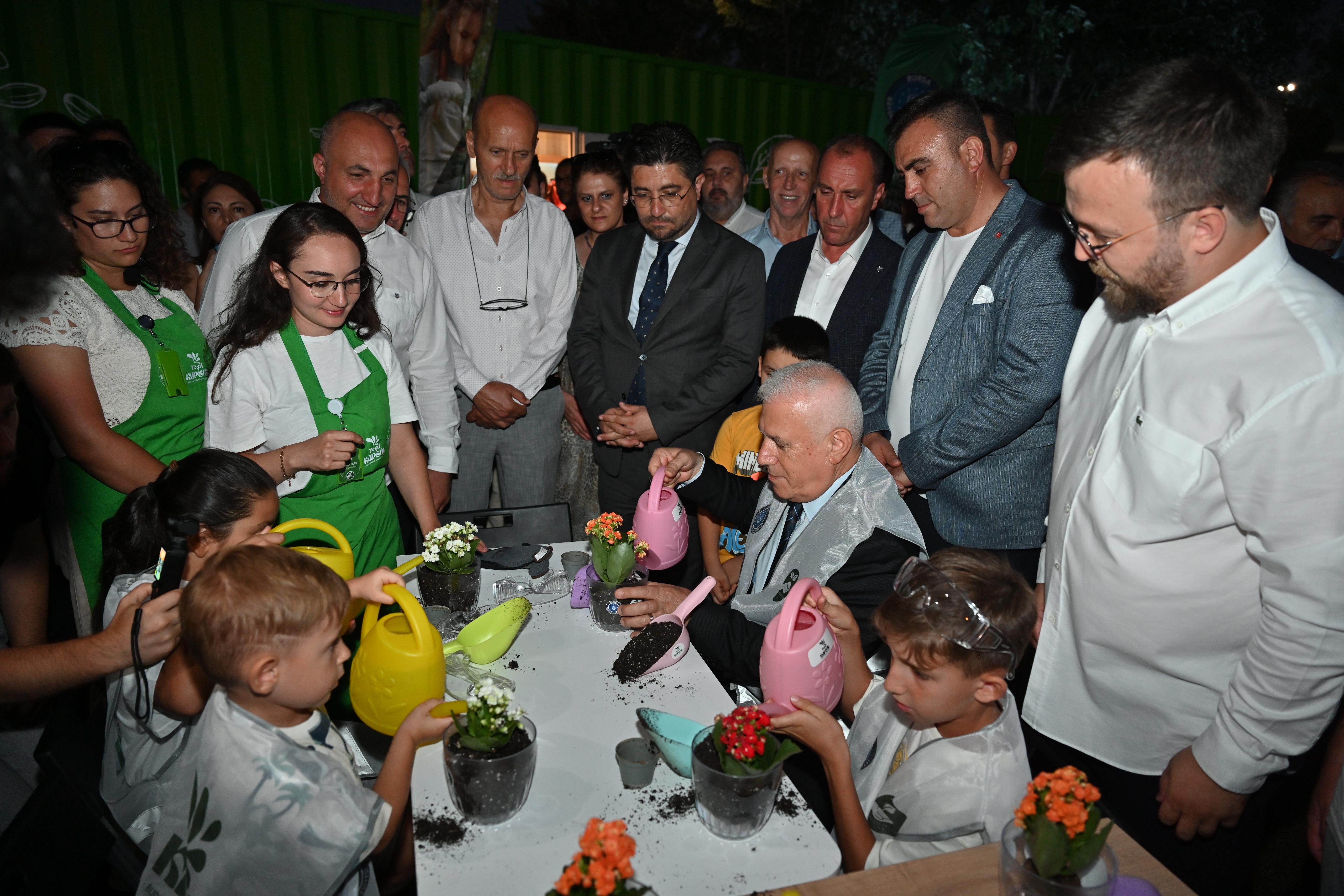 Açılış konuşmasının ardından Başkan Bozbey ve beraberindekiler tarafından açılış kurdelesinin kesilmesiyle proje alanı ziyarete açıldı. Mobil eğitim konteynerlerini gezerek sergiler hakkında bilgi alan Başkan Bozbey, minik katılımcılarla birlikte ‘Kendi Bitkini Üretme Atölyesi’ne de katıldı.