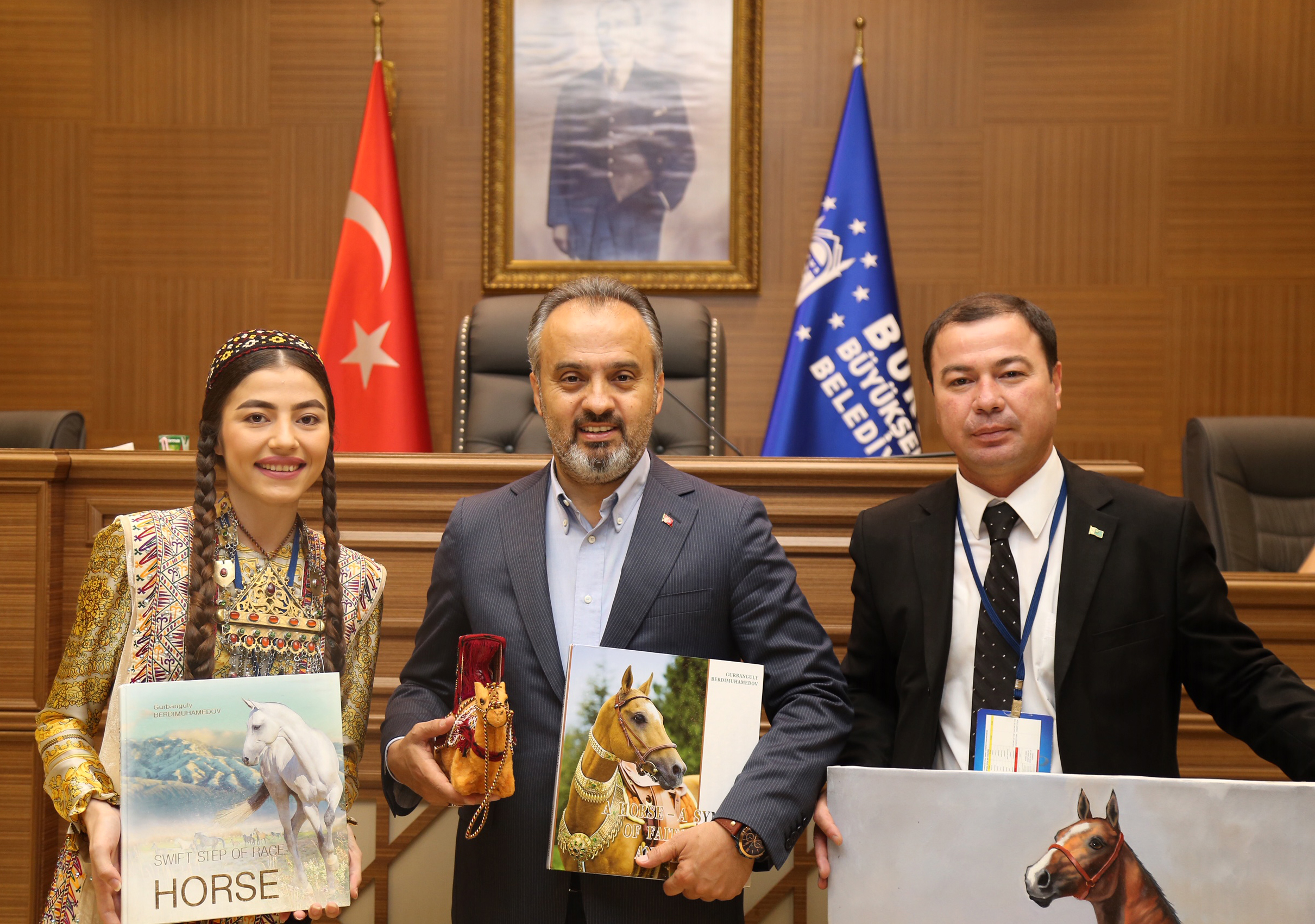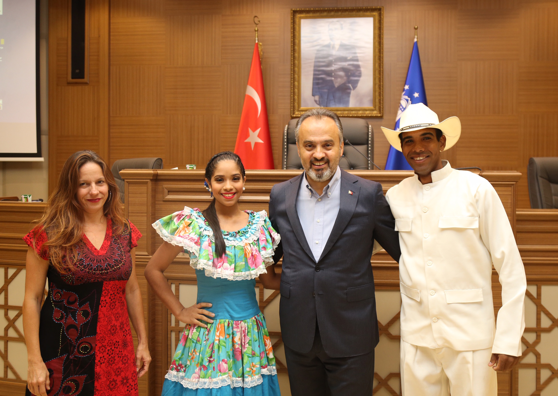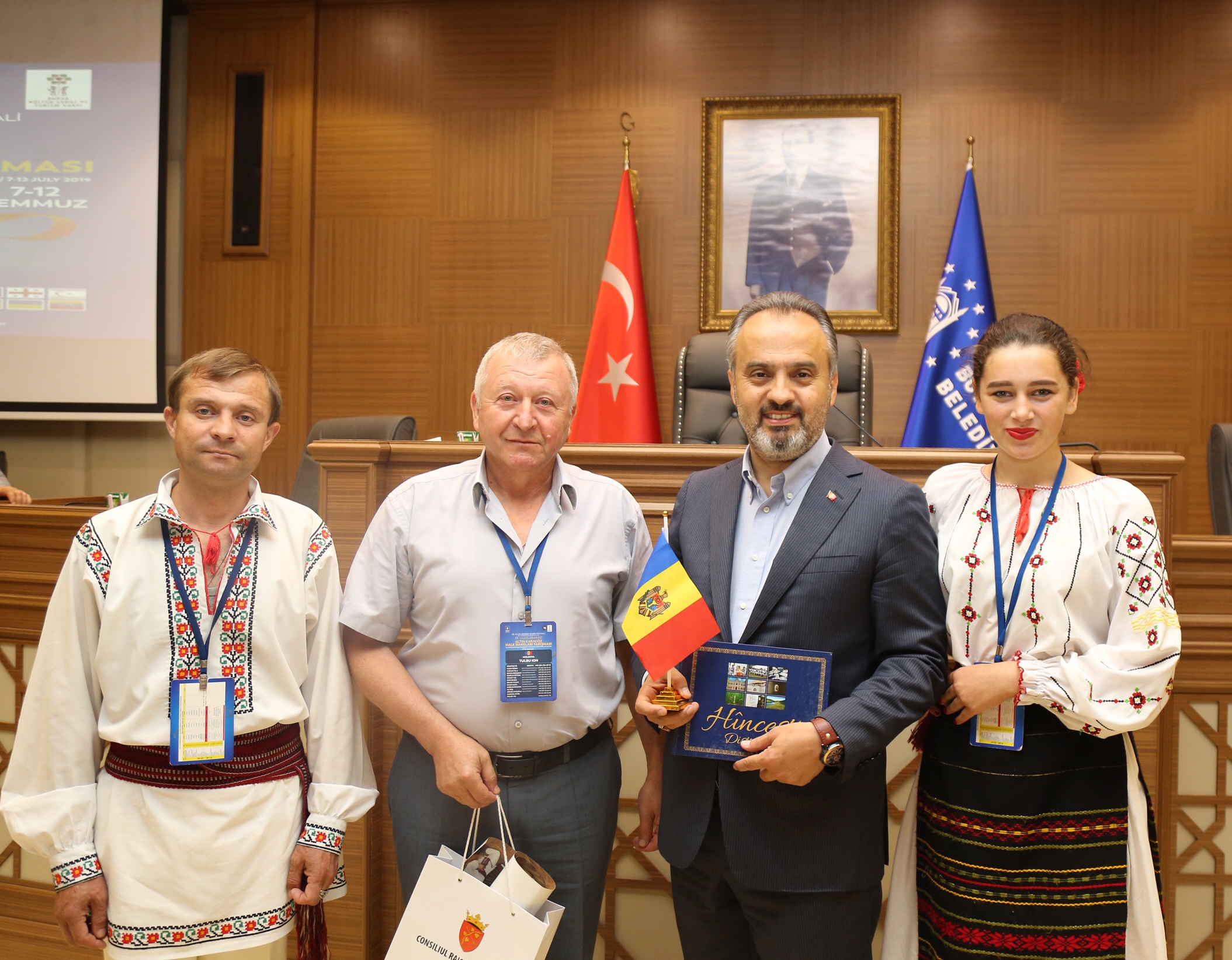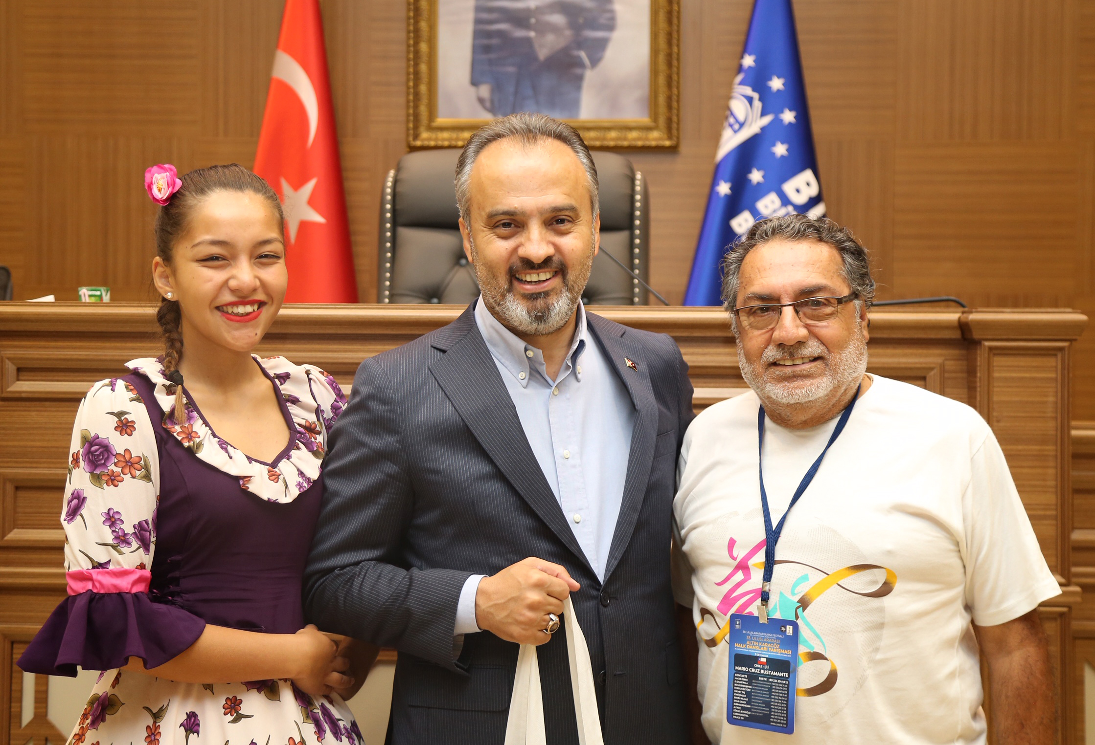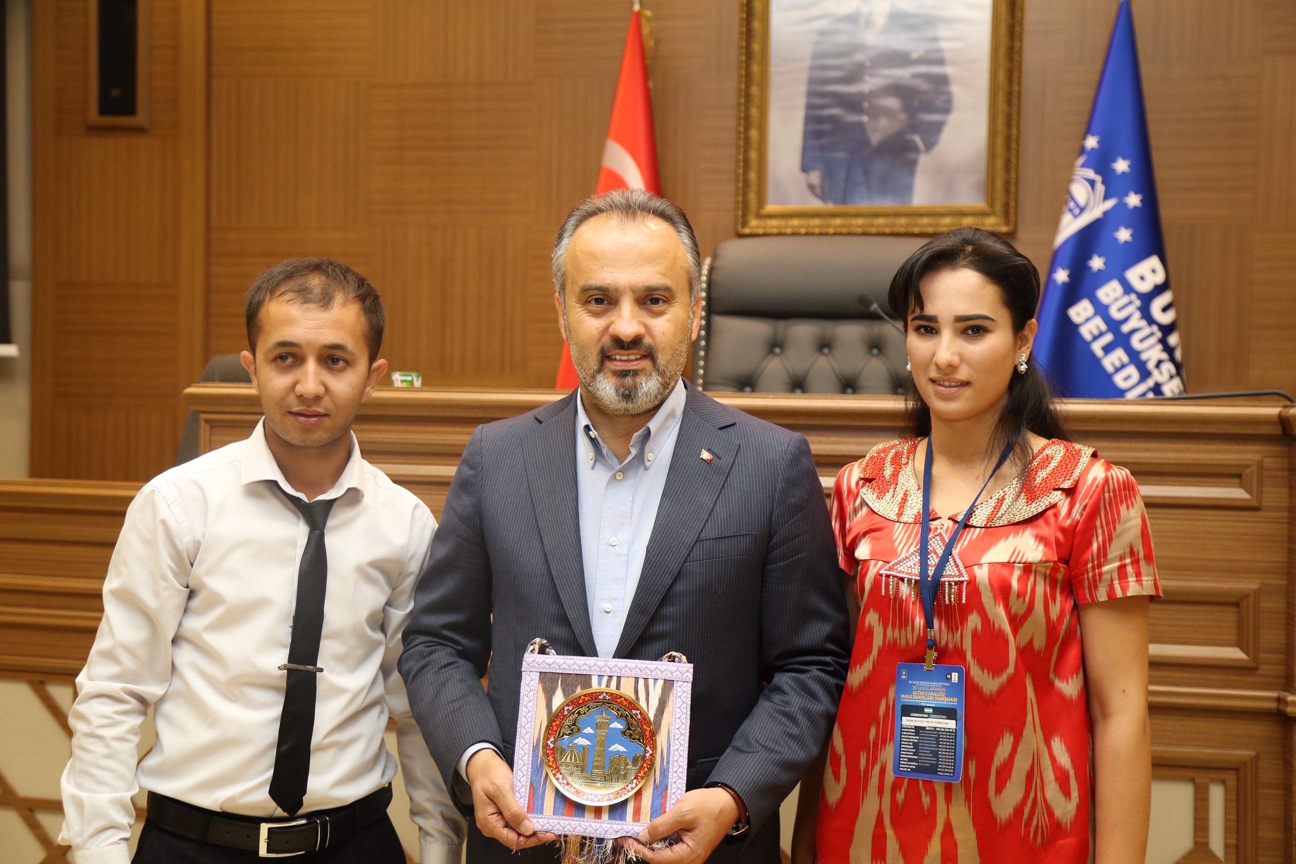 Büyükşehir Belediyesi adına Bursa Kültür Sanat ve Turizm Vakfı (BKSTV) tarafından gerçekleştirilen ’33. Uluslararası Bursa Altın Karagöz Halk Dansları Yarışması’nda final heyecanı tüm kenti sardı. Yarışmaya katılan ekipleri temsilen dansçılar, Bursa Büyükşehir Belediye Başkanı Alinur Aktaş’ı ziyaret etti. Başkan Aktaş, halk dansları ekipleriyle Büyükşehir Belediyesi Meclis Salonu’nda bir araya geldi. Yöresel kostümleriyle dikkati çeken dansçılarla tek tek selamlaşıp sohbet eden Başkan Aktaş, konuklarına Bursa’yı anlattı.