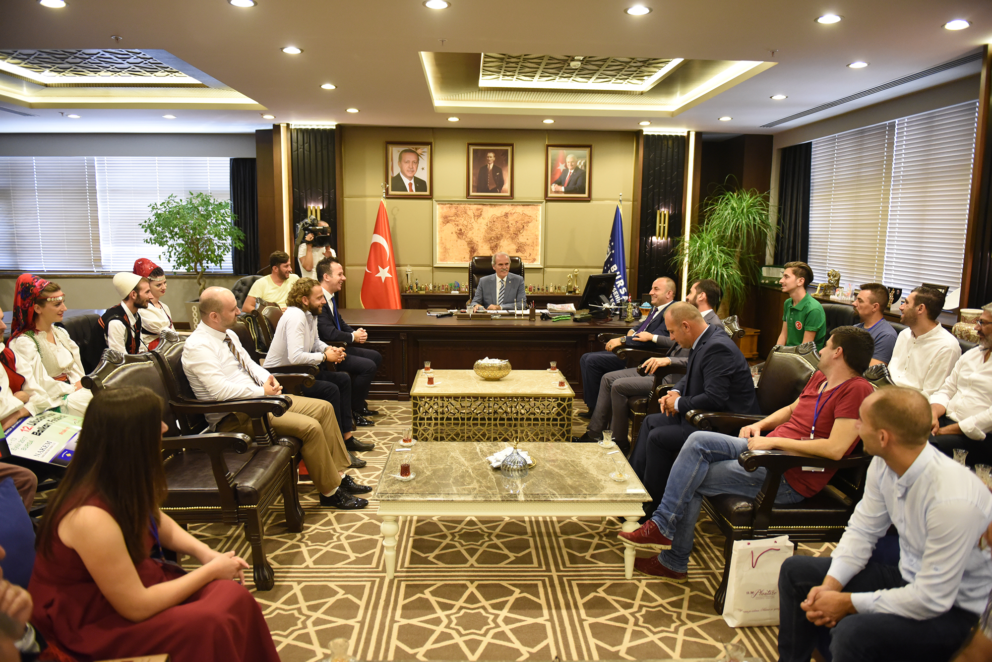 Gelenekselleşen festival nedeniyle Makedonya, Sırbistan, Bosna Hersek, Kosova, Karadağ, Arnavutluk, Bulgaristan ve Kıbrıs’tan gelen halk oyunları ekiplerinin temsilcileri, Büyükşehir Belediye Başkanı Recep Altepe’yi ziyaret etti. Ankara Yolu’ndaki başkanlık binasında gerçekleşen buluşmada dansçılar, Balkan ülkelerine verdiği destek ve düzenlenen organizasyon nedeniyle Başkan Altepe’ye teşekkür etti.
