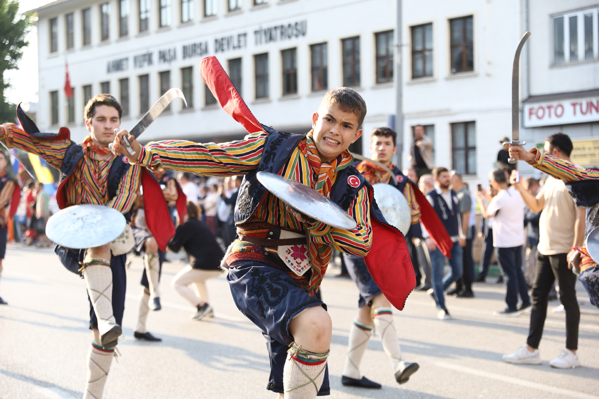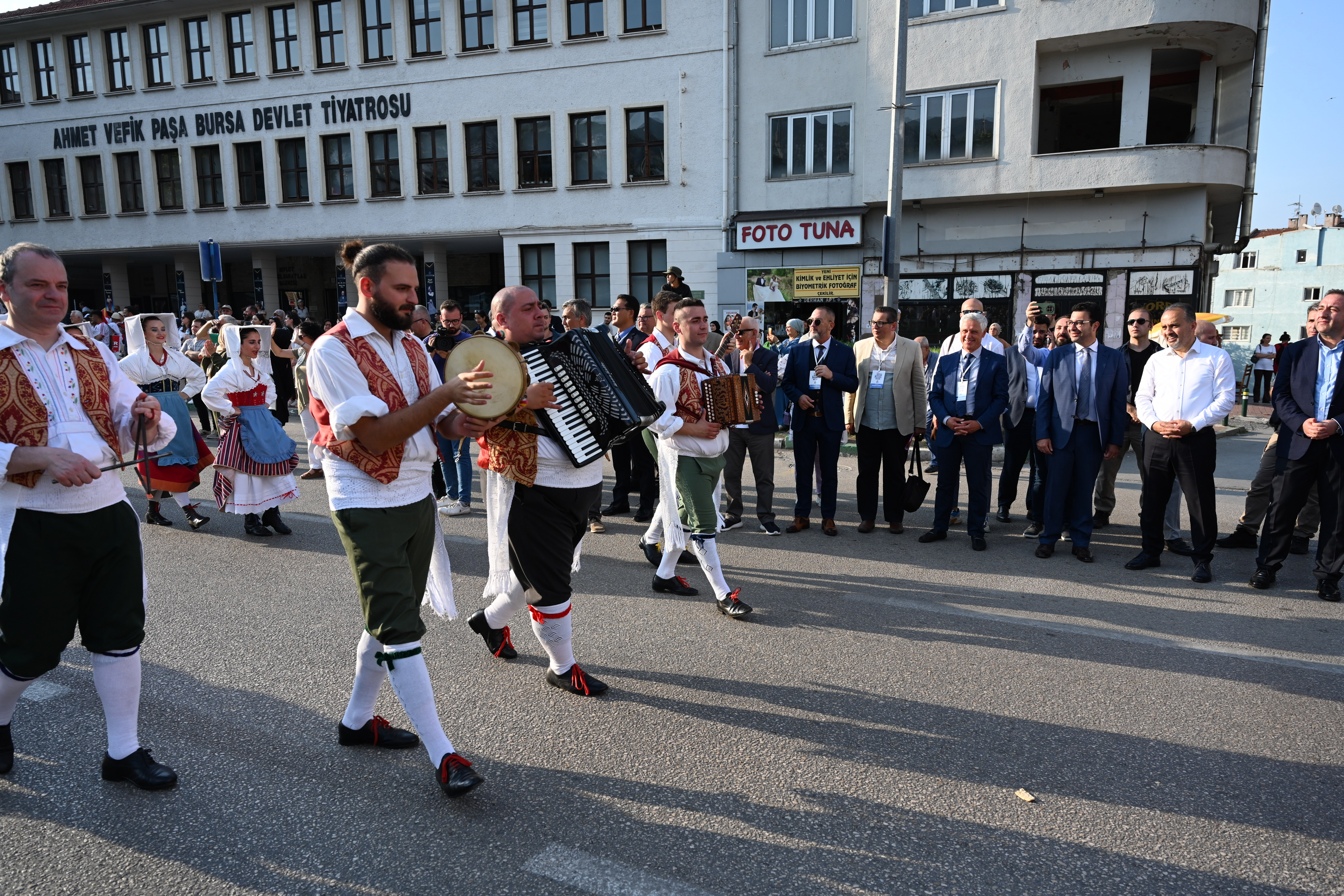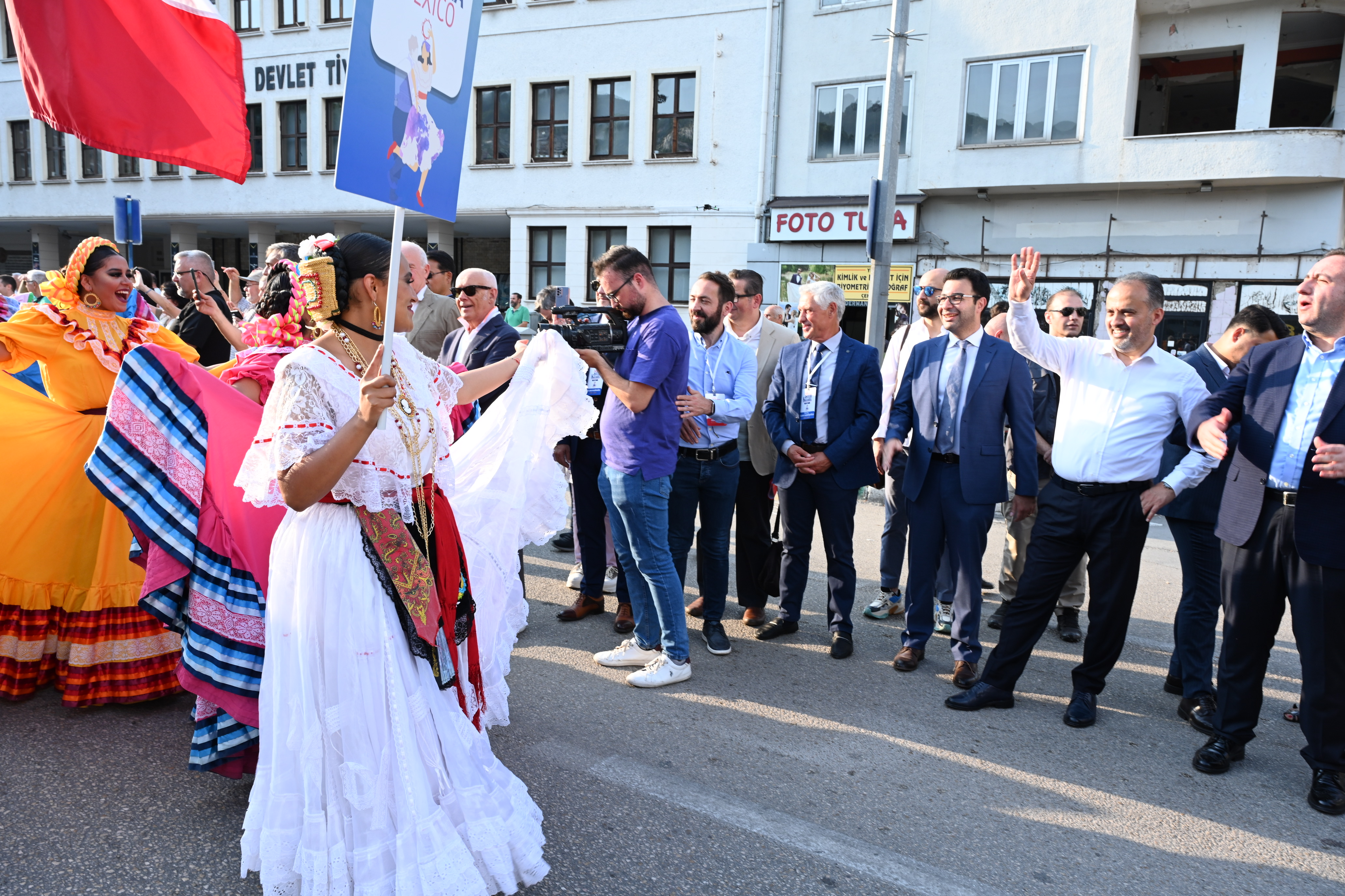 BKSTV Başkanı Sadi Etkeser de Bursa Büyükşehir Belediyesi’nin katkıları ve Kültür ve Turizm Bakanlığı’nın destekleriyle yapılan Altın Karagöz Halk Dansları Yarışması’nın dünyada sayılı halk dansları organizasyonları arasında gösterildiğini belirtti. Farklı kültür ve inanışları Bursa’da buluşturduklarını dile getiren Etkeser, yarışmanın dünya barışına katkı sağlamasını temenni etti. Konuşmaların ardından yerli ve yabancı halk dansları ekiplerinin katılımıyla renkli kortej yürüyüşü başladı. Başkan Alinur Aktaş ve beraberindekiler, kortejdeki yerli ve yabancı halk dansları ekiplerini alkışlayarak selamladı. Cumhuriyet Caddesi üzerinden Kültürpark’a kadar süren kortejde, yabancı ekipler yöresel danslarıyla kendilerini tanıttı.