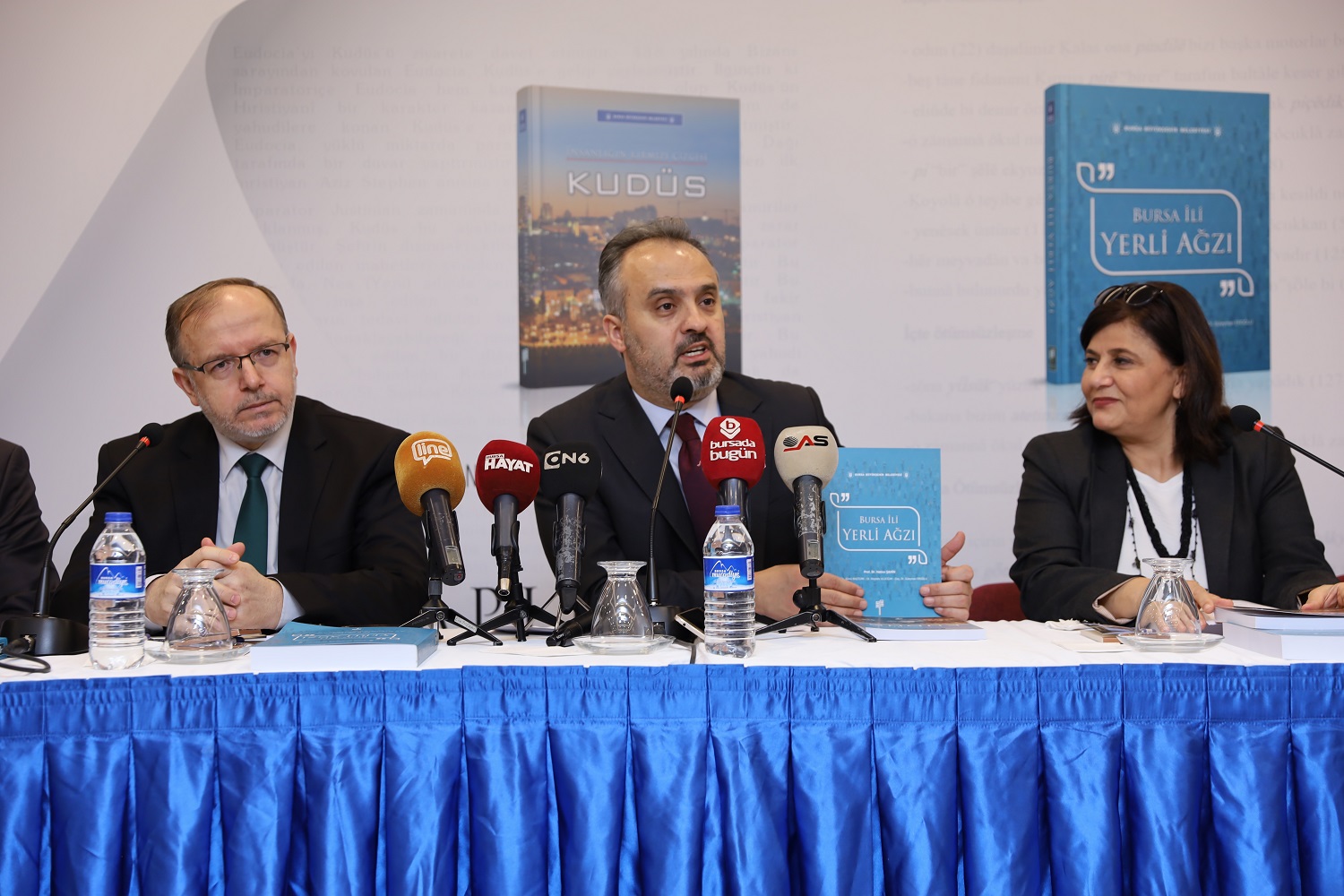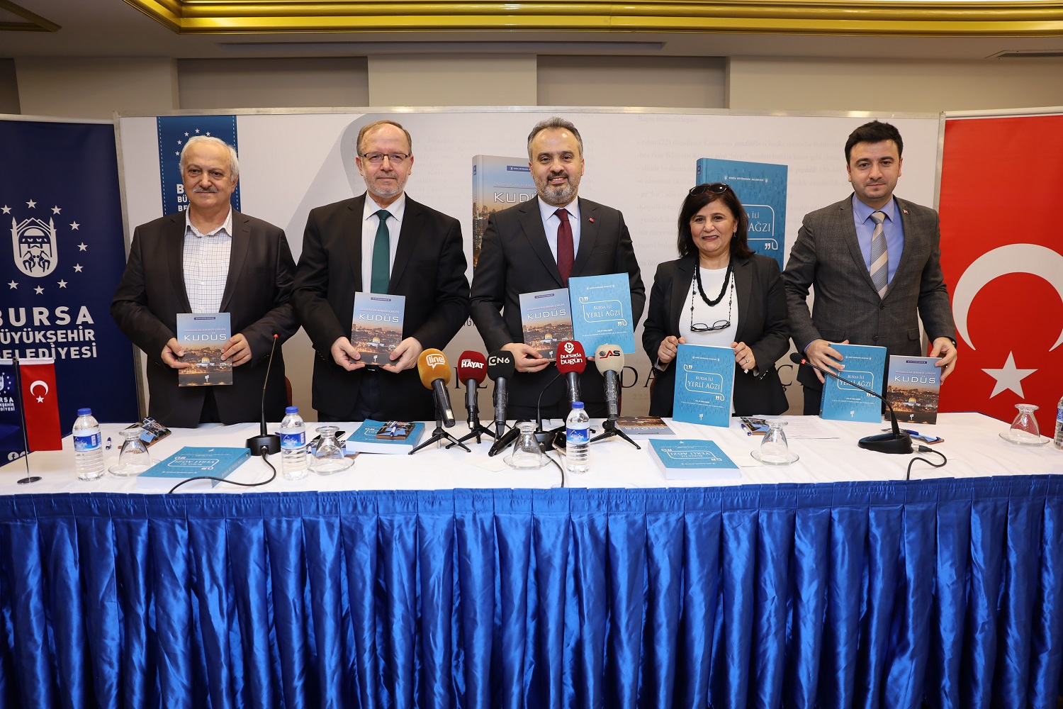 Büyükşehir Belediyesi Basın Yayın ve Halkla İlişkiler Dairesi tarafından hazırlanan ‘İnsanlığın Kırmızı Çizgisi: Kudüs’ ve ‘Bursa İli Yerli Ağzı’ isimli kitapların tanıtımı, Tayyare Kültür Merkezi’nde yapıldı. Toplantıya; Büyükşehir Belediye Başkanı Alinur Aktaş ve ‘İnsanlığın Kırmızı Çizgisi: Kudüs’ kitabının yazarı Prof.Dr. Mefail Hızlı ile ‘Bursa İli Yerli Ağzı’ kitabının yazarı Prof.Dr. Hatice Şahin de katıldı.