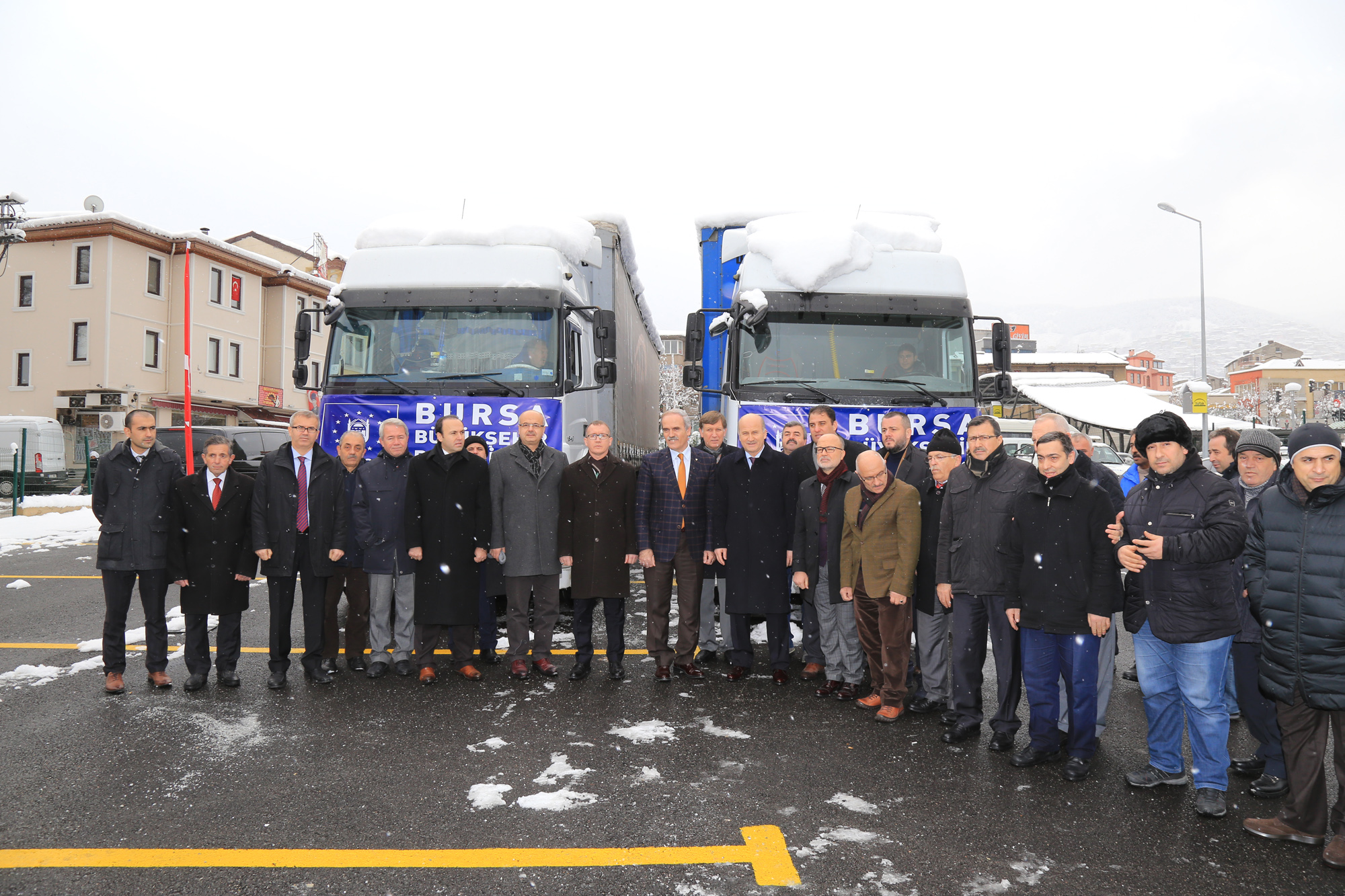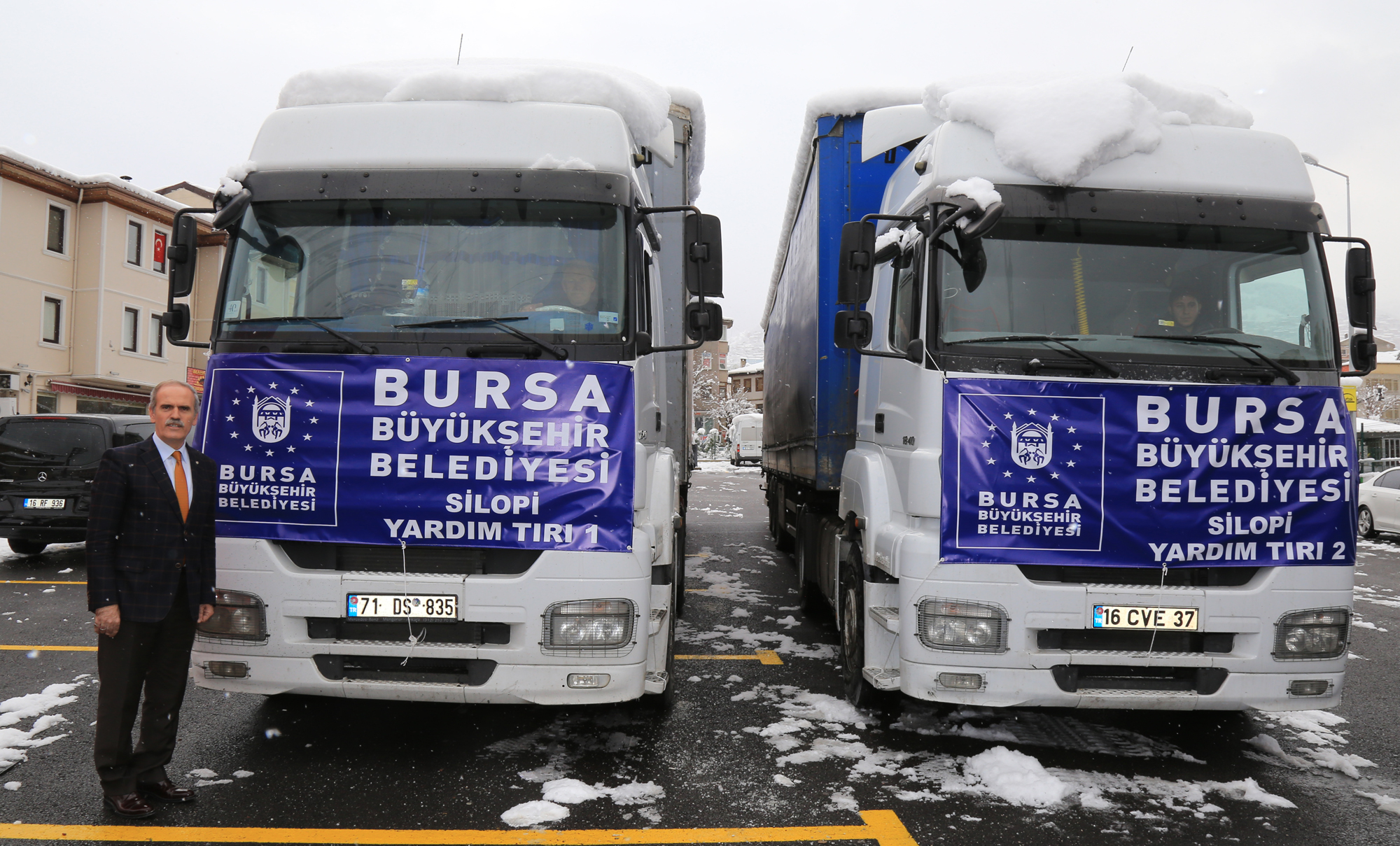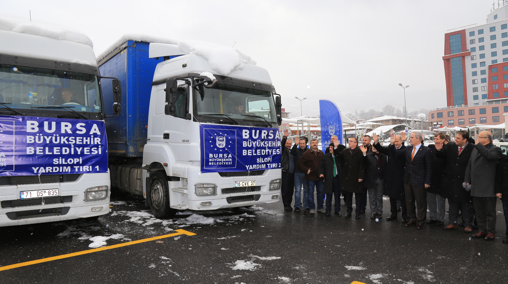 Terör ya da doğal afetler nedeniyle sıkıntı yaşayan insanların yaralarını bir nebze de olsa sarmak amacıyla Bursa’da başlatılan yardımlar, Büyükşehir Belediyesi’nin desteğiyle artarak devam ediyor. Büyükşehir Belediyesi’nin koordinasyonunda hayırsever iş adamlarının katkılarıyla toplanan ve gıda ile giyim malzemelerinden oluşan 2 tır dolusu yardım, Doğanbey Otoparkı’nda düzenlenen törenin ardından terör ve soğuk kış günleri nedeniyle büyük mağduriyet yaşayan Silopi halkına ulaştırılmak üzere yola çıkarıldı.