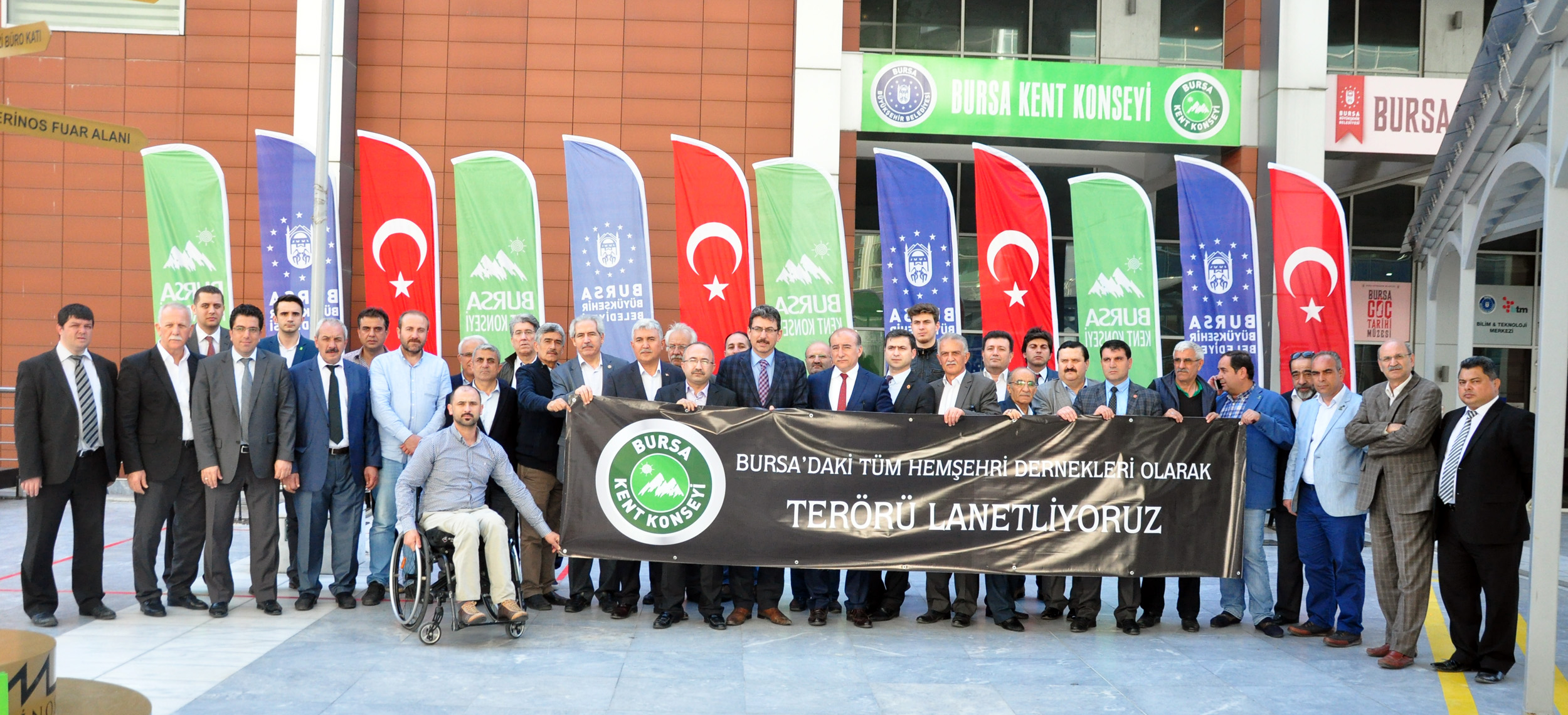 Bursa Kent Konseyi çatısı altında bir araya gelen hemşehri derneklerin temsilcileri ellerinde ‘Terörü Lanetliyoruz’ yazılı pankart ile toplu fotoğraf çektirdi. Dernek temsilcileri Bursa’dan kardeşlik mesajları verilmesine öncülük eden Bursa Kent Konseyi Başkanı Hasan Çepni’ye de teşekkür ettiler.