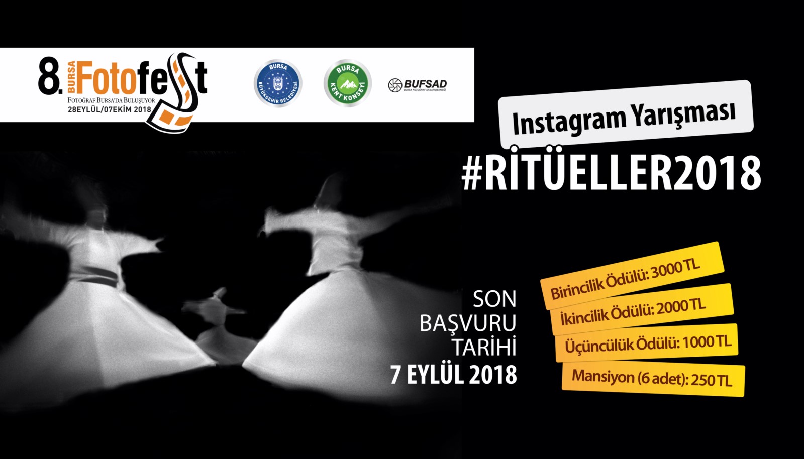 Bursa Büyükşehir Belediyesi, Bursa Kent Konseyi ve BUFSAD işbirliğiyle bu yıl 28 Eylül – 07 Ekim 2018 tarihleri arasında 8.’si düzenlenecek olan ve küratörlüğünü Kamil Fırat’ın üstlendiği Bursa Uluslararası Fotoğraf Festivali (BursaFotoFest) kapsamında ‘Ritüeller’ temalı Instagram Fotoğraf Yarışması gerçekleştiriliyor. Fotoğraf tutkunlarının Instagram üzerinden #Ritüeller2018 etiketi ile başvurabileceği fotoğraf yarışması için son tarih ise 07 Eylül. ‘Dünya’da Ritüelleri en iyi anlatan fotoğrafı çek, paylaş, kazan’ sloganıyla gerçekleşen fotoğraf yarışmasına katılmak için kişisel Instagram hesabında #Ritüeller2018 hashtagi ile fotoğraf paylaşılması ve @bursafotofest Instagram hesabını etiketleyerek takip edilmesi gerekiyor. Katılımcılar detaylı bilgi için www.bursaphotofest.org sitesi üzerinden Instagram Fotoğraf Yarışması’nın şartnamesine ulaşabilirler.