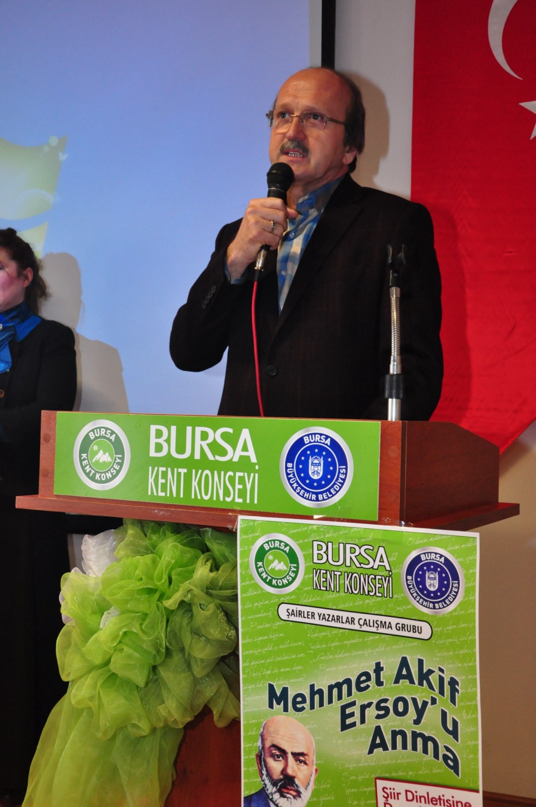 Bursa’da şair ve yazarları buluşturarak şehrin kültürel hayatına katkıda bulunan BKK Şairler ve Yazarlar Çalışma Grubu, İstiklal Marşı’nın yazarı Mehmet Akif Ersoy’u ölümünün 77. yıldönümünde düzenledikleri şiir dinletisiyle andı. Saygı duruşu ve İstiklal Marşı’nın okunmasının ardından konuşan BKK Şairler Yazarlar Çalışma Grubu Temsilcisi Faruk Anbarcıoğlu, Anadolu’ya mal olmuş değerli insanları şiirlerle anmaktan çok yaşadıklarını anlamaya çalıştıklarını söyledi. Mehmet Akif’in çeşitli dizelerinden alıntılar yapan Anbarcıoğlu, “Tarih içindeki değerlerini hatırlamak, anmak, anlatmak ve anlamaya çalışmak bir milletin en büyük vicdan borcudur. Artık yüreklerimiz Mehmet Akif gibi sağlam duruşlu kimlikleri zor yetiştiriyor. Adam gibi adamlar yetiştiren medeniyetimizi daha iyi analiz etmeye ihtiyacımız var. O yüksek medeniyeti çağa taşımaya mecburuz. Aksi takdirde çorak yürekler yetiştirmek zorunda kalırız. Hal böyle olunca doğru düzgün şiirler de ortaya çıkmaz. Şiir önce yürekte başlar. Mehmet Akif de Allah sevgisi, Peygamber sevgisi, vatan, millet sevgisi iç içeydi” dedi.