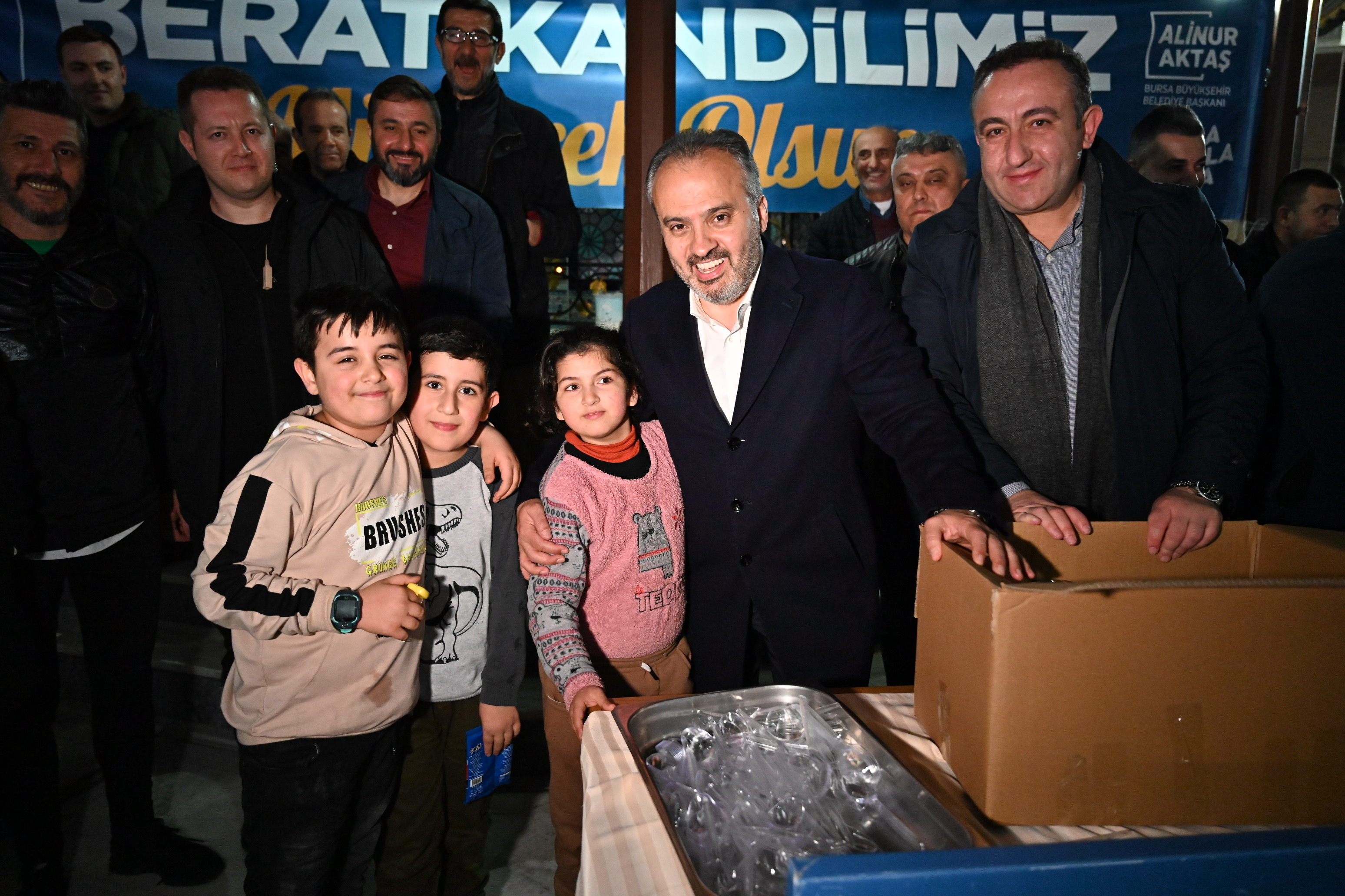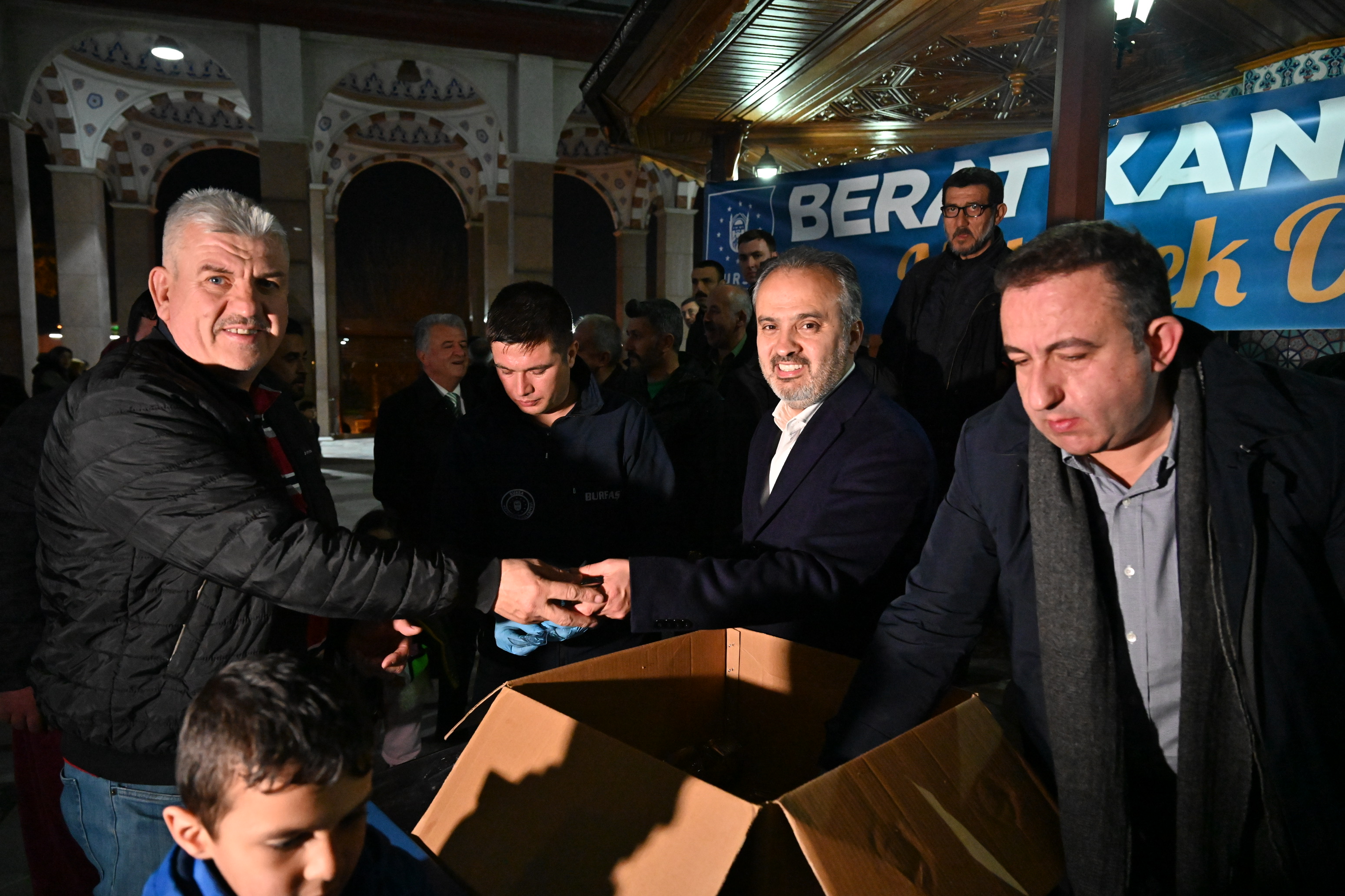 Ramazanın ayının habercisi olarak kabul edilen Berat Kandili, tüm yurtta ve İslam aleminde olduğu gibi Bursa’da da birlik, beraberlik, coşku ve heyecan içinde kutlandı. Bursalılar Ulu Cami başta olmak üzere selatin camilere akın ederken, Bursa Büyükşehir Belediye Başkanı Alinur Aktaş da Mihraplı Camii’nde vatandaşlarla buluştu. Vatandaşların kandilini tebrik eden Başkan Aktaş, cami çıkışı vatandaşlara helva ikram etti.
