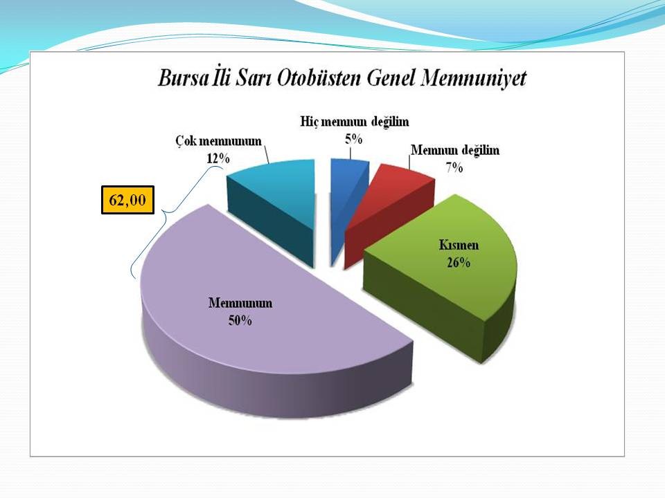 Bursa Büyükşehir Belediyesi’nin sarı otobüsleriyle de ilgili vatandaşların yüzde 62’si “memnunum” cevabını verdi. Halkın yüzde 26’sı “kısmen memnunum” derken, yüzde 5’inin sarı otobüslerden hiç memnun olmadığı belirlendi. Yıldırım ilçesinde halkın yüzde 68.88’i sarı otobüslerin hizmetlerinden memnun kalırken, yüzde 3.83’ü hiç memnun olmadığını, yüzde 7.78’inin ise memnun olmadığı öğrenildi. Osmangazi ilçesinde sarı otobüslerden halkın yüzde 57.91’inin memnun olduğu, yüzde 7.50´sinin ise memnun olmadığı belirtildi. Nilüfer ilçesinde ise halkın yüzde 61.87’sinin sarı otobüslerden memnun olduklarını, yüzde 3.89’unun ise hiç memnun olmadığı öğrenildi.