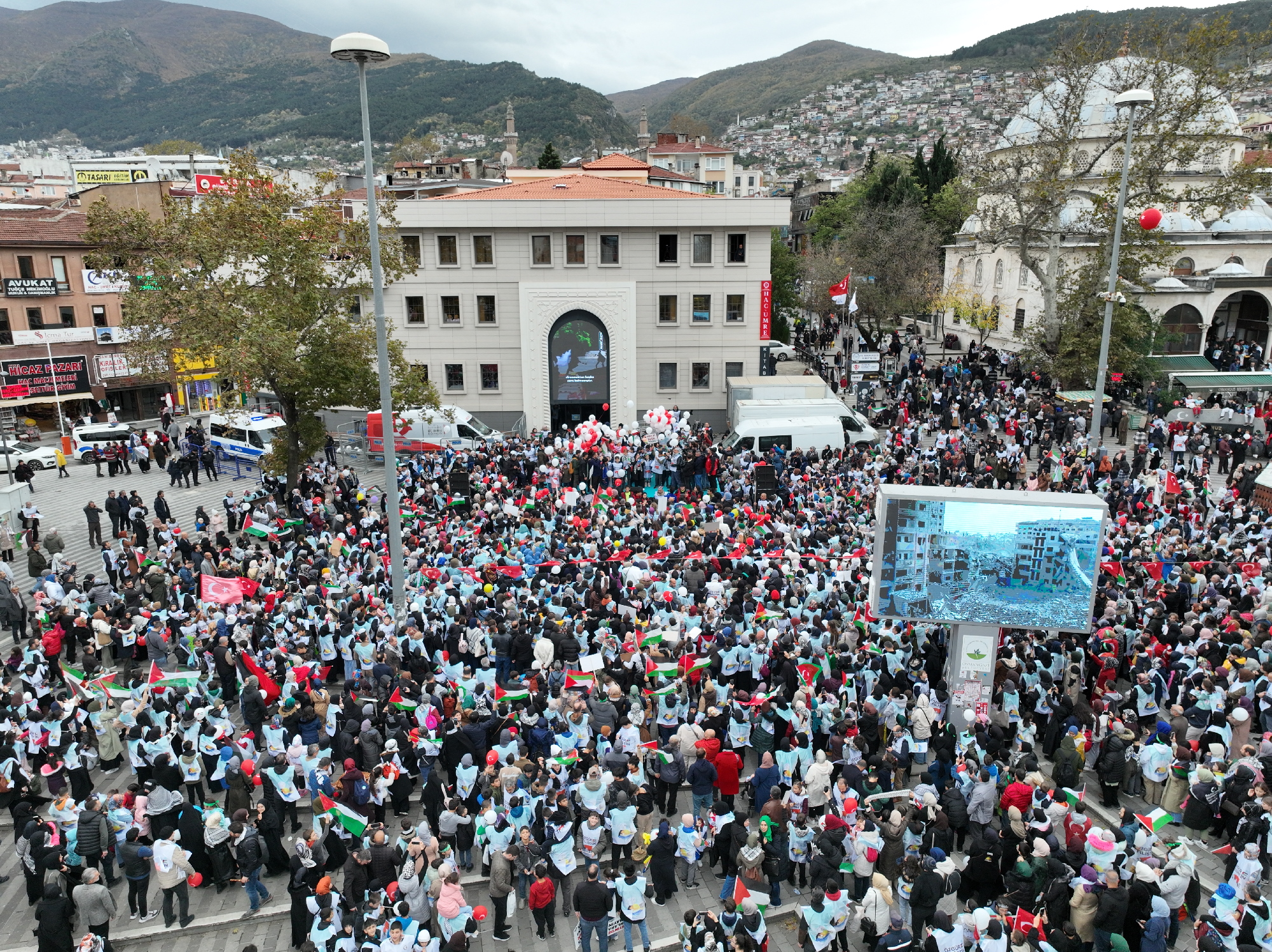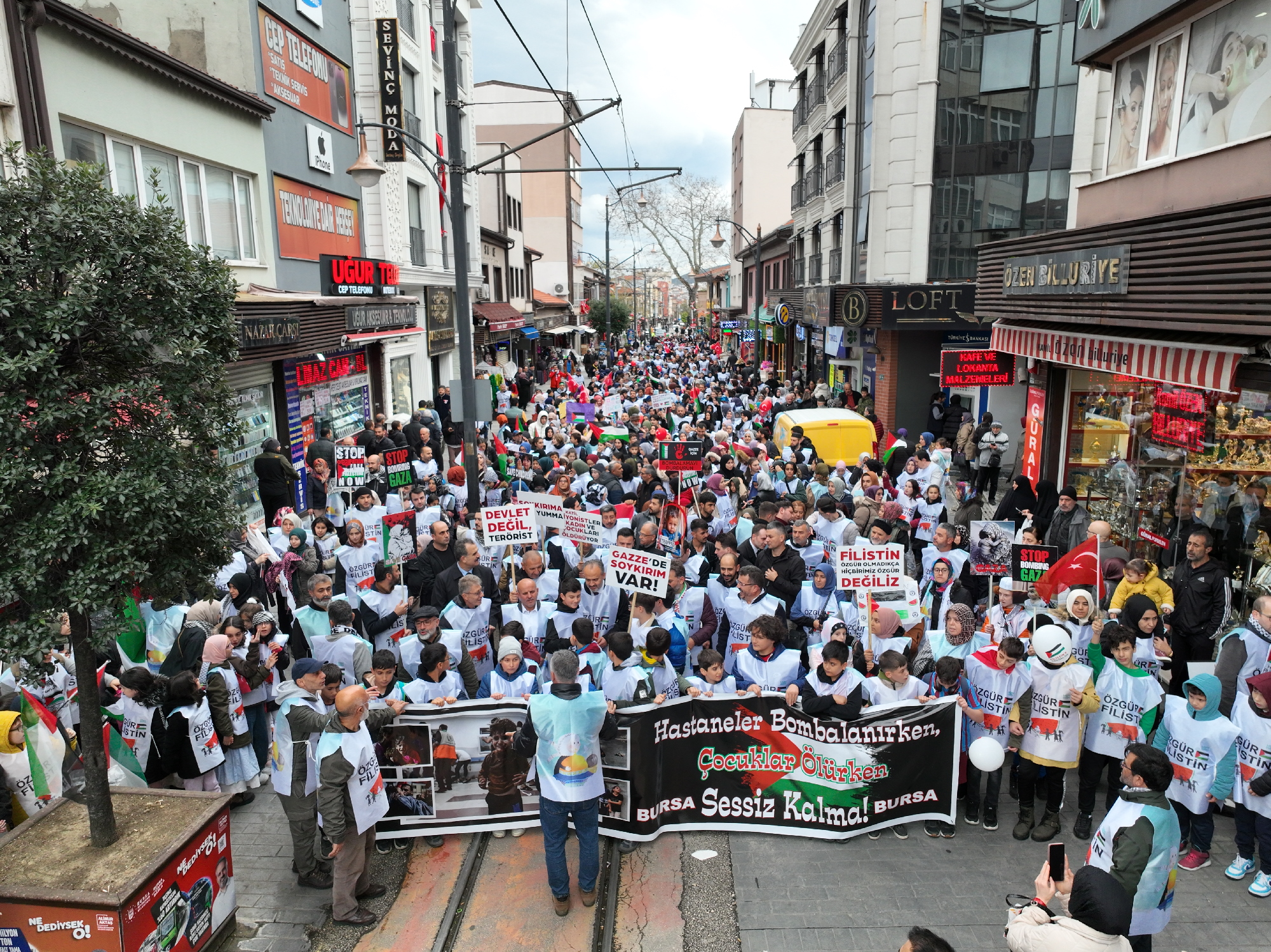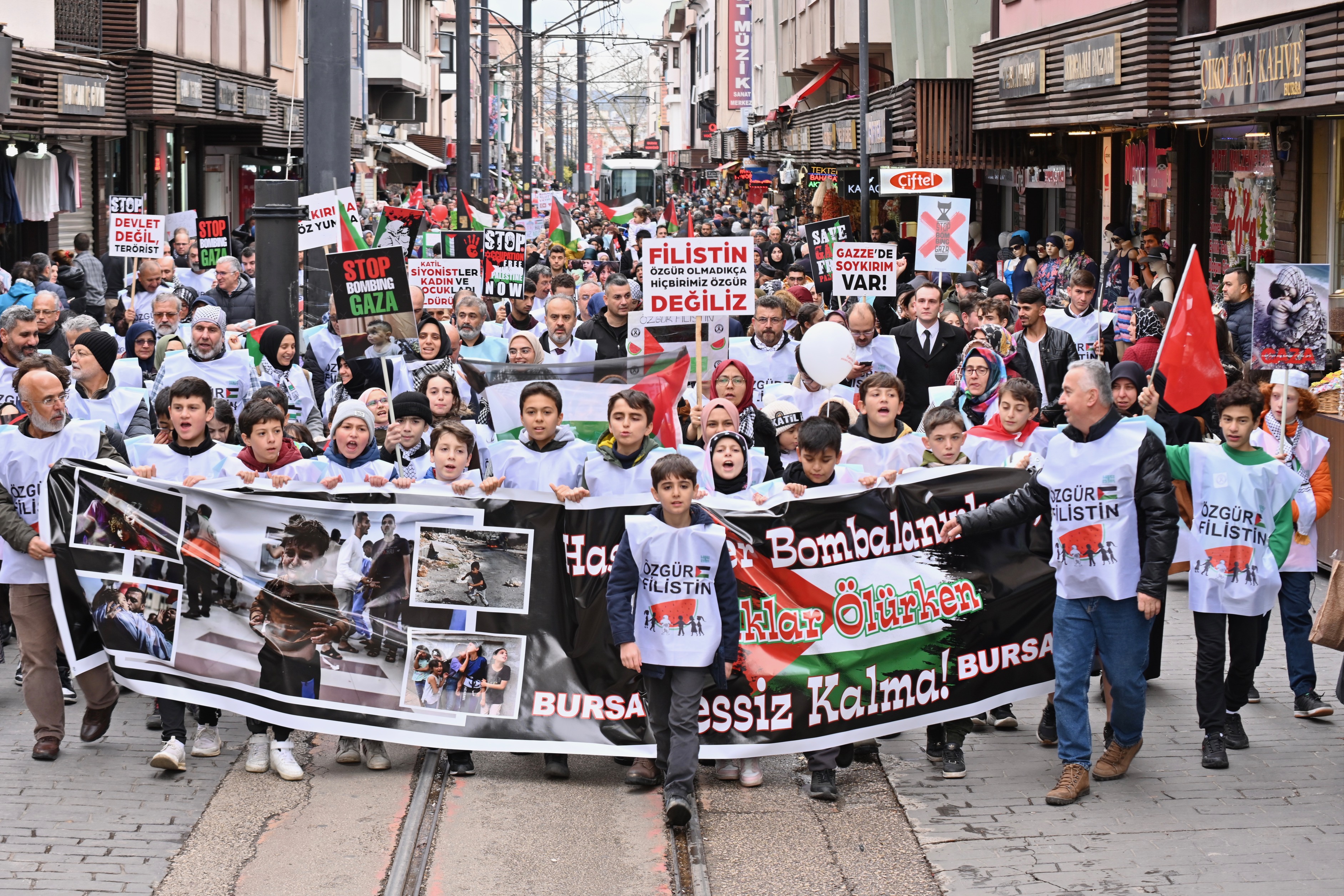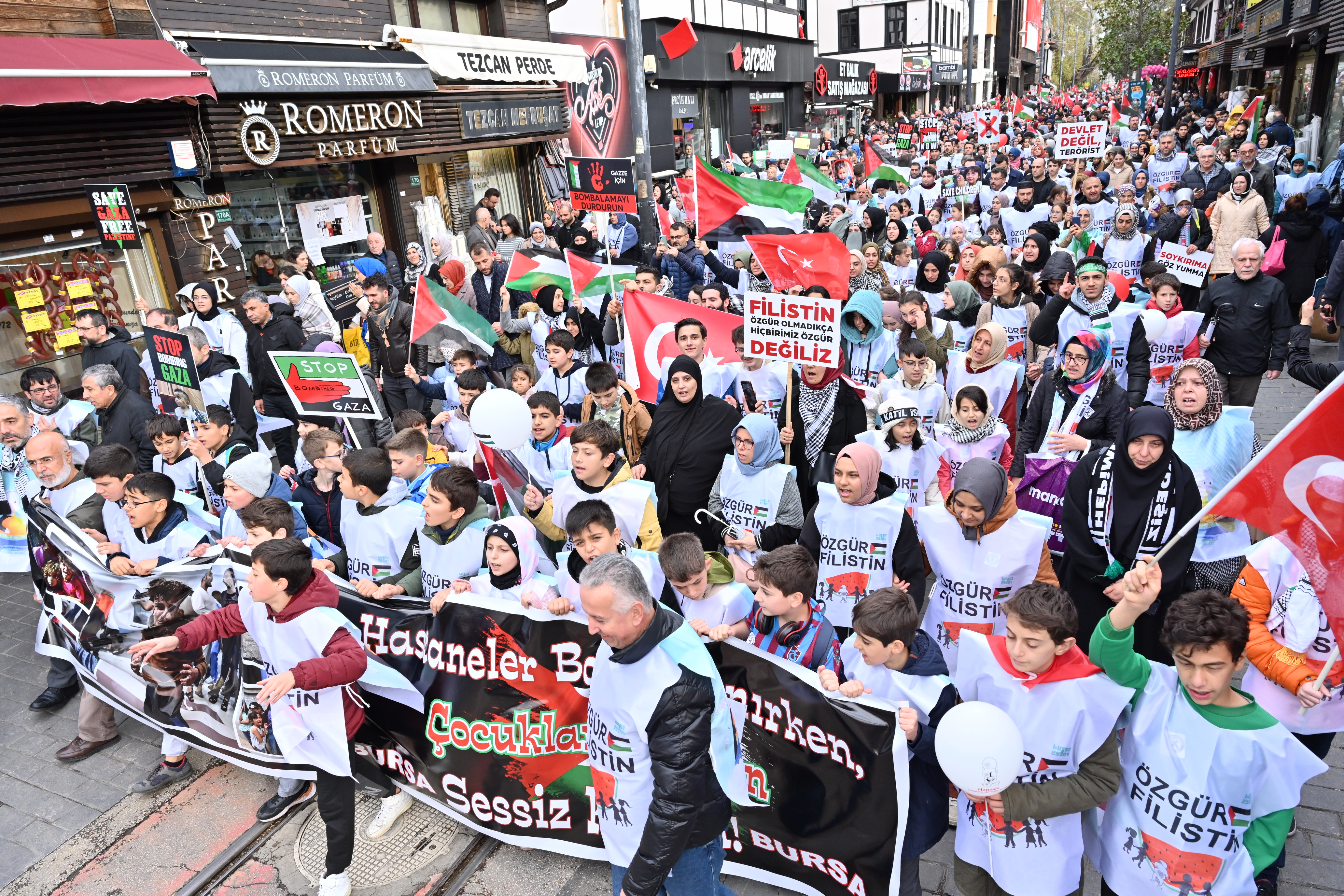 Daha sonra hem Tophane Meydanı hem Setbaşı Köprüsü’nden harekete geçen çocuklar Ahmet Vefik Paşa Tiyatrosu önünde toplanıp, Filistin’e özgürlük yürüyüşü başlattı. İnönü ve Cumhuriyet Caddesi üzerinden 15 Temmuz Demokrasi Meydanı’na kadar sloganlarla yürüyen çocuklara Bursa Büyükşehir Belediye Başkanı Alinur Aktaş ve Gönüllü Kuruluşlar Platformunu oluşturan kuruluşların yöneticileri de eşlik etti.