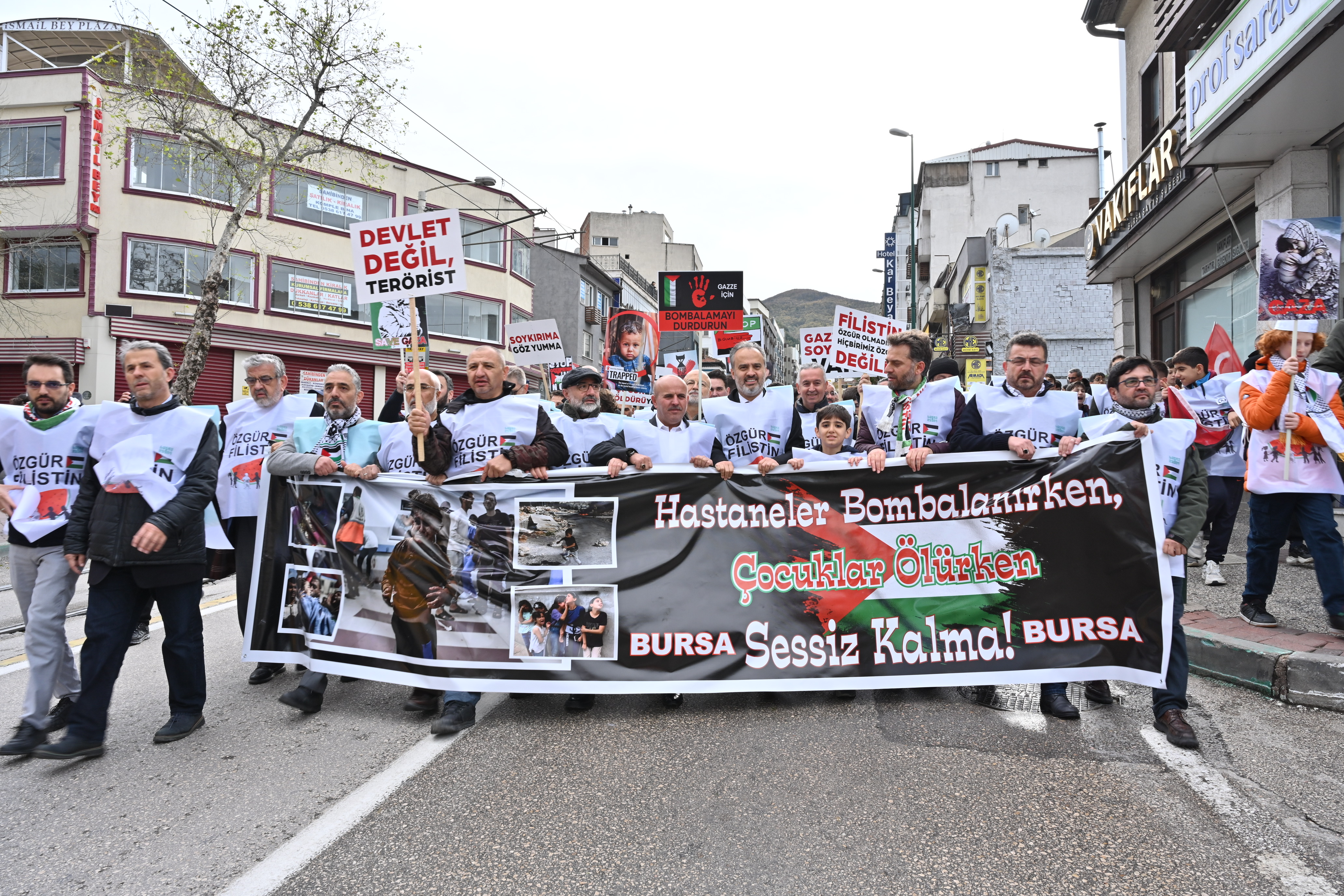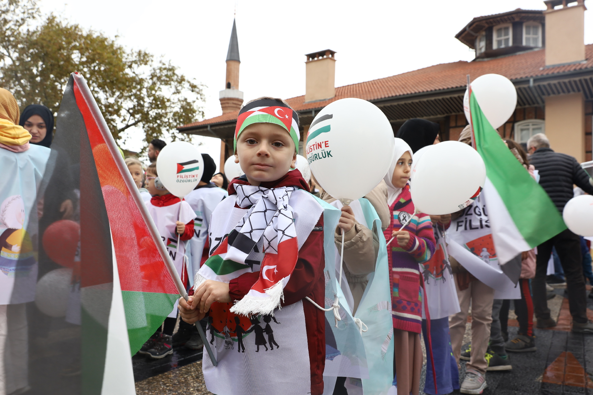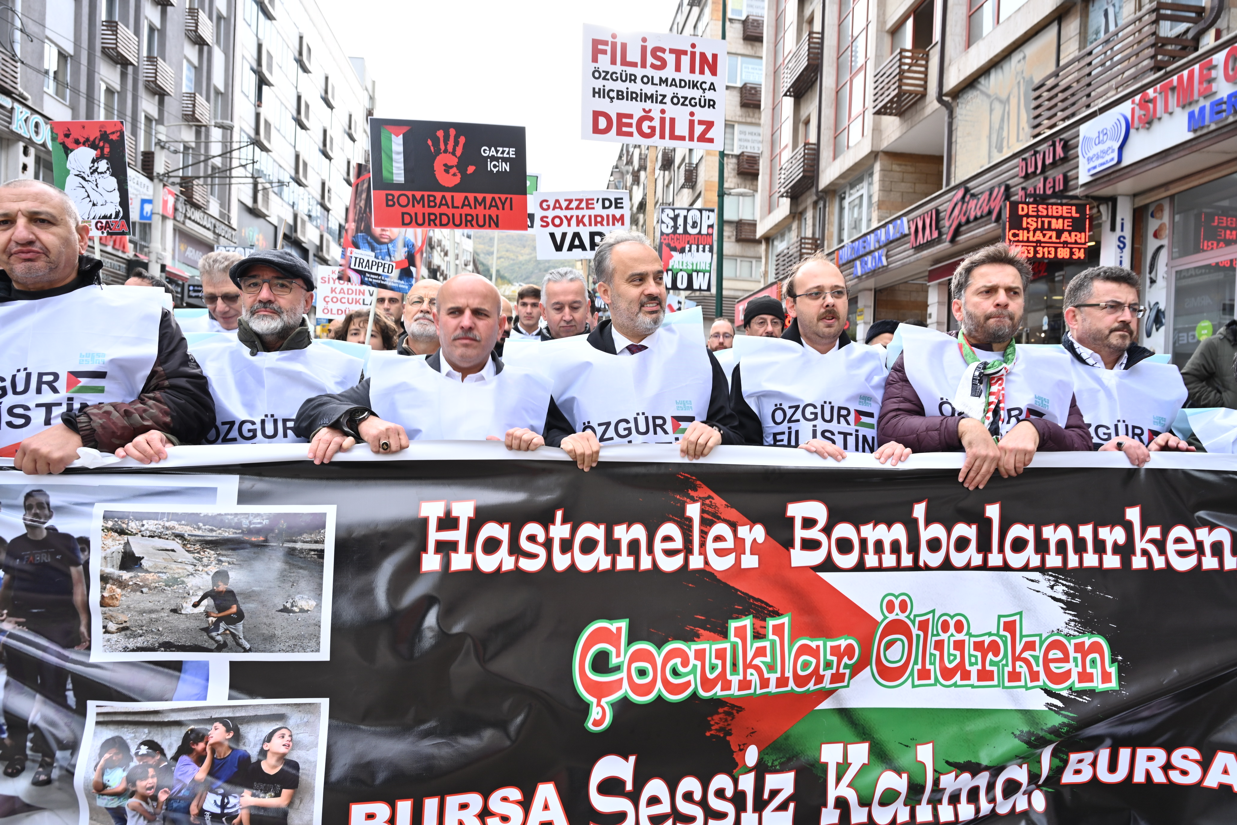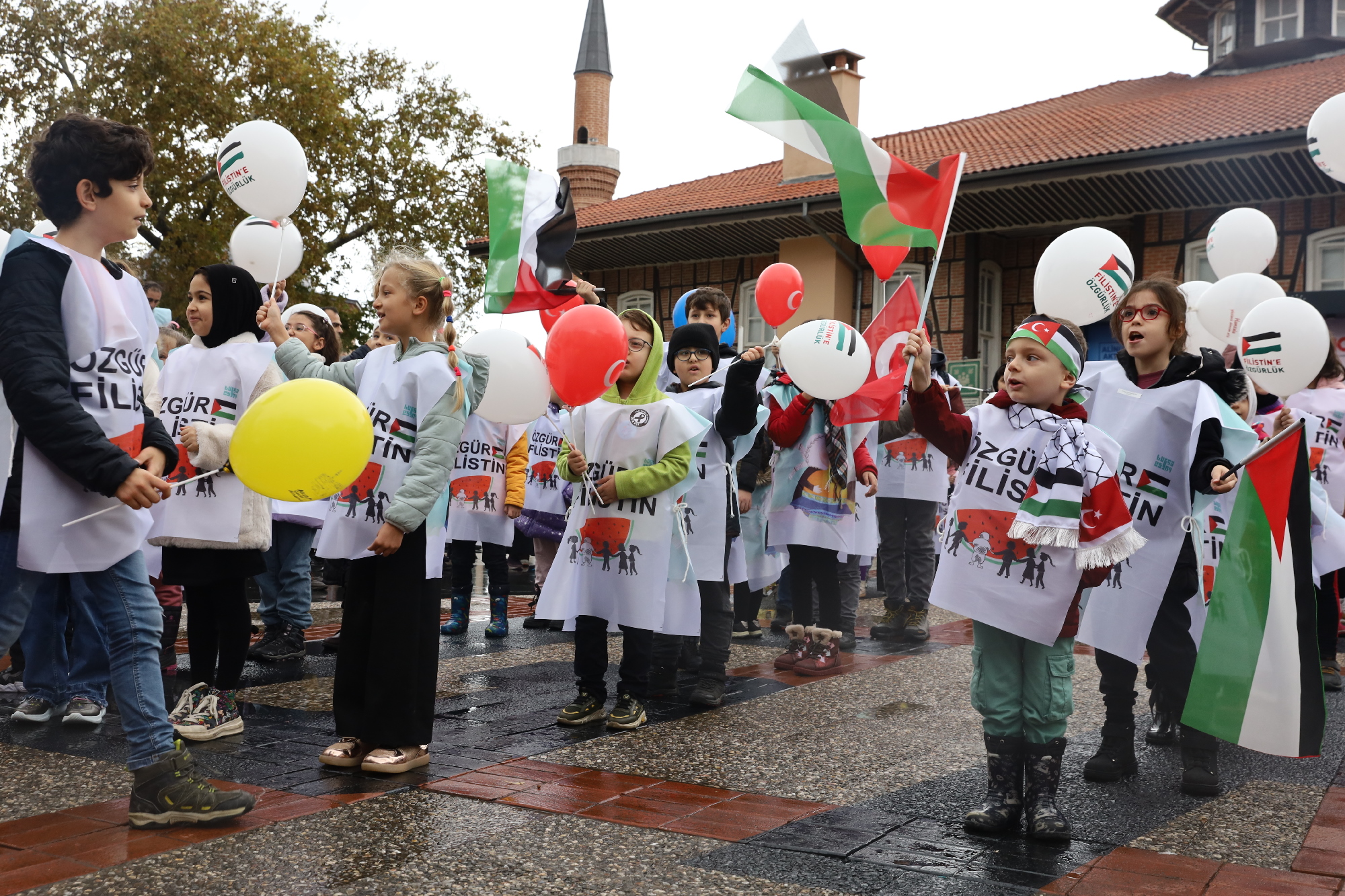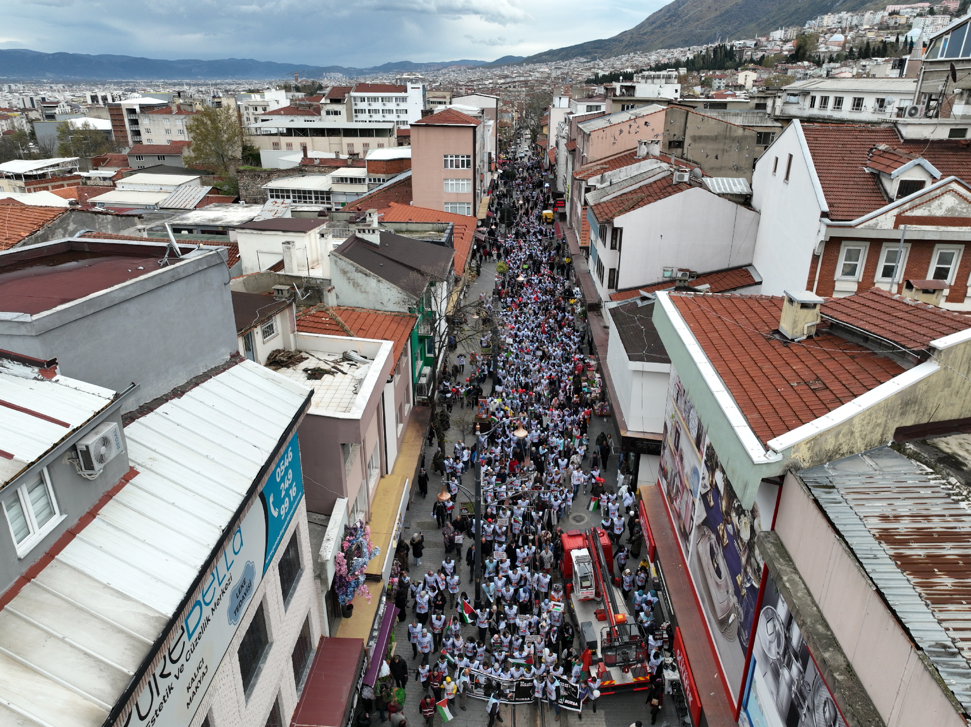 Daha sonra hem Tophane Meydanı hem Setbaşı Köprüsü’nden harekete geçen çocuklar Ahmet Vefik Paşa Tiyatrosu önünde toplanıp, Filistin’e özgürlük yürüyüşü başlattı. İnönü ve Cumhuriyet Caddesi üzerinden 15 Temmuz Demokrasi Meydanı’na kadar sloganlarla yürüyen çocuklara Bursa Büyükşehir Belediye Başkanı Alinur Aktaş ve Gönüllü Kuruluşlar Platformunu oluşturan kuruluşların yöneticileri de eşlik etti.