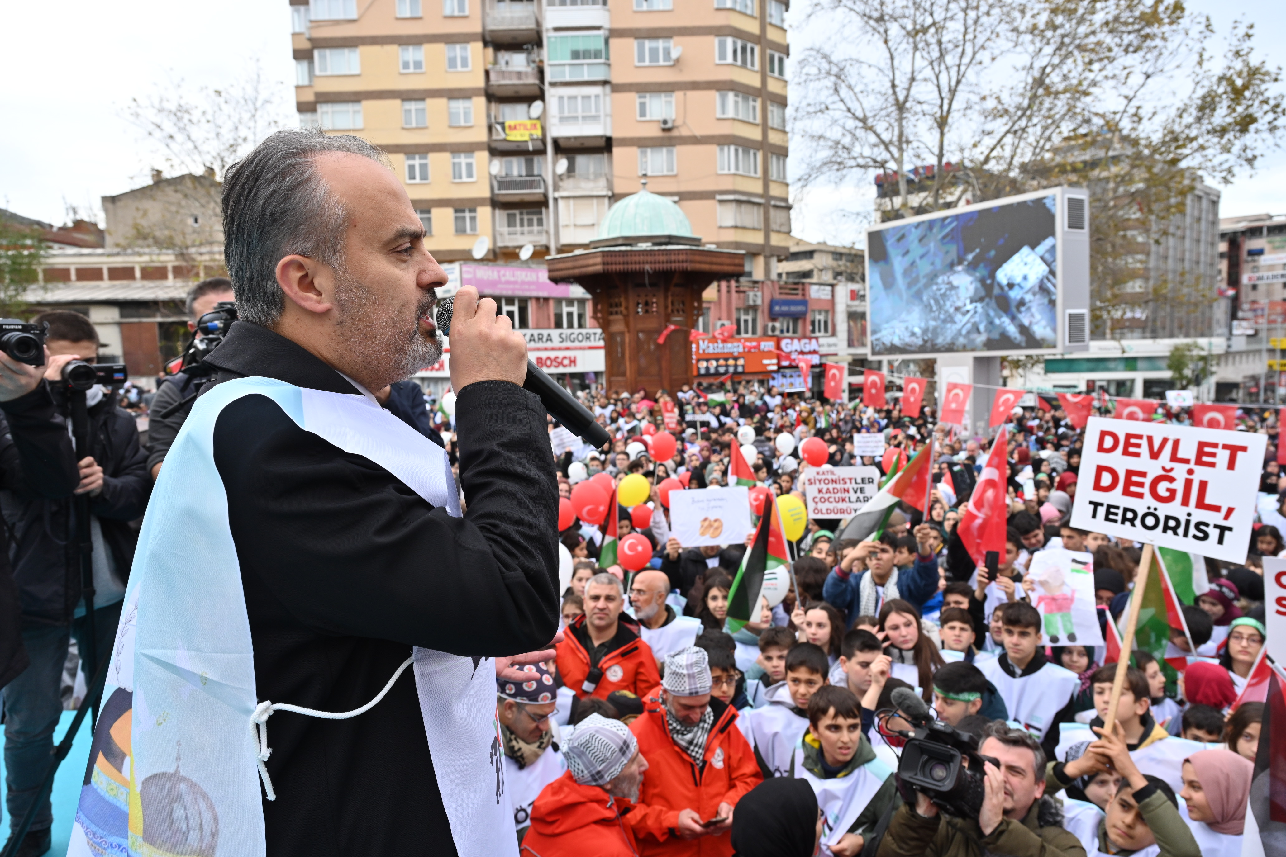 Meydanda düzenlenen mitingde konuşan Bursa Büyükşehir Belediye Başkanı Alinur Aktaş, hiçbir siyasi beklenti, hiçbir menfaat olmadan Filistin'deki acıya son verebilmek adına alanı dolduran başta çocuklar olmak üzere, herkese teşekkür etti. 25 Kasım’ın Uluslararası Kadına Şiddeti Önleme Günü olduğunu hatırlatan Başkan Aktaş, “Buradan Amerika'ya ve İsrail'e sesleniyoruz. Bırak kadına şiddeti, Filistin’de kadınlar ve masum çocuklar katlediliyor. Allah aşkına siz ne yapıyorsun? Ukrayna Rusya Savaşında 20 ayda 510 tane çocuk ölmüş, Filistin’de Gazze’de 45 günde 5 binden fazla çocuk öldü. İki tane fok balığı buzullarda mahsur kaldı diye, bir tane sokak köpeği yaralandı diye ortalığı ayağa kaldıranlar maalesef diri diri çocuklarımız, masum kadınlar ve yaşlılar katledilirken kılları bile kıpırdamıyor. O yüzden de sizin buraya gelmeniz, bu manada her an sözünüzü söylemeniz, duruşunuzu sergilemeniz, onlardan alışveriş yapmamanız çok ama çok kıymetli. Zannetmeyin ki ben alışveriş yapmayınca bu iş hallolacak mı? Evet hallolacak. Sadece ben mi demeyeceksin. Bu konuda protestonu, duruşunu ortaya koyacaksın. Ve Allah’ın izniyle göreceksin ki o zaman nasıl İsrail ve Amerika bundan vazgeçecek. Siz hiç düşündünüz mü? Bu katliamın daha ikinci gününde ayakta durmaya hali olmayan Amerikan Devlet Başkanı Biden İsrail’e gitti değil mi. Can tehlikesine rağmen gitti. Ve yine dünyanın süper güçlerinden biri olan Almanya’nın Başbakanı bu sorunun üçüncü gününde İsrail’e gitti. Acaba hangi güç onları oraya götürdü. Kıymetli kardeşlerim oyun gerçekten büyük. Allah’a hamdolsun. Sayın Cumhurbaşkanımıza yürekten teşekkür ediyorum. Dünyada sadece tek bir lider, bu konuda bir duruş sergiliyor. Ve her ortamda herkesin eylem yapmaya çekindiği bir ortamda Sayın Cumhurbaşkanımız gittiği her ortamda üzerine basa basa bu konuyu ifade ediyor. Dolayısıyla ülkemizin çıkan sesi çok önemli. Bursa’mızdan çıkan ses çok önemli. Tekrar beklentisiz, menfaatsiz, Allah rızası için, oradaki kardeşlerimiz için, onların özgürlükleri için, buraya geldiğiniz için sizlere yürekten teşekkür ediyorum. İsrail’i lanetliyorum, kınıyorum. Hepiniz Allah’a emanet olun” diye konuştu.