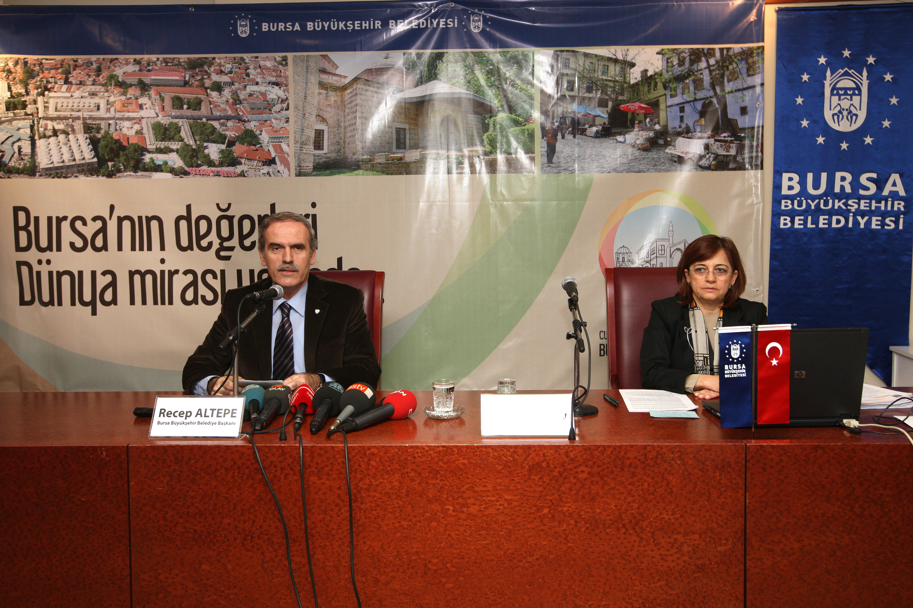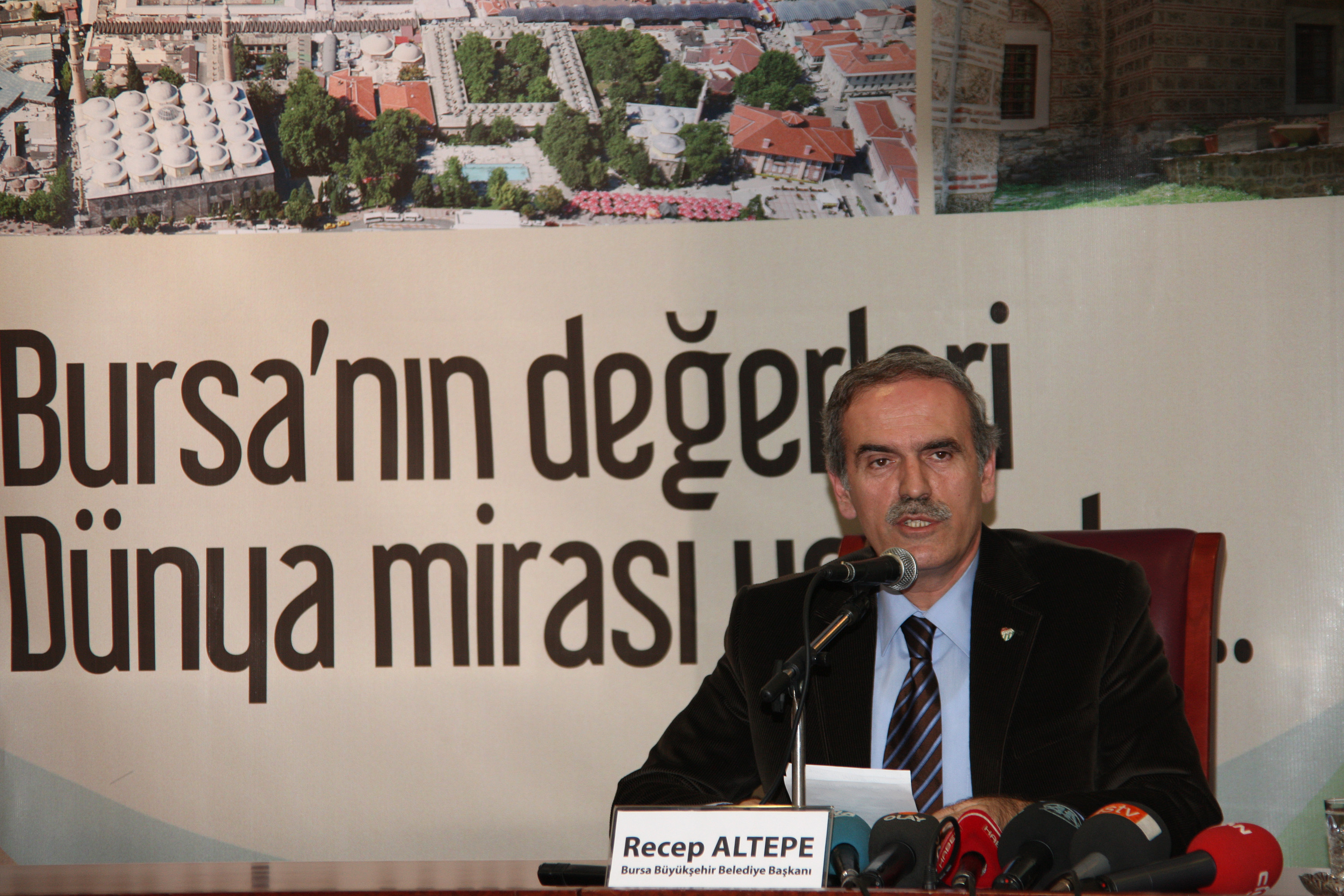Tayyare Kültür Merkezi’nde düzenlenen toplantıda konuşan Büyükşehir Belediye Başkanı Recep Altepe, 60-70 yıllık Cumhuriyet dönemi yapıları, 700 yıllık Osmanlı mimarisi, 2300 yıllık tarihi surlar ve 8500 yıllık arkeolojik bölgeleri ile Bursa’nın dünya çapında keşfedilmeyi bekleyen cennet bir köşe olduğunu söyledi. Bursa’nın öncelikle turizm alanında gelişmesi amacıyla bu değerleri en iyi şekilde tanıtmakta kararlı olduklarını dile getiren Başkan Altepe, “UNESCO Dünya Mirası Listesi’ne bu nedenle büyük önem veriyoruz. Dünya’da 936 yerin bulunduğu listede Türkiye’den sadece 10 yer var. Bursa olarak bu listeye girerek, değerlerimizi dünyaya tanıtmak ve turizmle gündemde olmak istiyoruz. Bu konuda gerekli çalışmalarımızı göreve gelir gelmez başlattık ve önemli bir mesafe kat ettik. Bu alanda hedef ve stratejilerin belirlenmesi için kurulan Alan Başkanlığı görevine de konunun uzmanı olan hocamız Prof. Dr. Neslihan Dostoğlu getirildi. Bu yılsonuna kadar ön başvurularımızı yapıp, 2014 yılında da Bursa olarak bu listede yer almak istiyoruz” dedi.