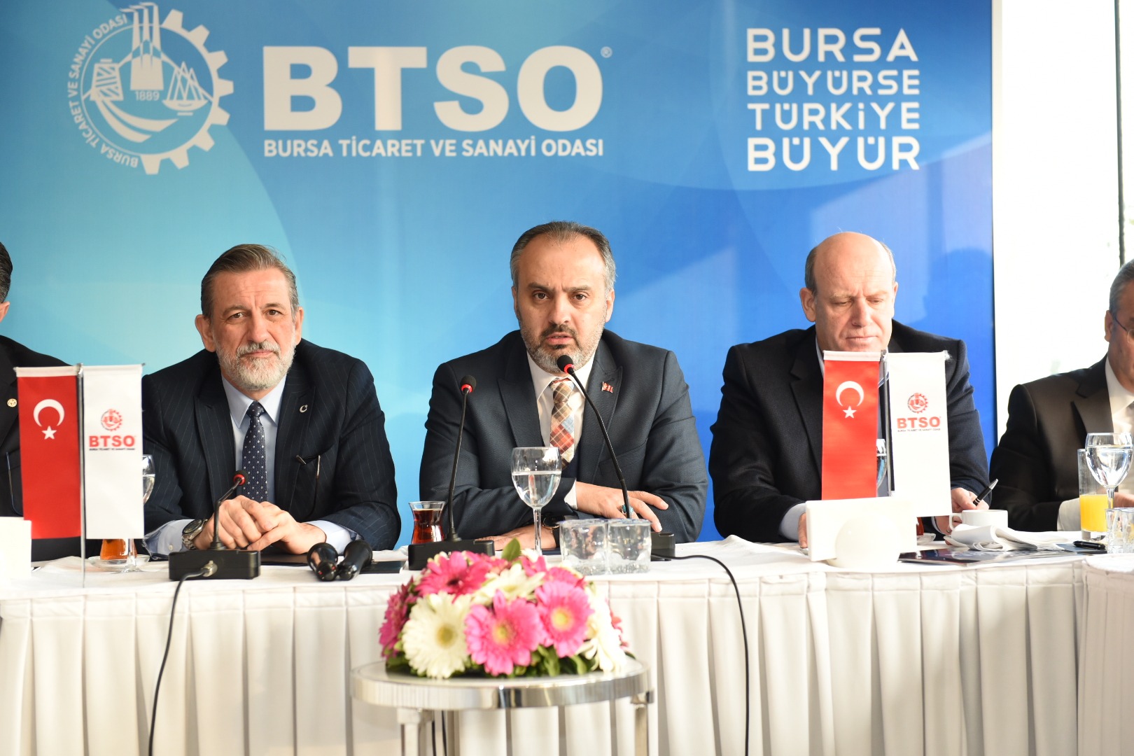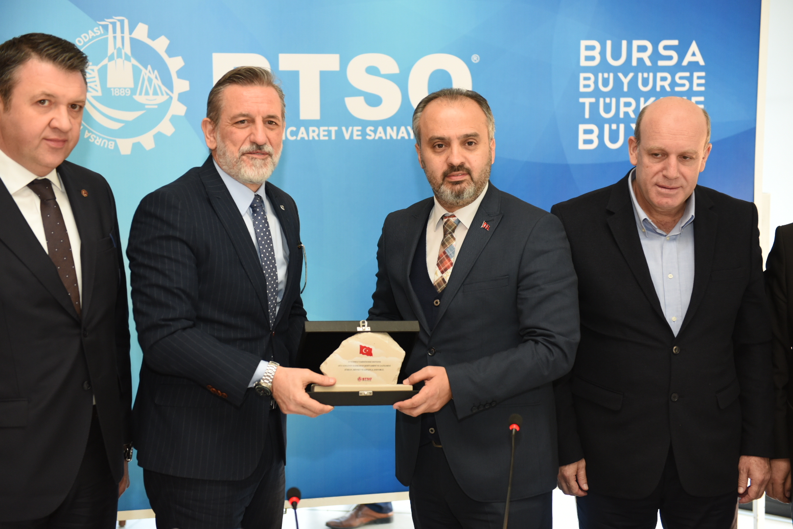 Bursa Büyükşehir Belediye Başkanı Alinur Aktaş, Bursa Ticaret ve Sanayi Odası (BTSO) Başkanı İbrahim Burkay ve Yönetim Kurulu üyeleriyle BTSO Altıparmak Hizmet Binası’nda bir araya geldi. Büyükşehir Belediyesi bürokratlarının da hazır bulunduğu toplantıda konuşan Büyükşehir Belediye Başkanı Alinur Aktaş, Bursa’nın katma değerli üretim ve ihracatta marka olduğunu söyledi. Bursa Ticaret ve Sanayi Odası’nın ‘Bursa Büyürse Türkiye Büyür’ vizyonu ile kent ekonomisine ivme kazandıran önemli projelere imza attığını dile getiren Aktaş, BTSO ile birlikte kentin ticaret ve sanayi hayatına güç katacak adımlar atmaya devam edeceklerini dile getirdi. Bursa’nın farklı dinamikleriyle bir araya gelerek şehrin nabzını tutmaya ve şehirde yapılacak çalışmalara yön vermeye devam ettiklerini anlatan Başkan Aktaş, Bursa’nın mevcut potansiyeli ve tecrübesi ile Türkiye ekonomisinin büyümesine katkı sağladığını söyledi. Aktaş, kentin tüm dinamikleri ile ‘Ortak Akıl’ doğrultusunda Bursa’yı büyütmeyi sürdüreceklerini belirterek, “Tek bir hedefimiz var. O da Bursa’nın geleceğine yön vermek. Bursa’nın hak ettiği yere yükselmesini istiyoruz. Mutlaka araştırmalı ve dünyayı yakından takip etmeliyiz. Bu noktada BTSO’nun bütün projelerinin ana hedefinde ve özünde ekonomiyi geliştirmek var” dedi.