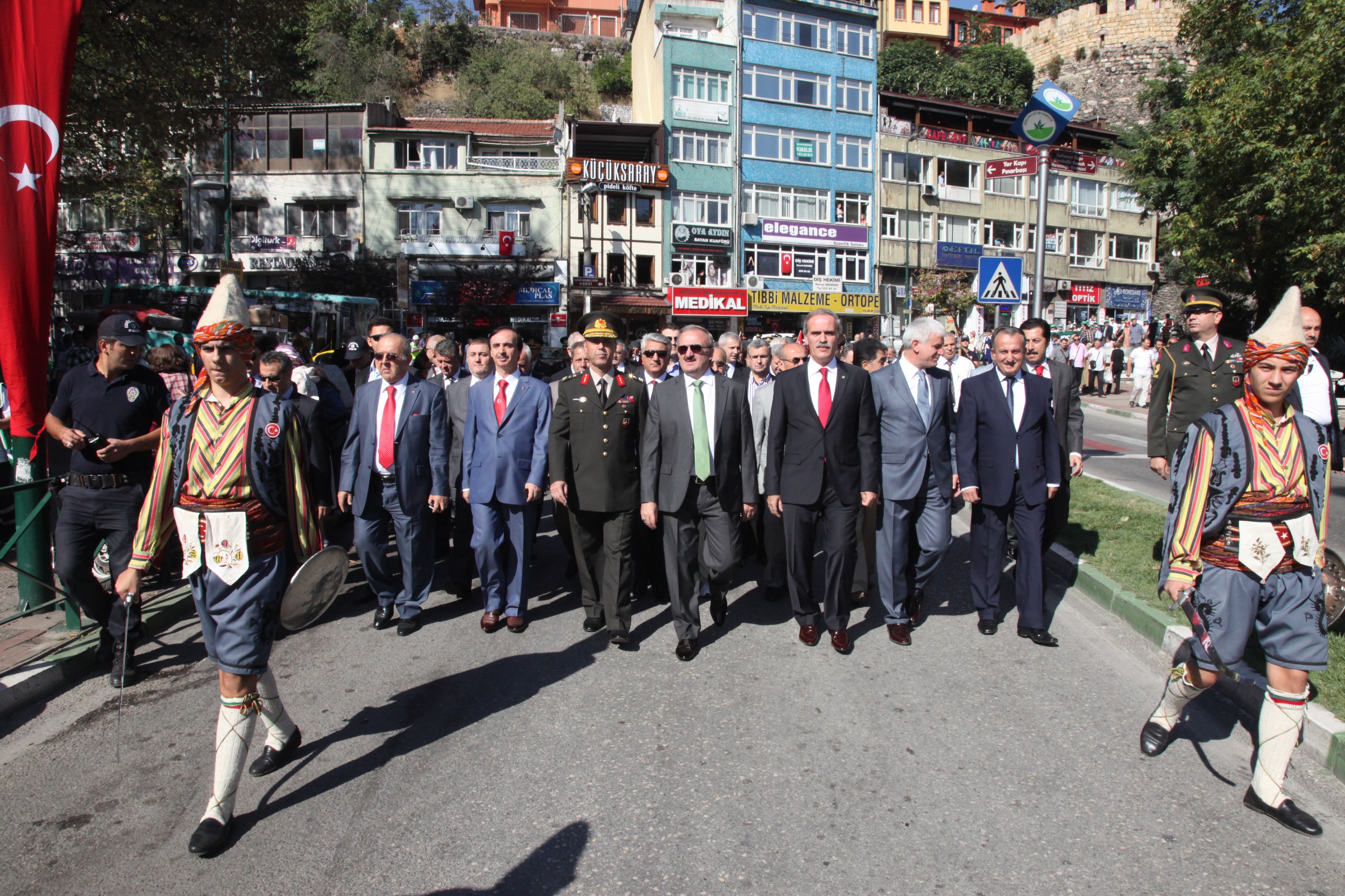 Bursa’nın kurtuluşunun 91. yılı kutlamaları bugün de Tophane’deki Saltanat Kapı’dan başlayan kortej yürüyüşü ile devam etti. Vali Münir Karaloğlu, Büyükşehir Belediye Başkanı Recep Altepe ve Garnizon ve Jandarma Bölge Komutanı Tümgeneral Seyfullah Saldık, Büyükşehir Belediyesi Bandosu ve Mehter Takımı’nın marşları eşliğinde kortej yürüyüşünü gerçekleştirdi. AK Parti Bursa Milletvekili Hüseyin Şahin ile Yıldırım Belediye Başkanı Özgen Keskin’in de katıldığı korteje vatandaşlar da bayraklarla ve alkışlarla eşlik etti. Kortejin ardından törenler, Bursa Kent Müzesi önünde devam etti.