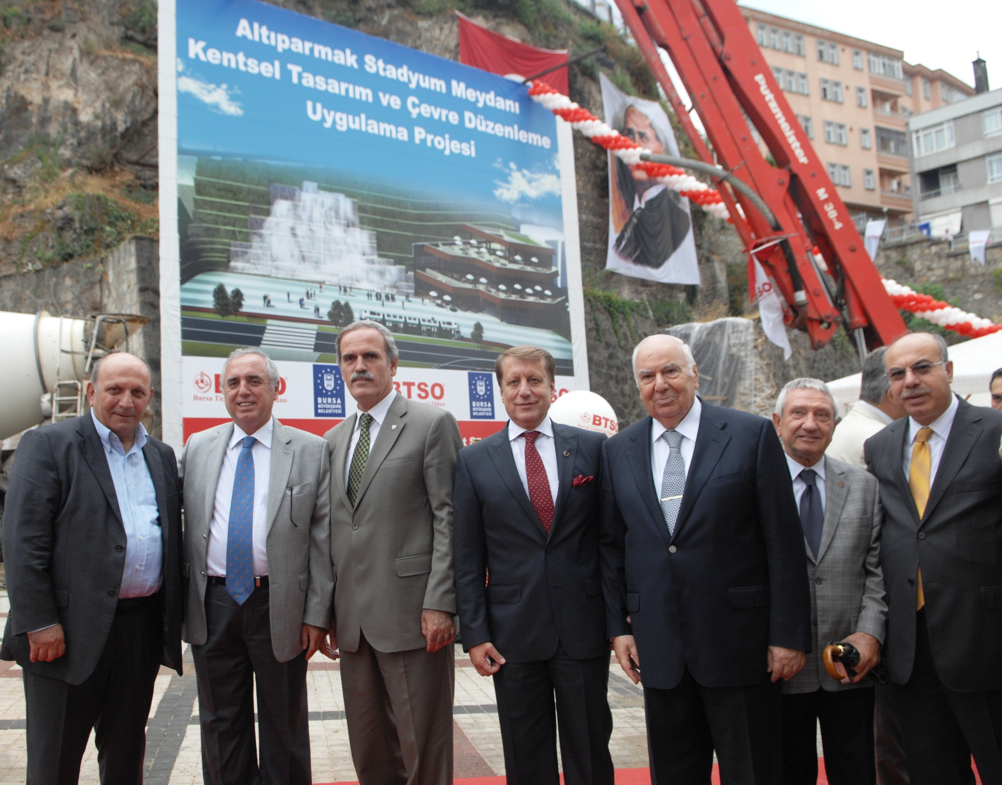 Altıparmak Meydanı´nda Karagöz ve Hacivat’ı simgeleyen ve suyun kinetik gücünden yararlanılarak hareket edebilen ‘Yüzen Taşlar Heykeli’nin yanındaki alanda gerçekleştirilen temel atma törenine; Bursa Valisi Şahabettin Harput, Büyükşehir Belediye Başkanı Recep Altepe, BTSO Yönetim Kurulu Başkanı Celal Sönmez ile BTSO Meclis Başkanı İlhan Parseker ve sanayiciler katıldı.