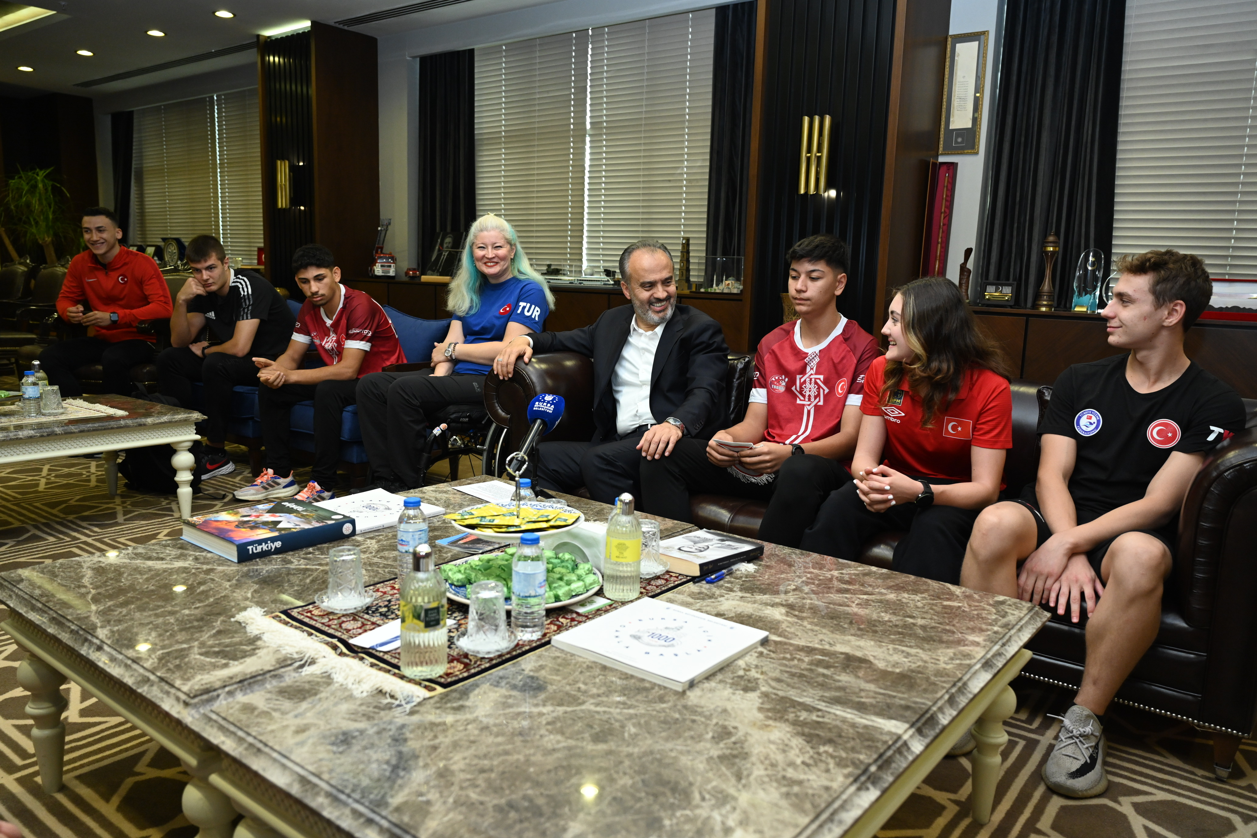 Bünyesindeki 24 branş ve binlerce sporcuyla Bursa’nın sporda önemli bir lokomotifi olan Büyükşehir Belediyespor’un milli formayla derece elde eden sporcuları Başkan Alinur Aktaş’ı ziyaret etti. Büyükşehir Belediyespor Kulüp Başkanı Gökhan Dinçer ve kulüp antrenörlerinin de hazır bulunduğu ziyarete, uluslararası müsabakalarda madalya kazanan sporcular, Para-Atıcılık Dünya Şampiyonu Aysel Özgan, Modern Pentlanton U17 Avrupa Üçüncüsü Eda Özrodop, Bocce Dünya İkincisi Hüseyin Önder ve Dünya Altıncısı Emirhan Şahiner, İsviçre Açık Avrupa Karate Şampiyonası +84Kg ikincisi Umut Eren Gündoğ, Büyükler Karate Balkan üçüncüsü Emir Buğra Gencan ve 16 yaş 400m serbest şampiyona rekortmeni Özgür Yonca katıldı.