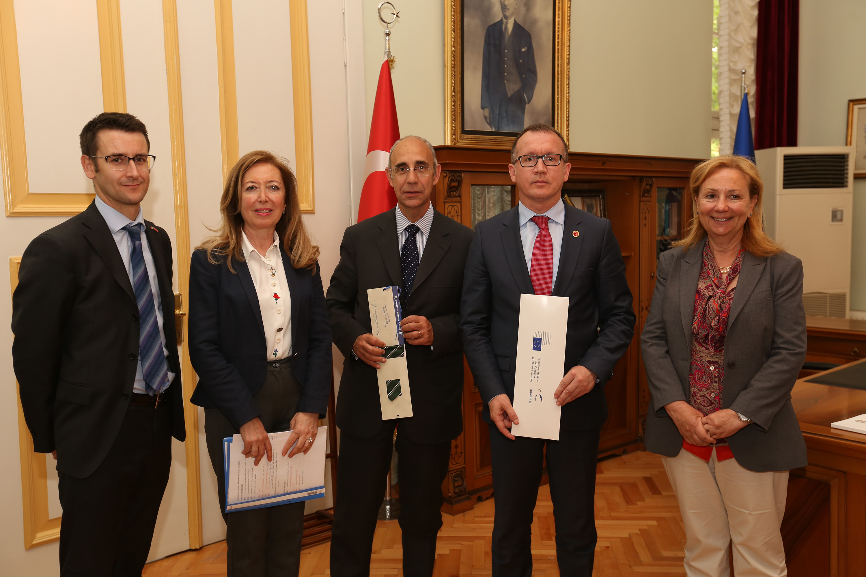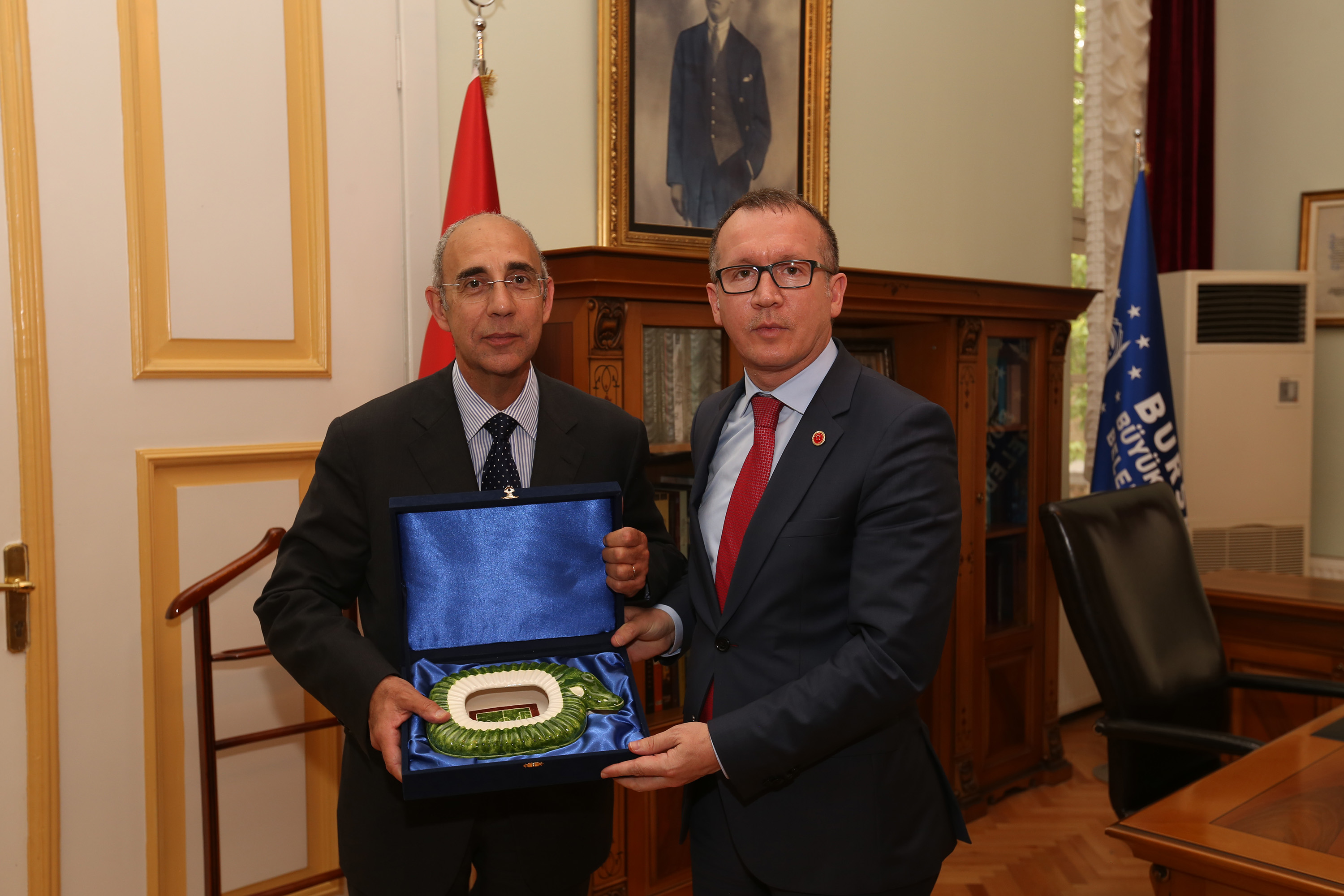 Büyükşehir Belediye Başkanvekili Abdülkadir Karlık, İtalyan konuklarına birer stadyum maketi hediye etti. İtalyan Büyükelçi Mattiolo da Başkanvekili Karlık’a kravat takdim etti.