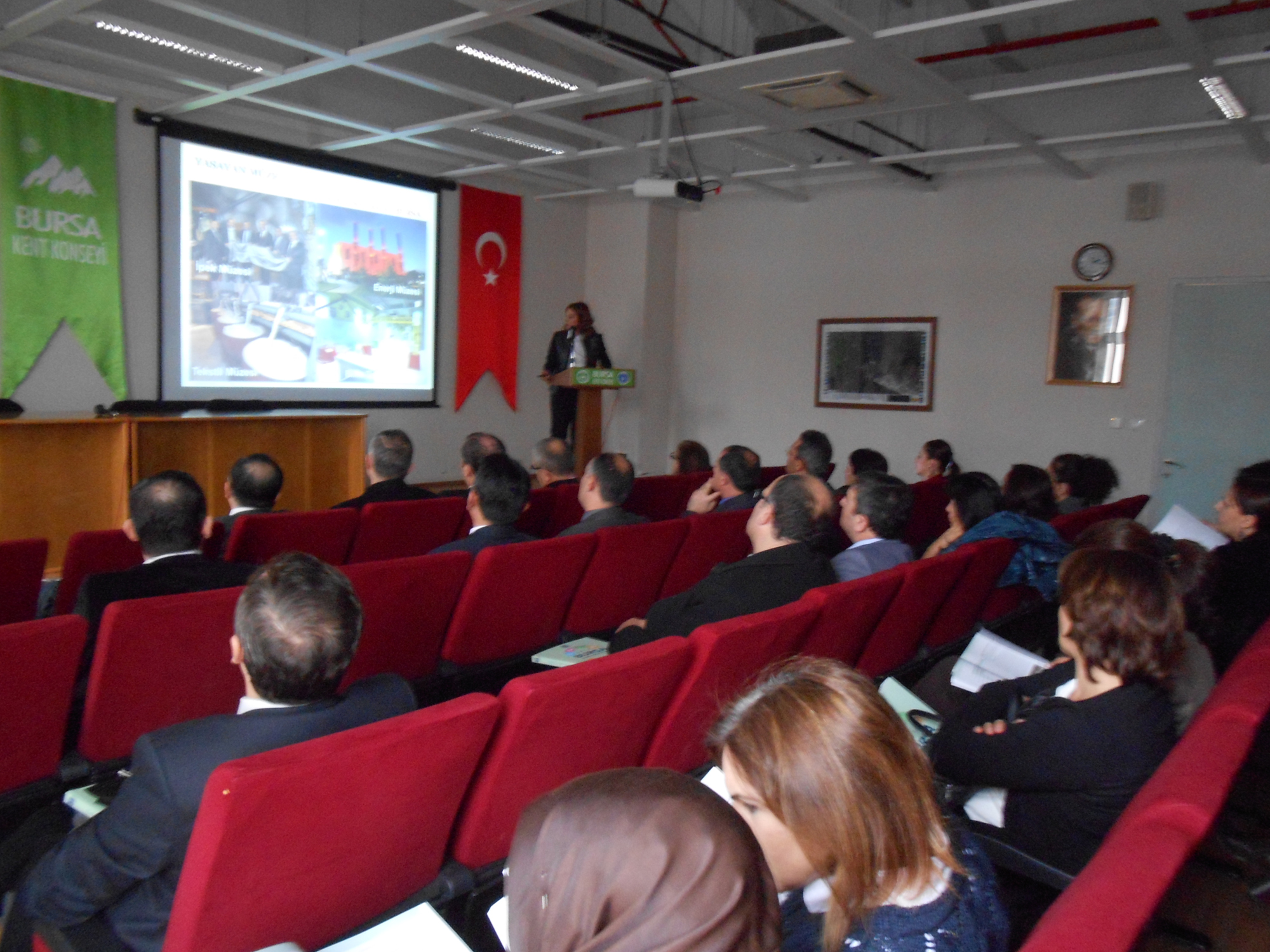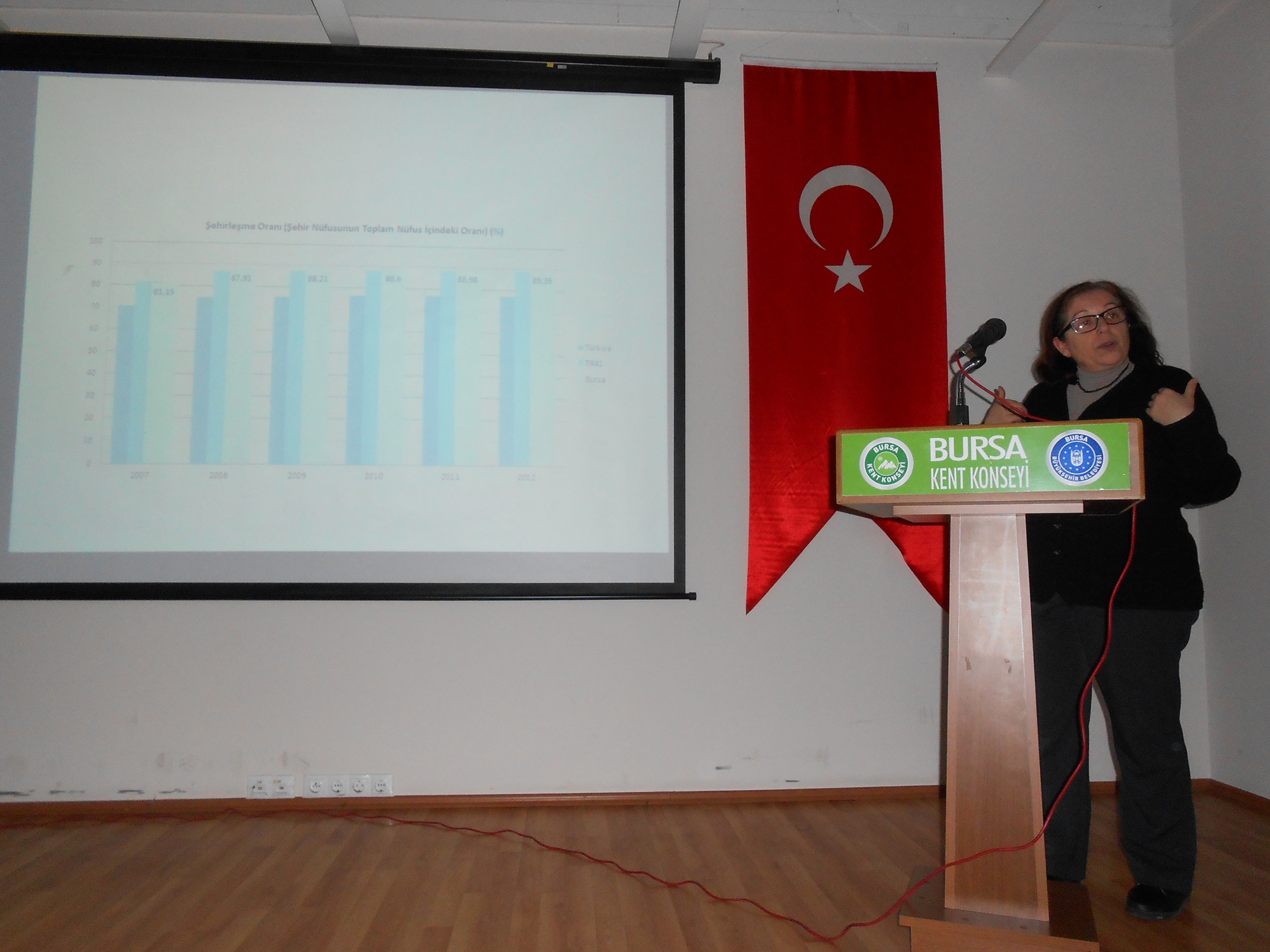 Şehir Sağlık Profilinin hazırlanması sürecinde destek veren İTÜ Şehir ve Bölge Planlaması Bölümü Öğretim Üyesi Handan Türkoğlu ise Şehir Sağlık Profili kapsamında Bursa’nın nüfus, konut, sosyal hizmetler, güvenlik, çevre, ekonomi ve ulaşım konularında yapılan tespitler hakkında bilgi vererek saptanan veriler ışığında Bursa ölçeğinde geliştirilen stratejileri katılımcılarla paylaştı. Bursa’nın şehirleşme oranının yüzde 89 ile Türkiye ortalamasının üzerinde olduğunu dile getiren Türkoğlu, bu durumun sanayileşmeden kaynaklandığını vurguladı. Birim alanda yaşayan kişi sayısı olarak ifade edilen nüfus yoğunluğu açısından Bursa’nın 258 değeriyle 98 olan Türkiye ortalamasının 2,6 kat üzerinde olduğunu hatırlatan Türkoğlu, “Konuttan memnuniyet oranı açısında ilçeler arası farklılıklar tespit ettik. Kent merkezinde yer alan ilçelerin memnuniyet oranlarının Büyükorhan, Harmancık, İznik, Yenişehir, İnegöl ve Mustafakemalpaşa ilçelerine göre daha düşük olduğu görüldü. Toplu ulaşımdan memnuniyet konusunda Gemlik ilçesi, diğer ilçelere göre daha memnun olarak fark yarattı. Güvenlik açısından ise Gürsu ilçesinde diğer ilçelere göre daha düşük bir memnuniyet oranı gözlendi” diye konuştu.