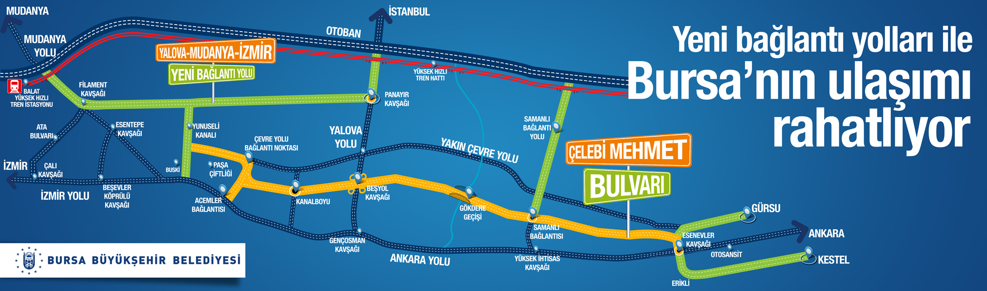 Başkan Altepe, Bursa’nın her alanda çağdaş, ulaşılabilir sağlıklı bir kent olması yolundaki hizmetlere hız kesmeden devam ettiklerini bildirdi. Bu dönemde özellikle ulaşım yatırımlarına, kent içi trafiği rahatlatma yönündeki çalışmalara büyük önem verdiklerini vurgulayan Başkan Altepe, bir kısmı geçtiğimiz hafta trafiğe açılan Çelebi Mehmet Bulvarı’nın Yalova-Mudanya-İzmir bağlantı yoluyla bütünleştirilmesi sonucunda trafiğin de önemli ölçüde rahatlayacağını anlattı. Çelebi Mehmet Bulvarı’nın Acemler- Beşyol kısmının tamamlanarak kullanıma açıldığını, Beşyol’dan Gökdere Geçişi’ne kadarki kısmın inşaatının sürdüğünü kaydeden Başkan Altepe, Gökdere Geçidi, Samanlı ve Esenevler Kavşağı planlarının da uygulama için beklediğini hatırlattı.