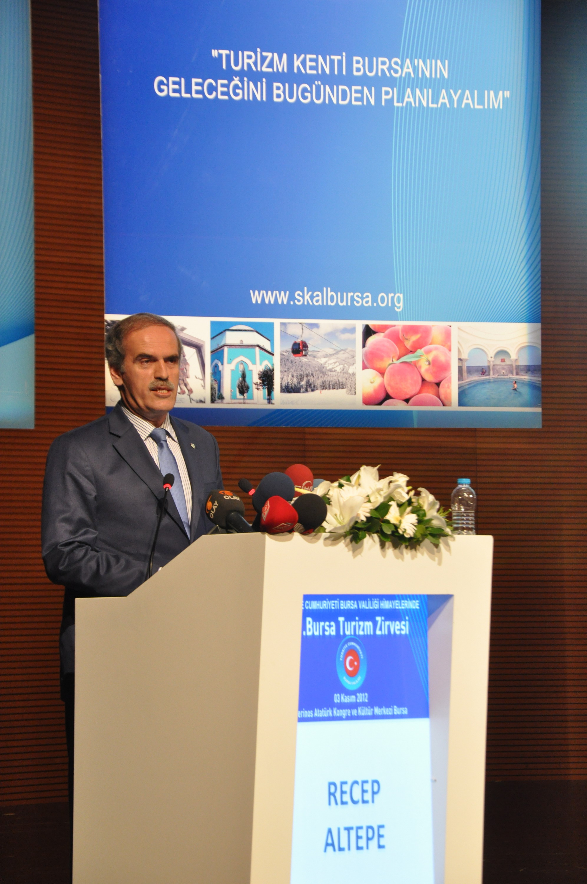 Büyükşehir Belediye Başkanı Recep Altepe, zirvenin açılışında yaptığı konuşmada, Bursa´nın turizmde hak ettiği payı alması için Türkiye ile dünyaya çok iyi şekilde tanıtılması gerektiğini belirtti. Osmanlı´ya kuruluşundan itibaren 165 yıl başkentlik yapmış, 6 padişahın doğum yeri olan Bursa´nın gündeme gelmesinin, marka olmasının, tarihin kendilerine yüklediği bir sorumluluk olduğunu kaydeden Başkan Altepe, Büyükşehir Belediyesi olarak bu yönde yoğun faaliyetler gösterdiklerini ifade etti. Son 3.5 yılda Cumhuriyet döneminden Osmanlı dönemine, 2300 yıllık Bitinya surlarından Roma dönemine kadar 252 eseri restore ettiklerini ve hizmete aldıklarını, tarihi çarşı bölgesini 850 dükkan ve hanlarıyla baştan ayağa yenilediklerini ifade eden Başkan Altepe, yaptıkları tüm bu çalışmalar nedeniyle Bursa´nın uluslararası toplantılarda söz alarak örnek olduğunu, Türkiye´nin tanıtılmasına büyük katkı sağladığını ifade etti.