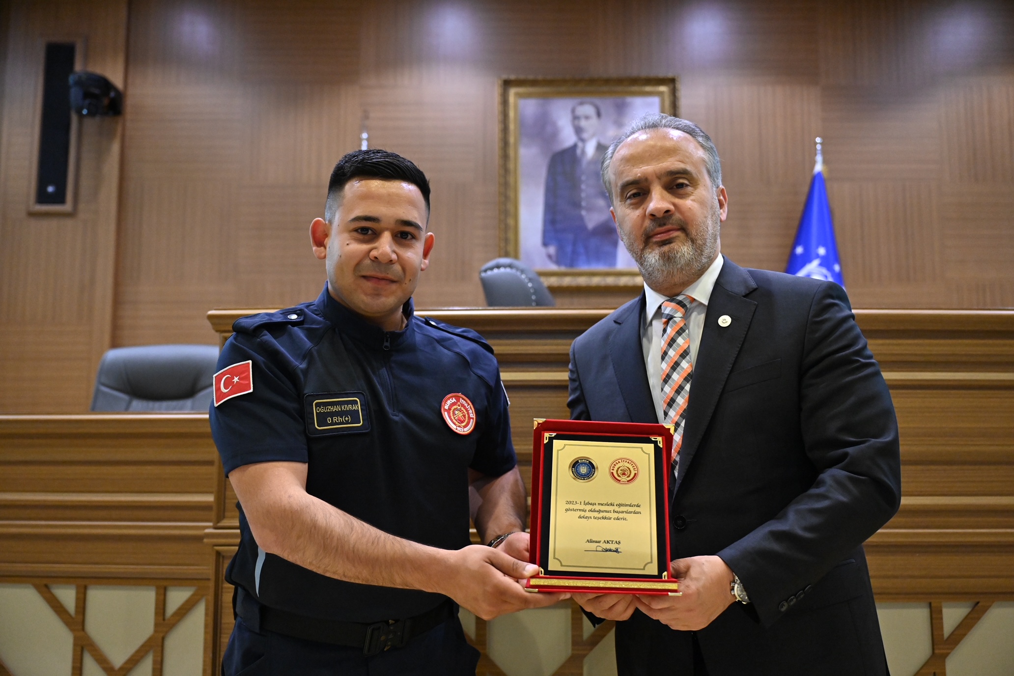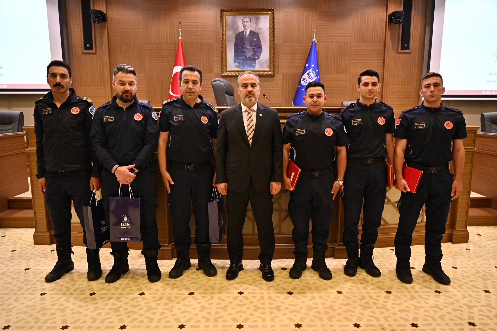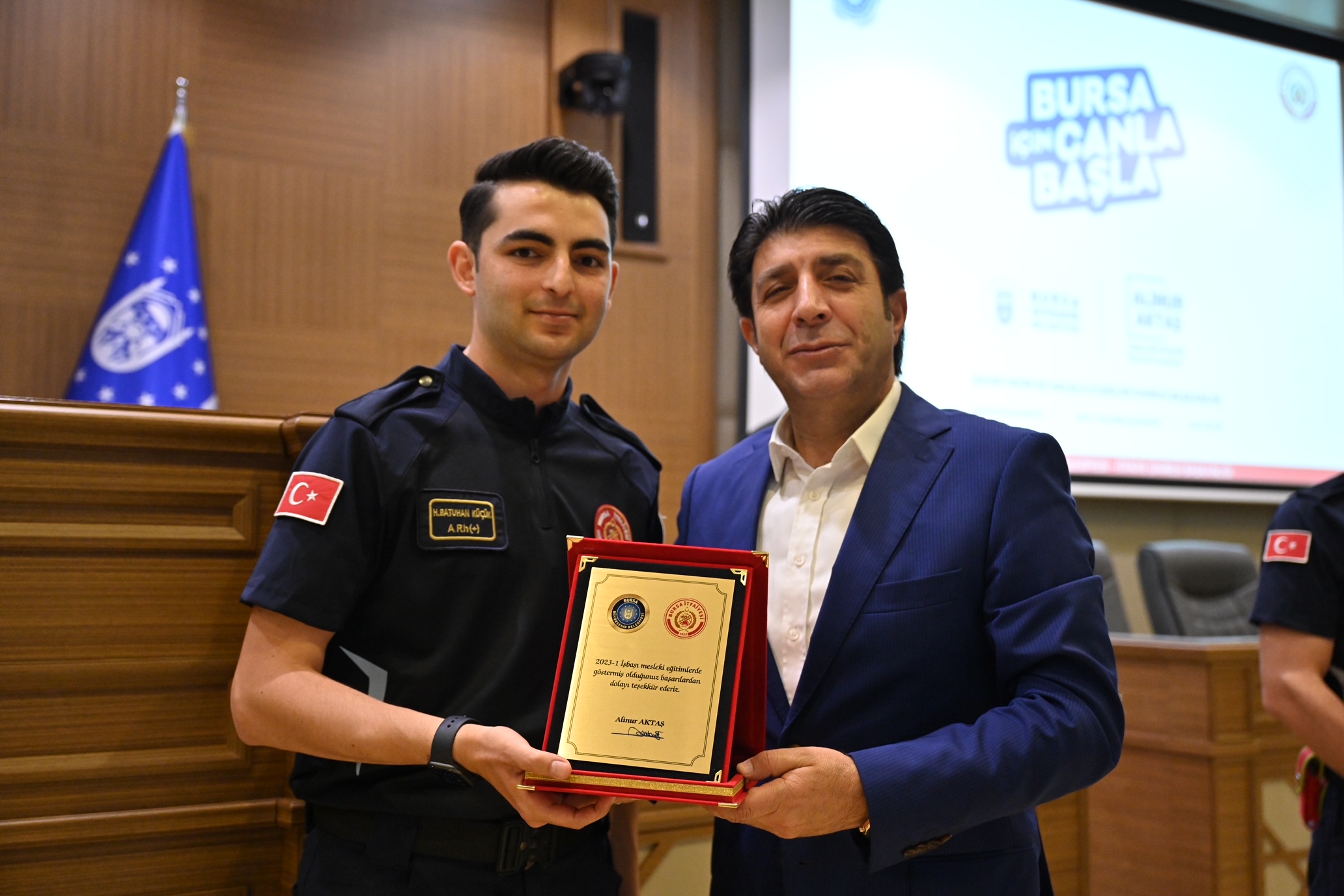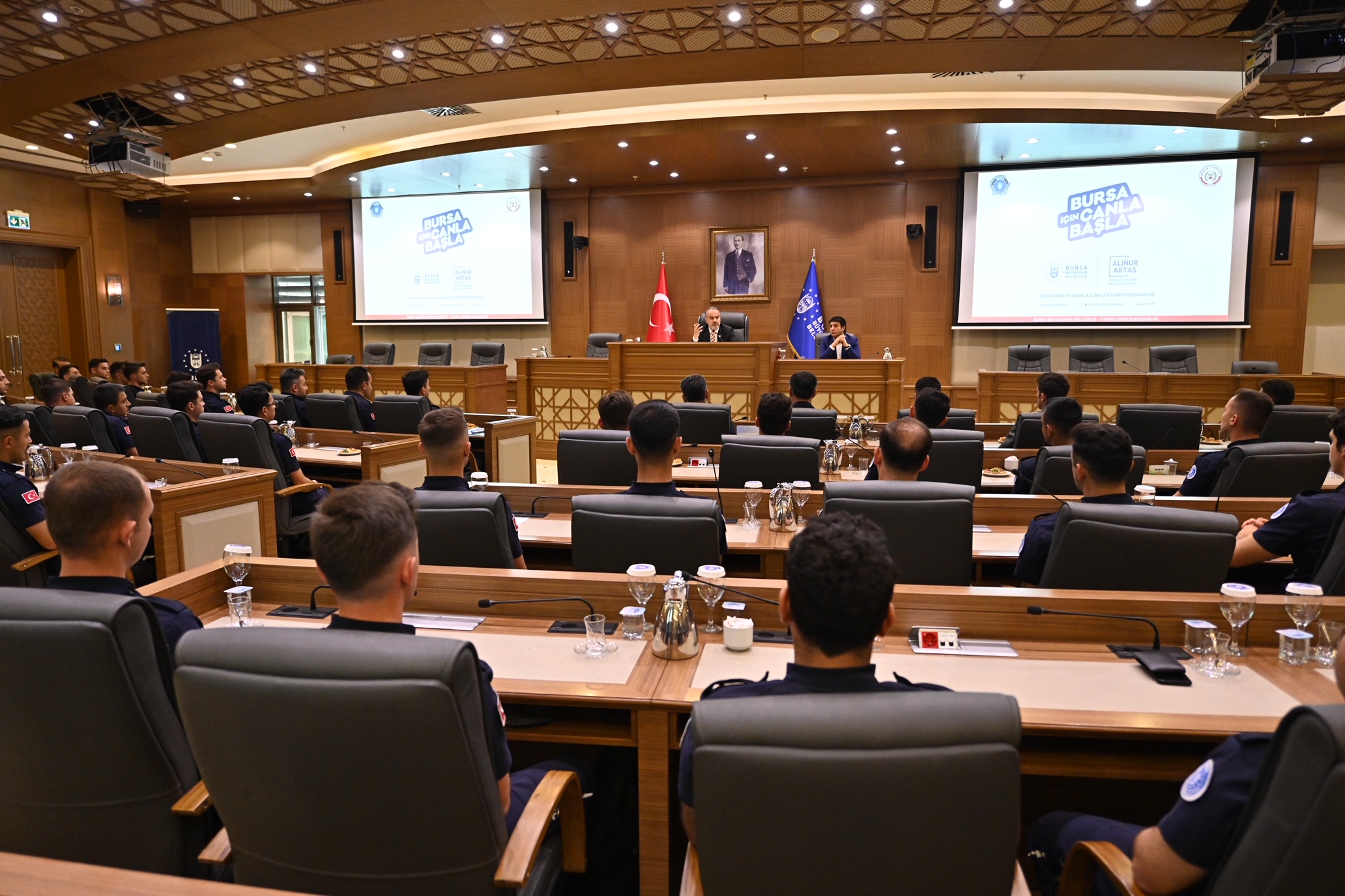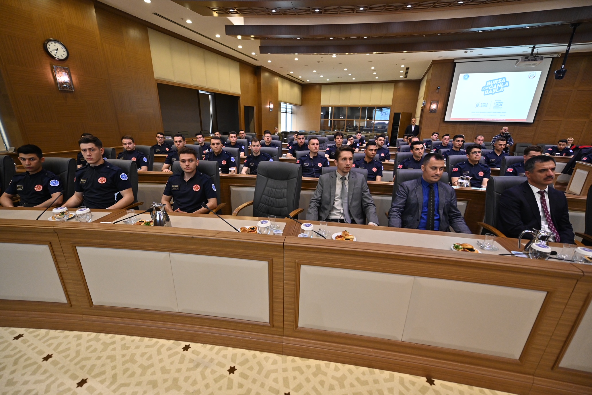Bursa Büyükşehir Belediye Başkanı Alinur Aktaş da İnsan Kaynakları ve Eğitim Dairesi Başkanlığı tarafından, aday memurların yetiştirilmesine yönelik düzenlenen oryantasyon eğitiminde yeni itfaiye erleri ile bir araya geldi. Mevcut 28 itfaiye istasyonunun yeni itfaiye erleri ile daha da güçleneceğini belirten Başkan Aktaş, “Küçük çocuklara sorsanız, hiçbiri ‘ben belediyede emlak istimlakte çalışacağım’ demez. Belediye ile ilgili sorsanız çoğu ‘itfaiyeci olacağım’ der. Çünkü gerçekten çok önemli bir görev yapıyorsunuz. Bu iş yürek işi ve sahada yapılıyor. Her ne kadar eğitiminiz tam olsa da yere, zamana, duruma, şartlara ve havaya göre müdahale şekilleri değişebiliyor. Ben birinizin bile burnu kanamadan bu süreci tamamlamanızı diliyorum. Kullandığınız araç, makine, ekipman hepsi sizlere emanet. Bu emanete de sahip çıkmanızı bekliyoruz. Hepinize hayırlı görevler” dedi.