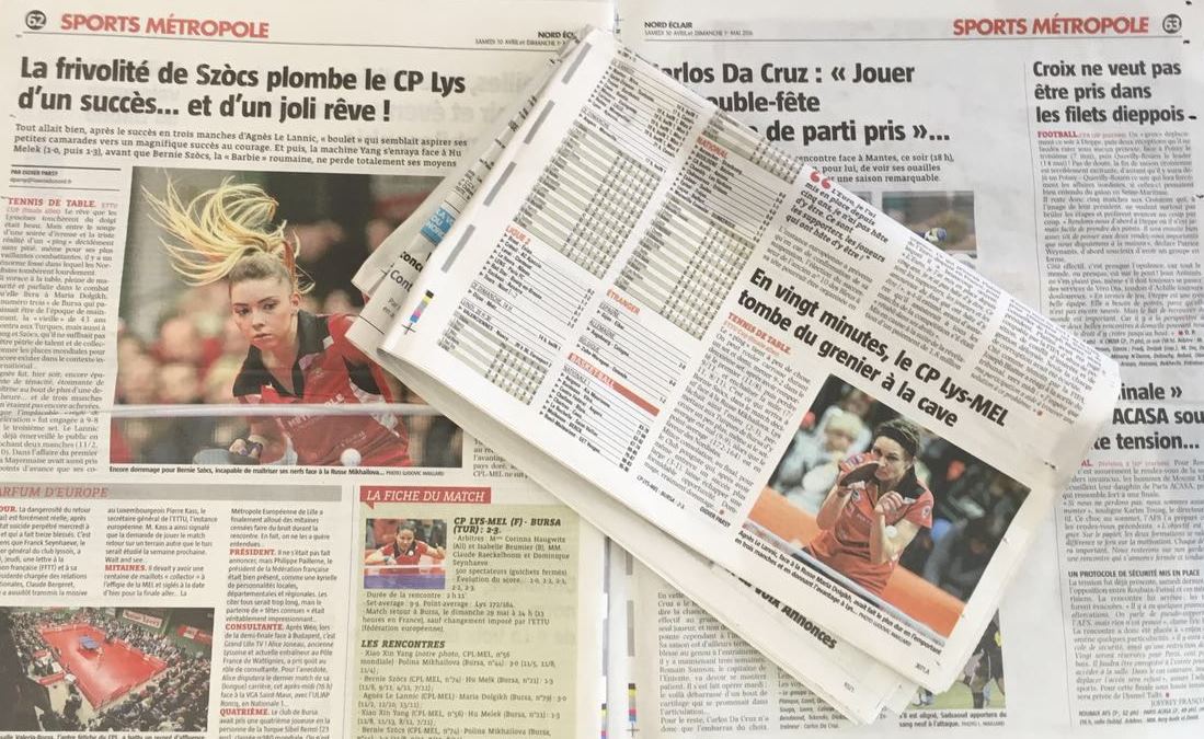 - 2 kez ETTU Cup’ı kazanan CP LYSSOIS Lille Metropole takımını 3-2 yenerek, Avrupa Şampiyonluğu yolunda büyük avantaj yakalayan Bursa Büyükşehir Belediyespor’un başarısını manşetine taşıyan Fransız basını, özellikle Polina’nın 9-2 yenilgiden seti 11-9 kazanarak Bursa’ya getirdiği galibiyeti konuşuyor.
