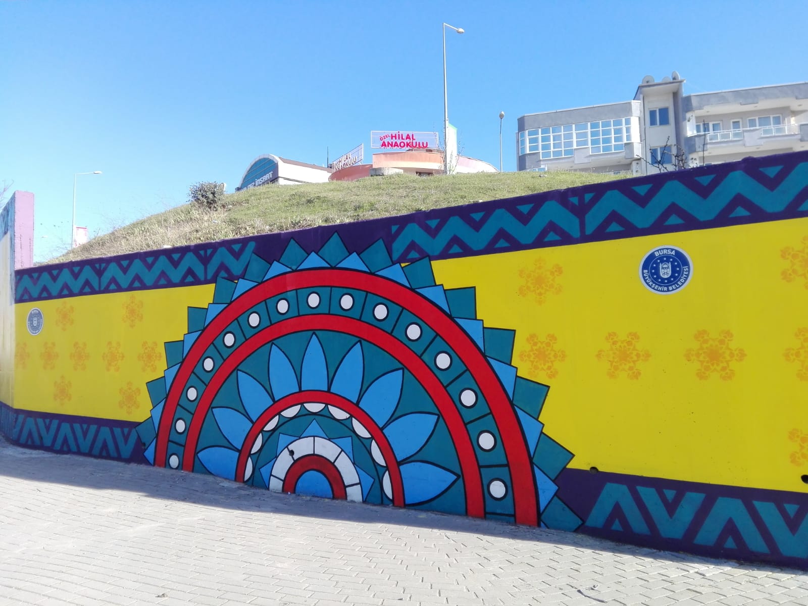 Büyükşehir Belediyesi Kent Estetiği Şube Müdürlüğü, ressam ve sokak sanatı ekibiyle yürüttüğü çalışmalarla kenti açık hava sanat galerisine dönüştürüyor. Uygulanan sanatsal çalışmalar fiziksel yaşam kalitesinin artmasına katkı sağlarken, kentin merkezi noktalarında fark yaratan sokak sanatı çalışmaları vatandaşların da büyük ilgisini çekiyor. Çalışmalar kapsamında İzmir Yolu Beşevler mevkii Bursa merkez istikametindeki 203 metrelik boş duvar, sonsuza giden desenlerin betimlendiği özgün tasarımla bölgeye adeta renk kattı. Önce inşaat ve boya ekipleri tarafından yapılan çalışma ile resim çizmeye hazır hale getirilen duvar, ressamların hünerli ellerinden çıkan çalışma ile de adeta bir sanat galerisi halini aldı.