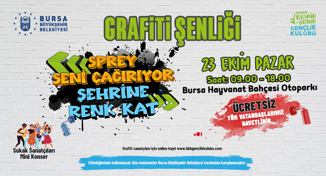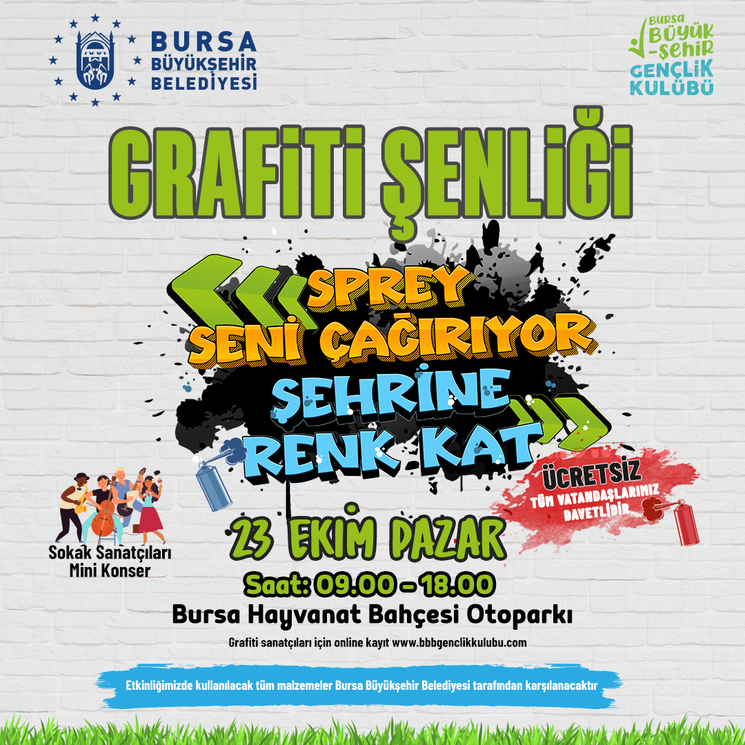 Bursa'da trafo binaları, istinat duvarları ve köprülü kavşakları ‘bir tuval gibi kullanıp’ sanat eserine dönüştüren Büyükşehir Belediyesi, şimdi de çok renkli bir şenliğe imza atıyor. Büyükşehir Belediyesi tarafından ‘Sprey seni çağırıyor. Şehrine renk kat’ sloganıyla Grafiti Şenliği organize ediliyor. Bursa Hayvanat Bahçesi otoparkı duvarlarının şenlik kapsamında çok renkli bir sanat eserine dönüşmesi bekleniyor. Profesyonel grafiti sanatçılarının yanı sıra şehrine renk katmak isteyen herkese açık olacak şenlik, 23 Ekim Pazar günü gerçekleştirilecek.