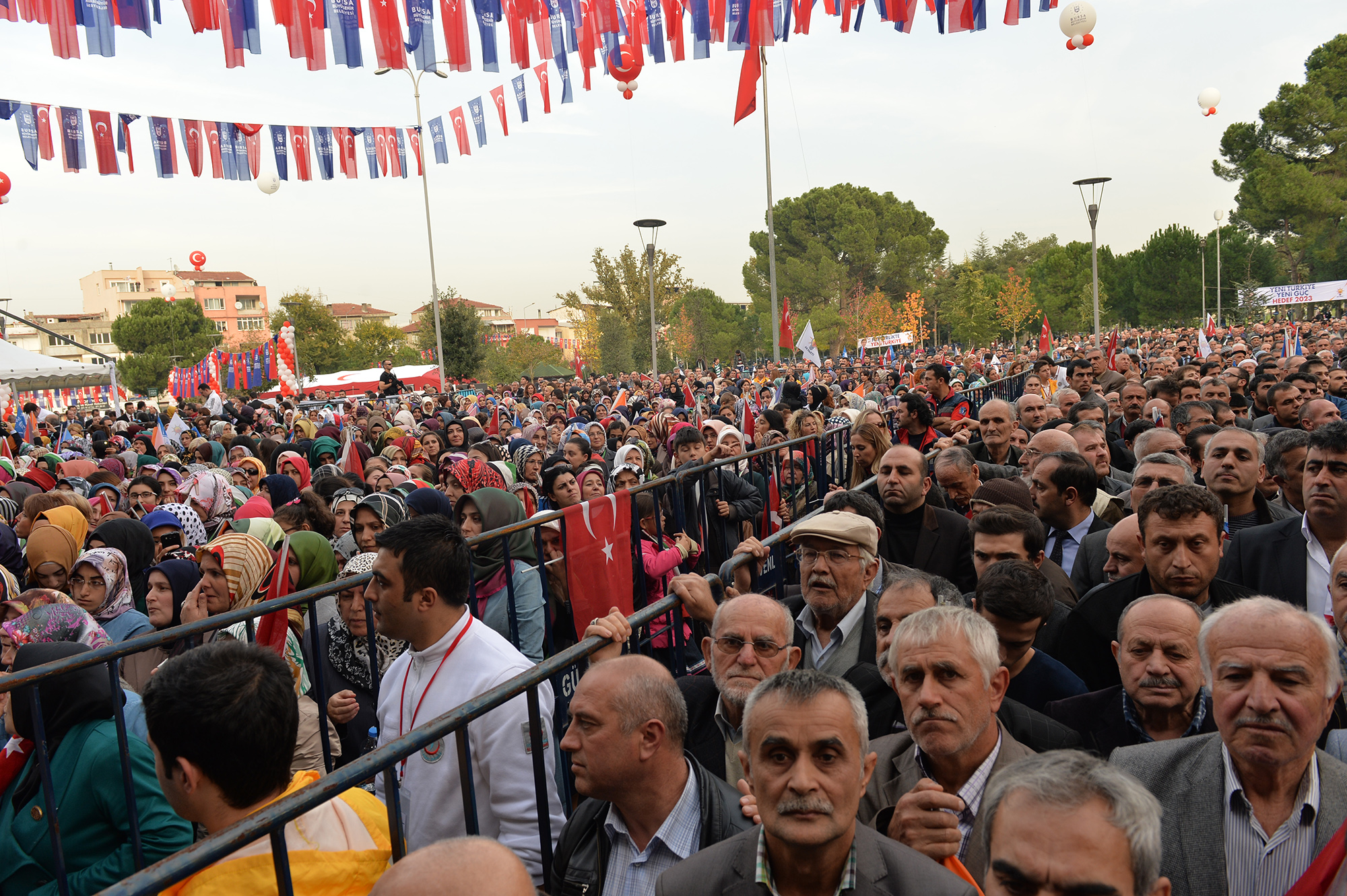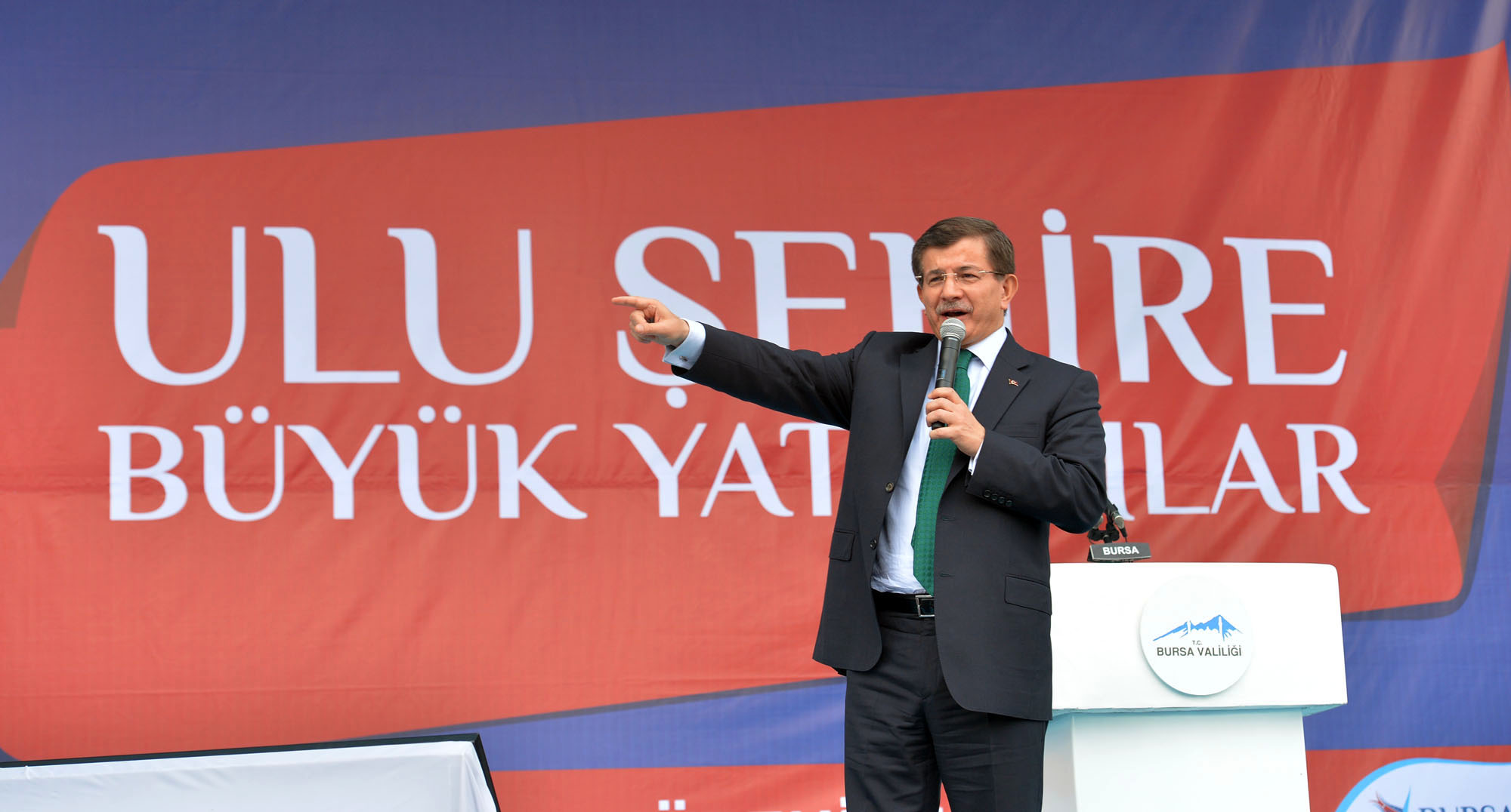 Alanı dolduran vatandaşların yoğun tezahüratları ile kürsüye gelen Başbakan Ahmet Davutoğlu ise, geçen Mart ayında Bursa’ya geldiğinde, Bursa’ya ‘Ulu şehir’ dediğini hatırlatarak, bu sloganın tutmasının kendisini mutlu ettiğini söyledi. Toplu açılış töreninin yanı sıra AK Parti yönetimindeki 18 Büyükşehir Belediye Başkanını da Bursa’da buluşturduklarınız hatırlatan Davutoğlu, “Bütün Büyükşehir Belediye Başkanlarının Bursa’dan istifade etmesini, Bursa’nın huzuruna gelmesini arzu ettik. 18 Büyükşehir Belediye Başkanımız ve 9 bakanımızla birlikte Bursa’nın huzurundayız. Sizin huzurunuza geldik. Ulu şehre selam vermeye, ‘hazır ol’ demeye geldik. Çünkü Bursa, huzuruna gelene sahip çıkar” dedi.