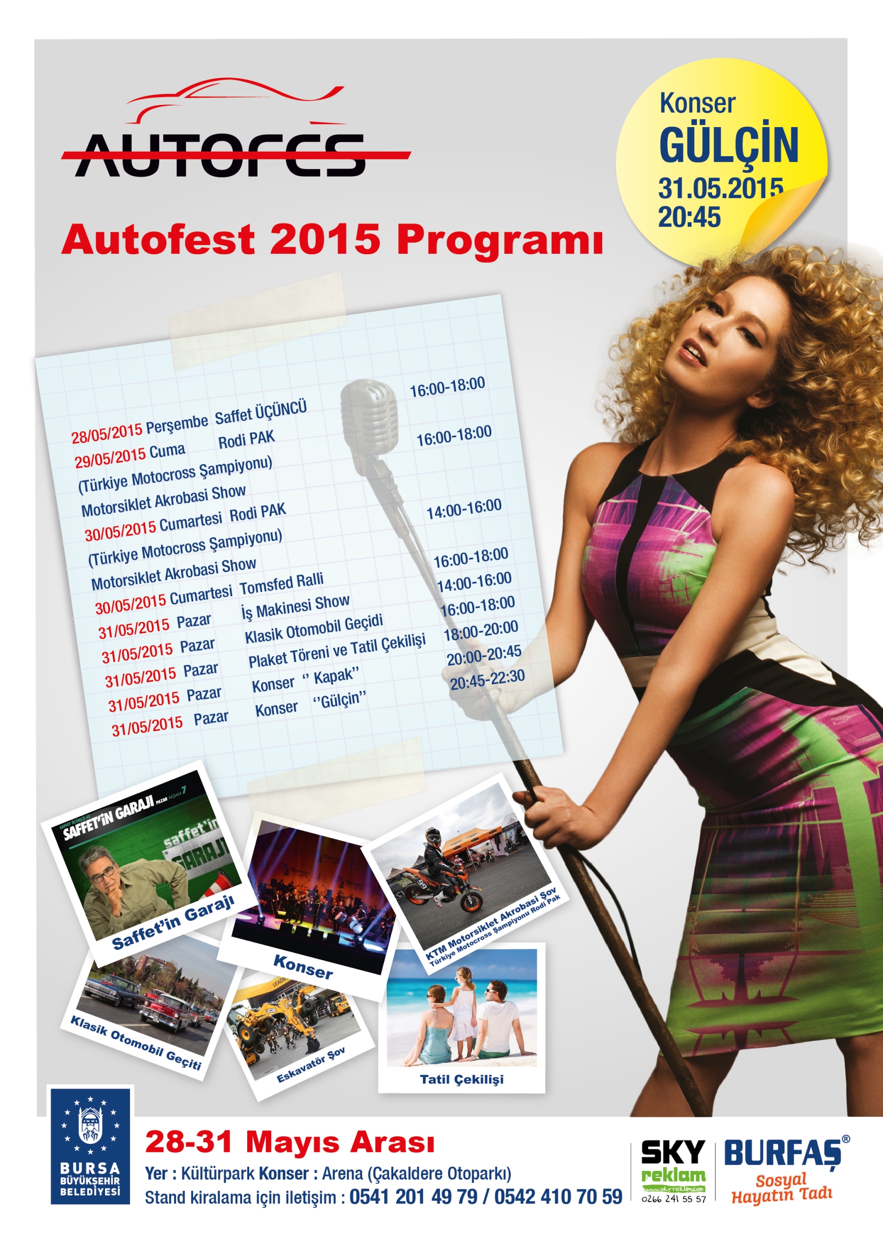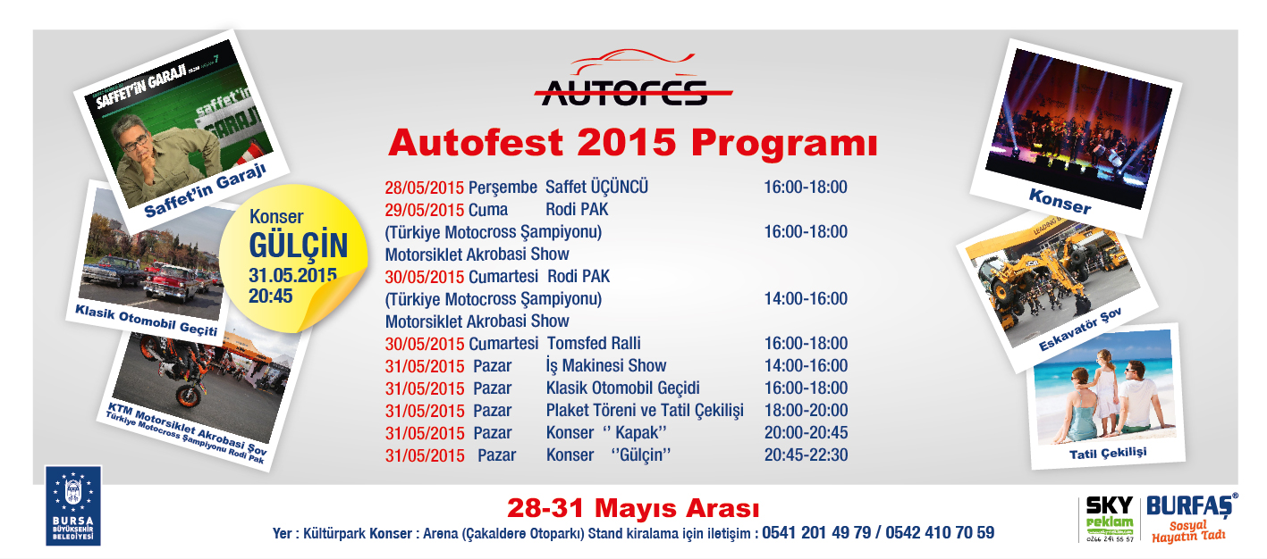 - Büyükşehir Belediyesi şirketlerinden BURFAŞ tarafından düzenlenen ‘Autofest 2015’, 28 – 31 Mayıs tarihleri arasında otomobil ve motosiklet tutkunlarını Kültürpark’ta buluşturuyor.