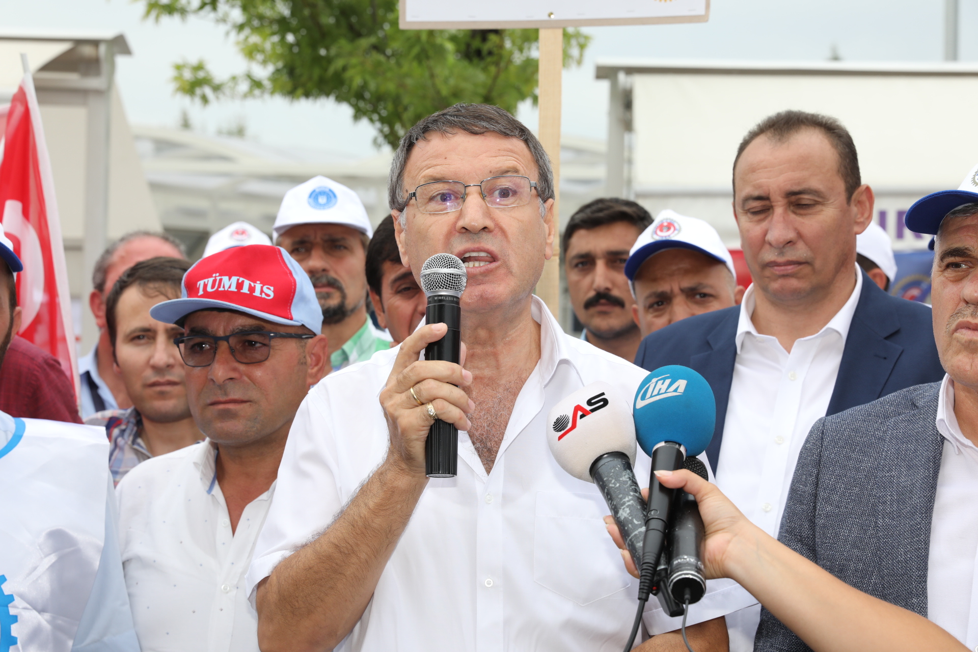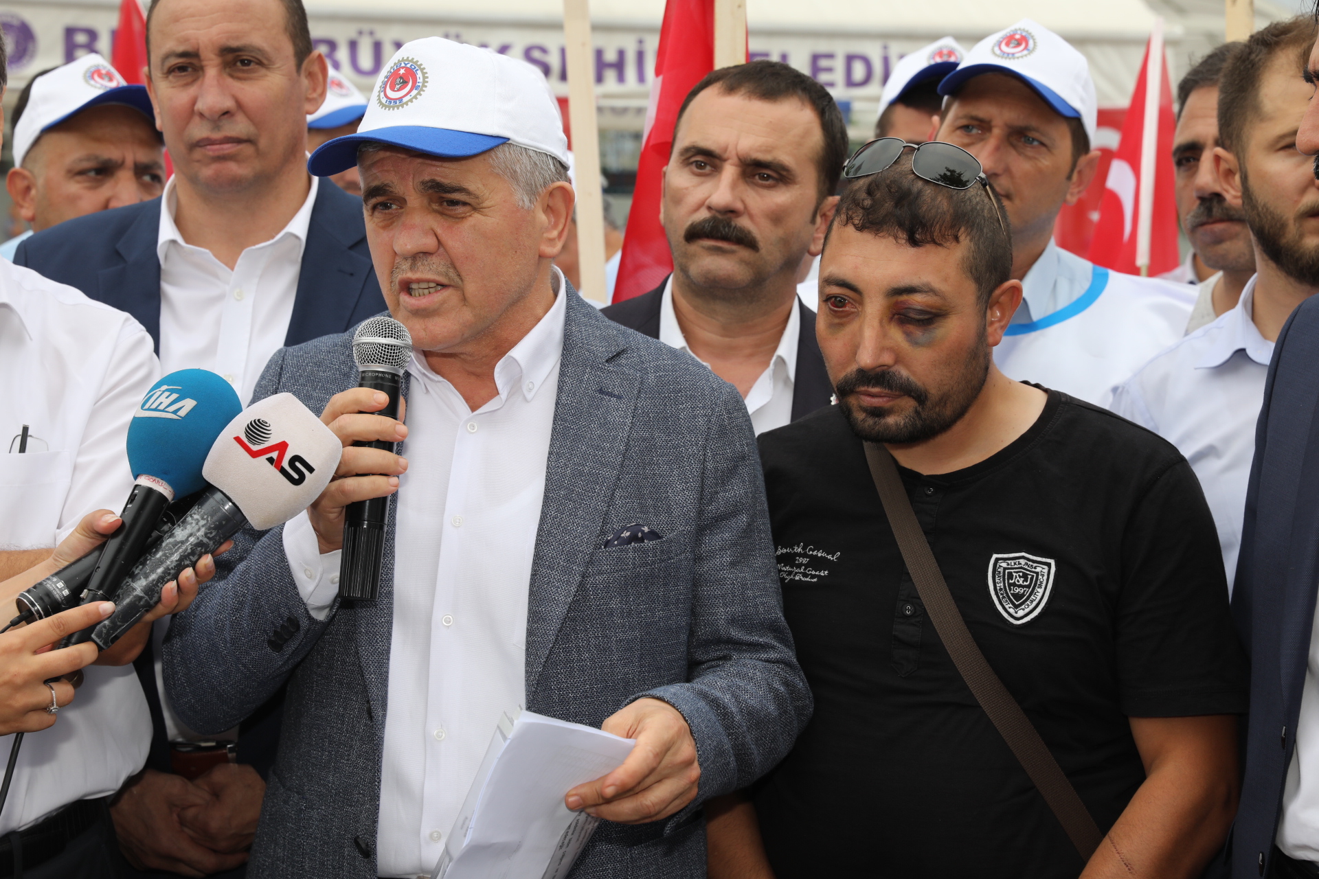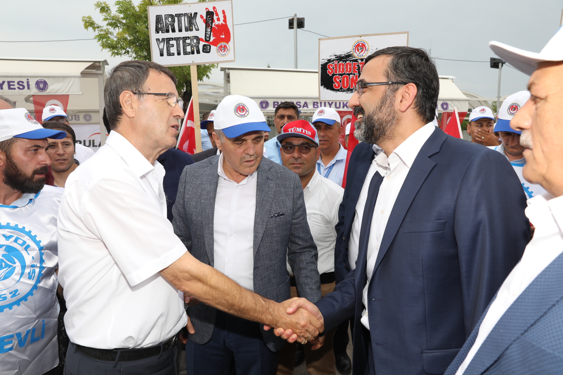 Türk-İş Bursa 8. Bölge Temsilcisi Sabri Özdemir de kamu görevi yapan insanlara karşı yapılan saldırıları şiddetle kınadı. Devletin bu tür olayları gerçekleştirenlere karşı harekete geçmesini isteyen Özdemir, Türkiye İşçi Sendikaları Konfederasyonu Genel Başkanı Ergün Atalay'ın mesajını okudu.