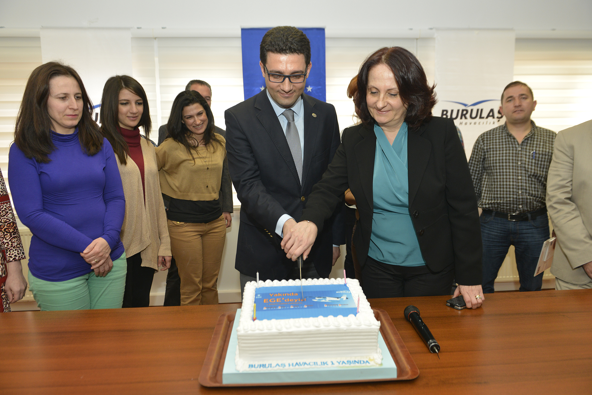 - BURULAŞ HAVACILIK’IN BİRİNCİ YAŞINI PASTA KESEREK KUTLAYAN BURULAŞ TİCARİ İŞLETMELER MÜDÜRÜ NİHAT CENKCİ İLE PAZARLAMA VE YOLCU İLİŞKİLERİ MÜDÜRÜ NUR KÖSE, YAKINDA BAŞLAYACAK İZMİR SEFERLERİ İLE HAVA ULAŞIM AĞININ DAHA DA GENİŞLEYECEĞİNİ SÖYLEDİ.