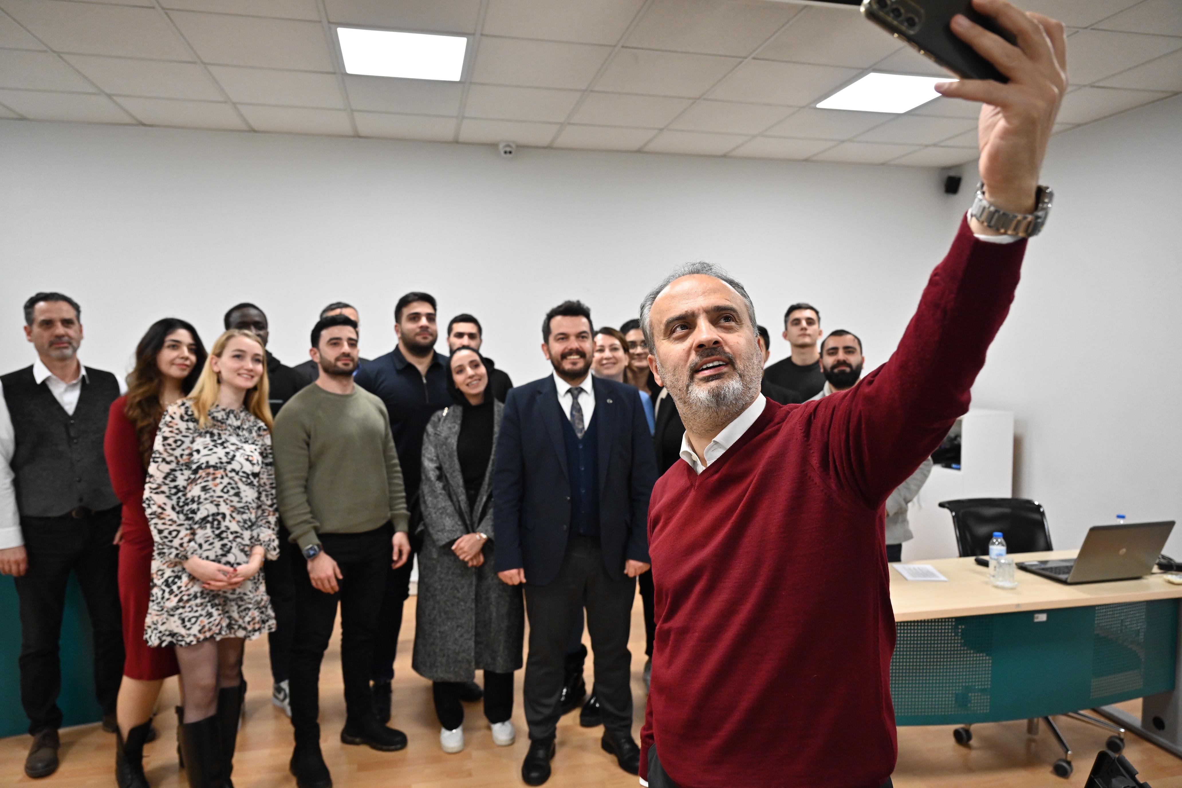 BURULAŞ yetkililerinin ulaşıma dair sunumları sonrasında gençlerle sohbet eden Başkan Aktaş, tecrübelerini paylaştığı bu organizasyon için moderatör Doç. Dr. Yüksel Okşak’a teşekkür etti.