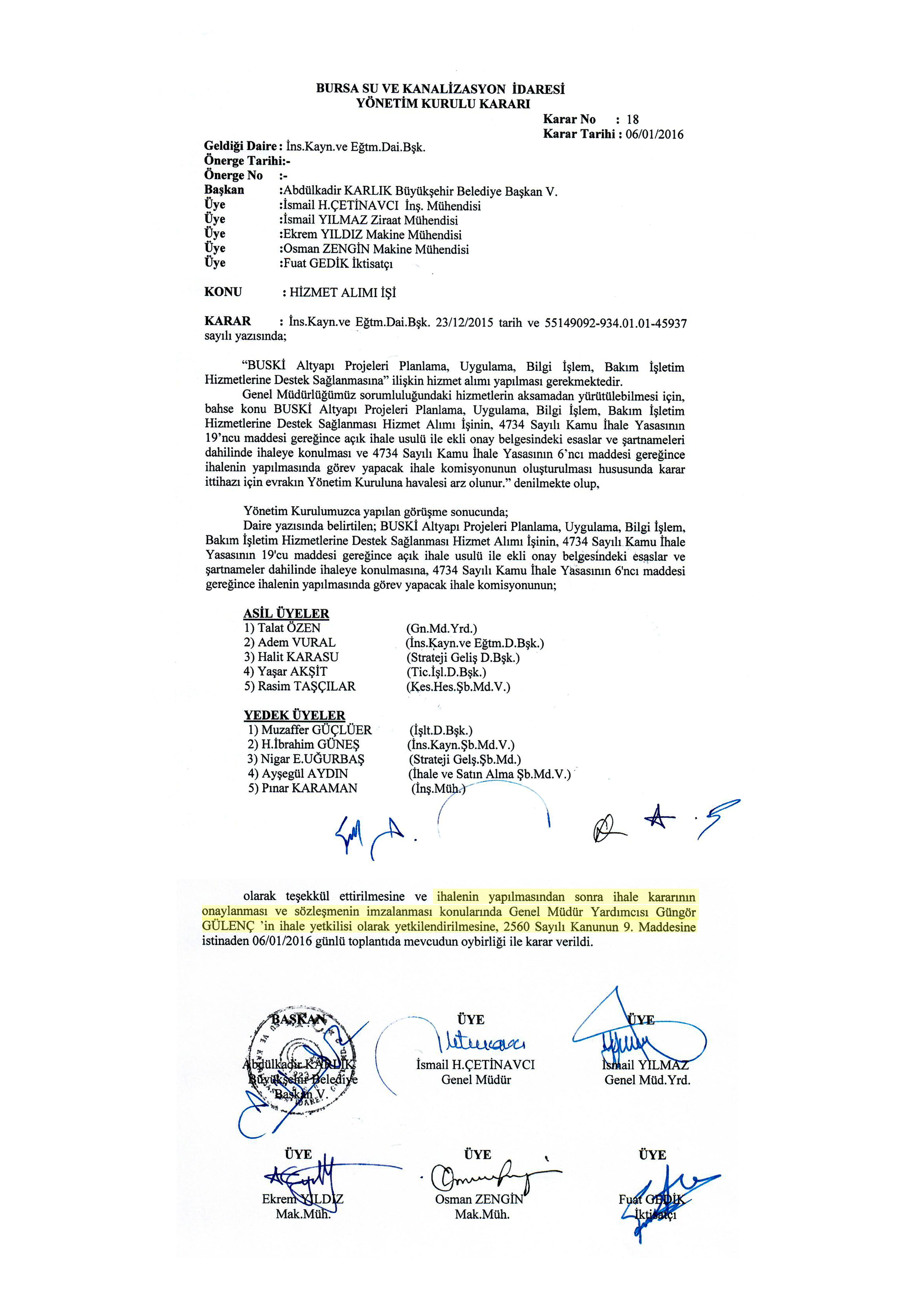 BUSKİ tarafından yapılan yazılı açıklamada; böylesi bir durumun, 4734 Sayılı Kamu İhale Kanunu’na göre mümkün olamayacağı, hizmet alımına konu olan ihalenin onaylanmasıyla ilgili onay makamındaki BUSKİ yöneticisinin, yetki devrini, o tarihte yönetim kurulu üyesi olmayan bir başka BUSKİ yöneticisine devrettiğine dikkat çekildi. Devir yetkisinin, BUSKİ Yönetim Kurulu’nun 06/01/2016 tarihli toplantısında karara bağlandığına işaret edilen açıklamada, “İhalenin yapılmasından sonra ihale kararının onaylanması ve sözleşmenin imzalanması konularında, onay makamındaki BUSKİ yöneticisinin, imza yetkisinin, Kurumun yönetim makamındaki bir başka yöneticiye, su ve kanalizasyon idarelerinin kuruluş ve görevleri hakkındaki esasların yer aldığı, 2560 Sayılı İstanbul Su ve Kanalizasyon İdaresi Genel Müdürlüğü Kuruluş ve Görevleri Hakkındaki Kanun’un 9. maddesine istinaden oybirliği ile alındığı hususunu önemle belirtiriz. Bu bağlamda, ihale onay yetkisi, imza makamındaki BUSKİ yöneticisinden bir başka BUSKİ yöneticisine, BUSKİ Yönetim Kurulu’nun kararı doğrultusunda devredilmiştir” denildi.