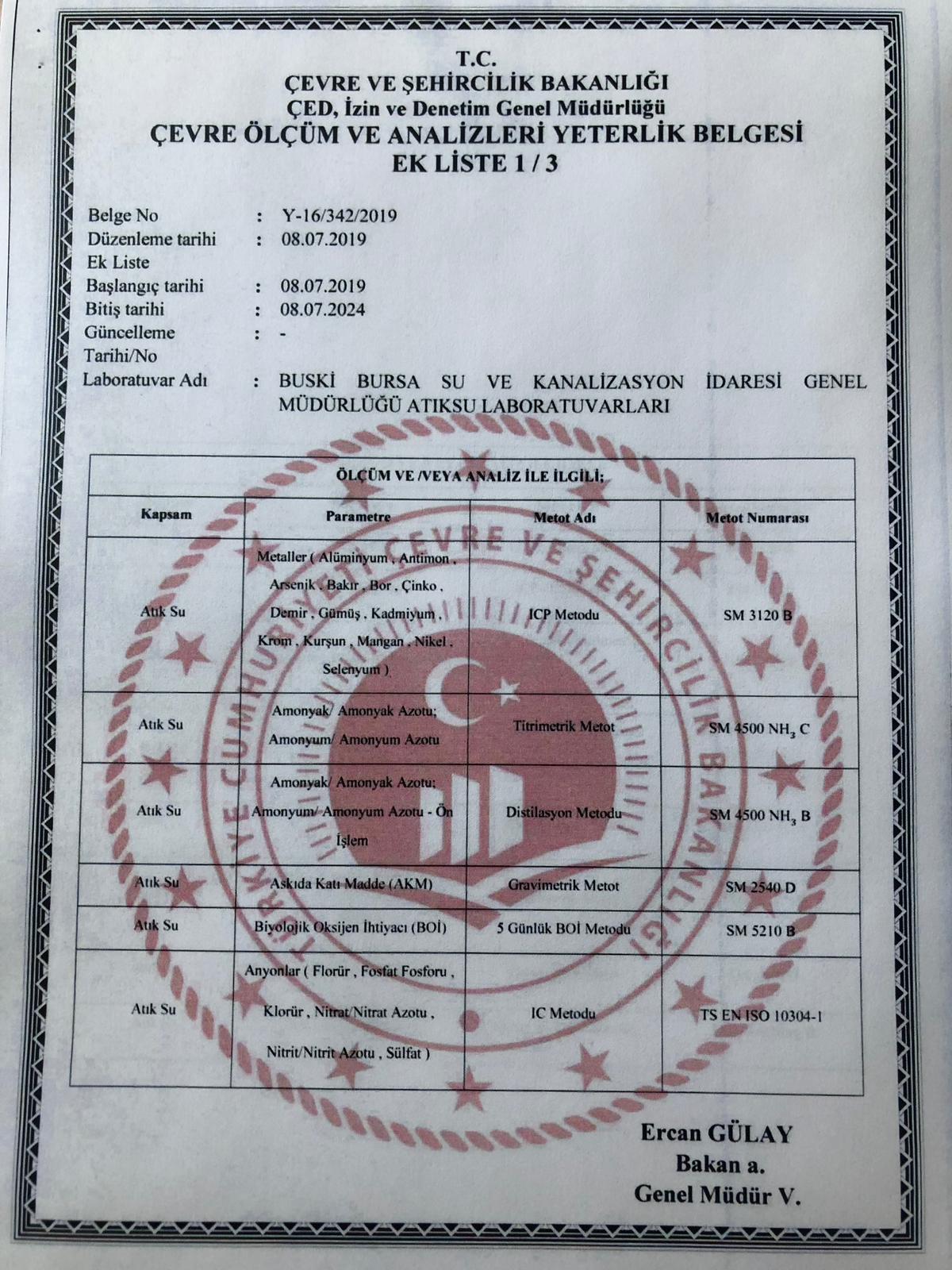 BUSKİ atıksu laboratuvarları son olarak Çevre ve Şehircilik Bakanlığı tarafından 8 Temmuz 2019 tarihi itibariyle 17 metotta 36 parametre ve 1 atık sulardan numune alımında ‘Çevre Ölçüm ve Analizleri Yeterlik Belgesi’ni almaya hak kazandı.
